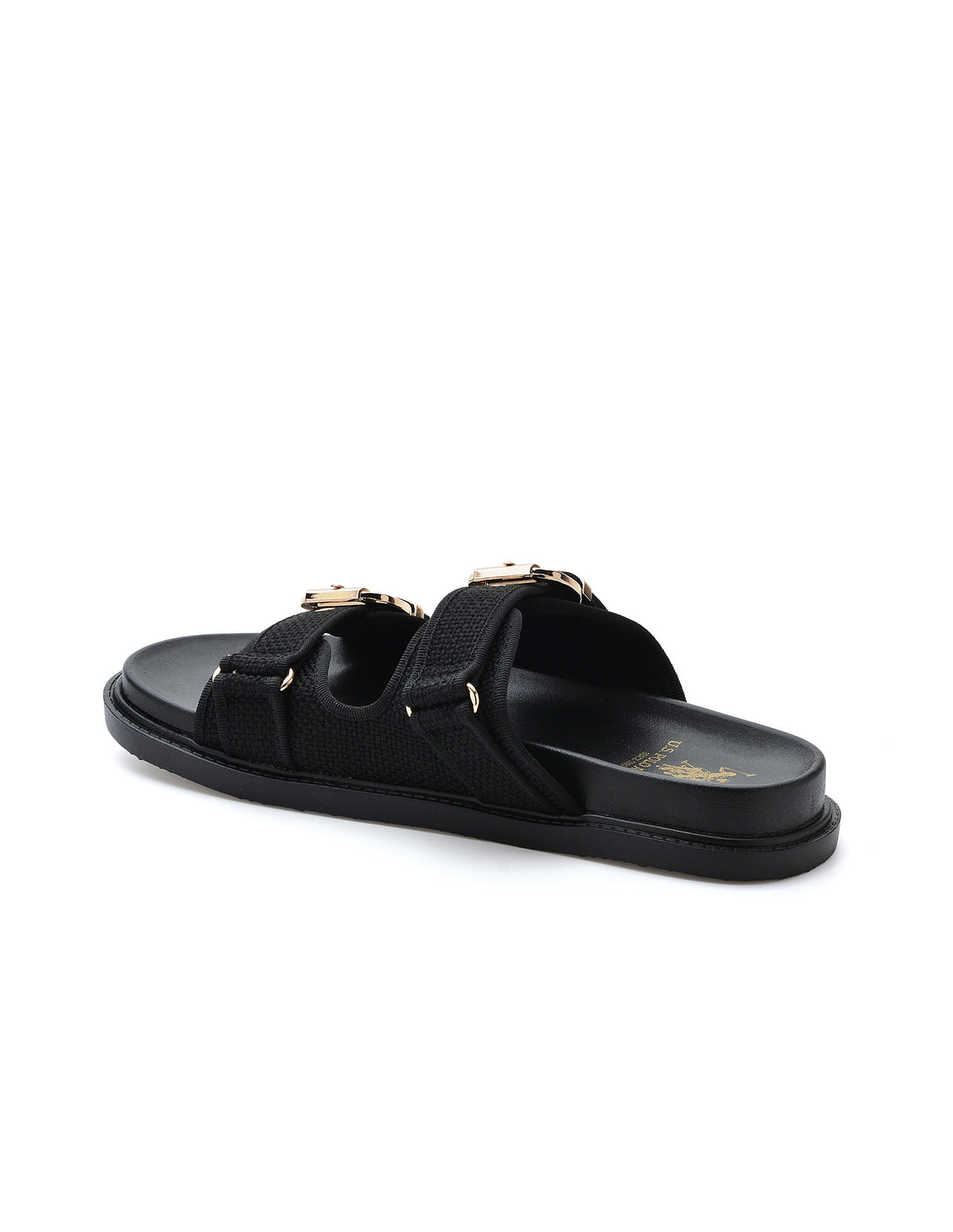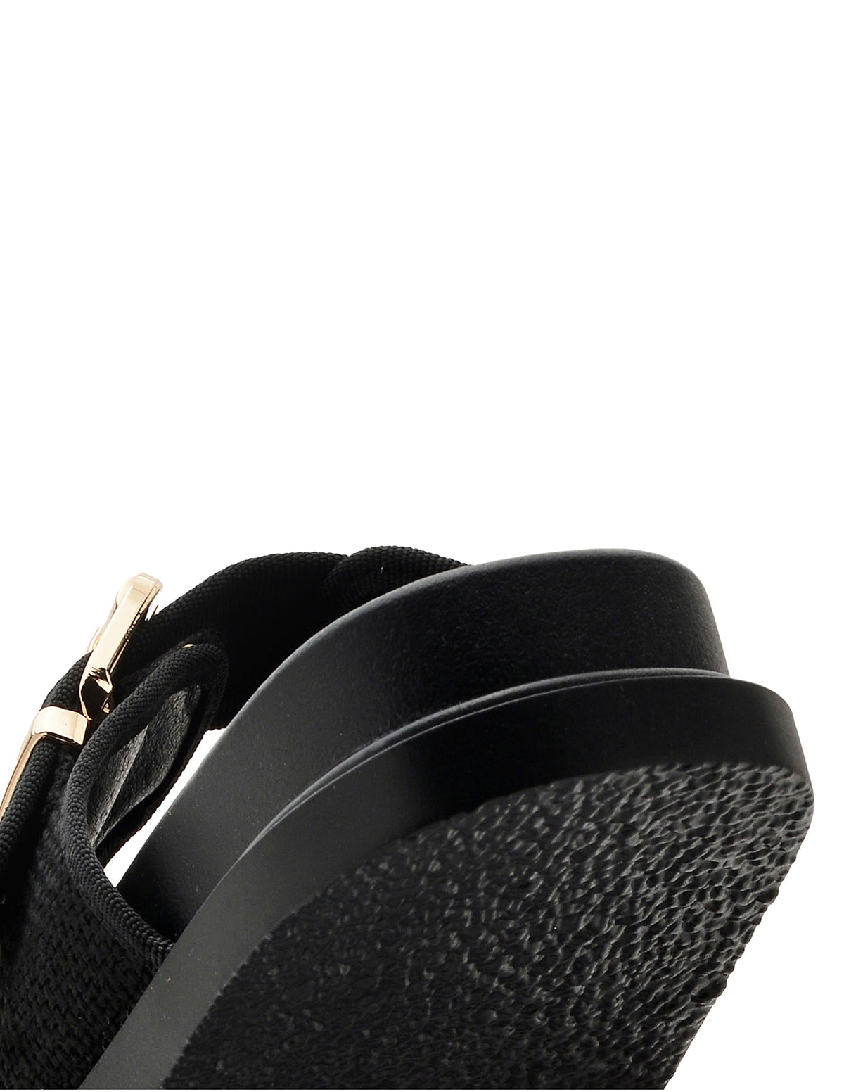 | Open toe | Double strap with adjustable buckle closure across vamp | Ankle strap with elasticized gusset | Cushioned footbed | Textured outsole