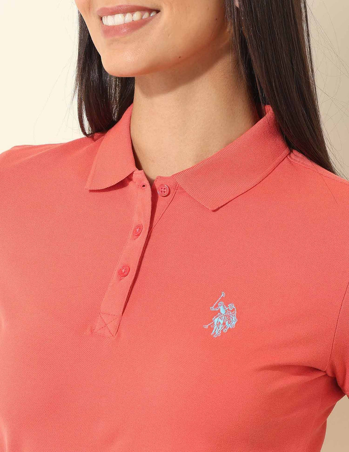 | Polo collar | Logo at chest | Short button placket | Short sleeves | Ribbed collar and sleeve hems | Vented hem | Solid pattern | Regular fit |
