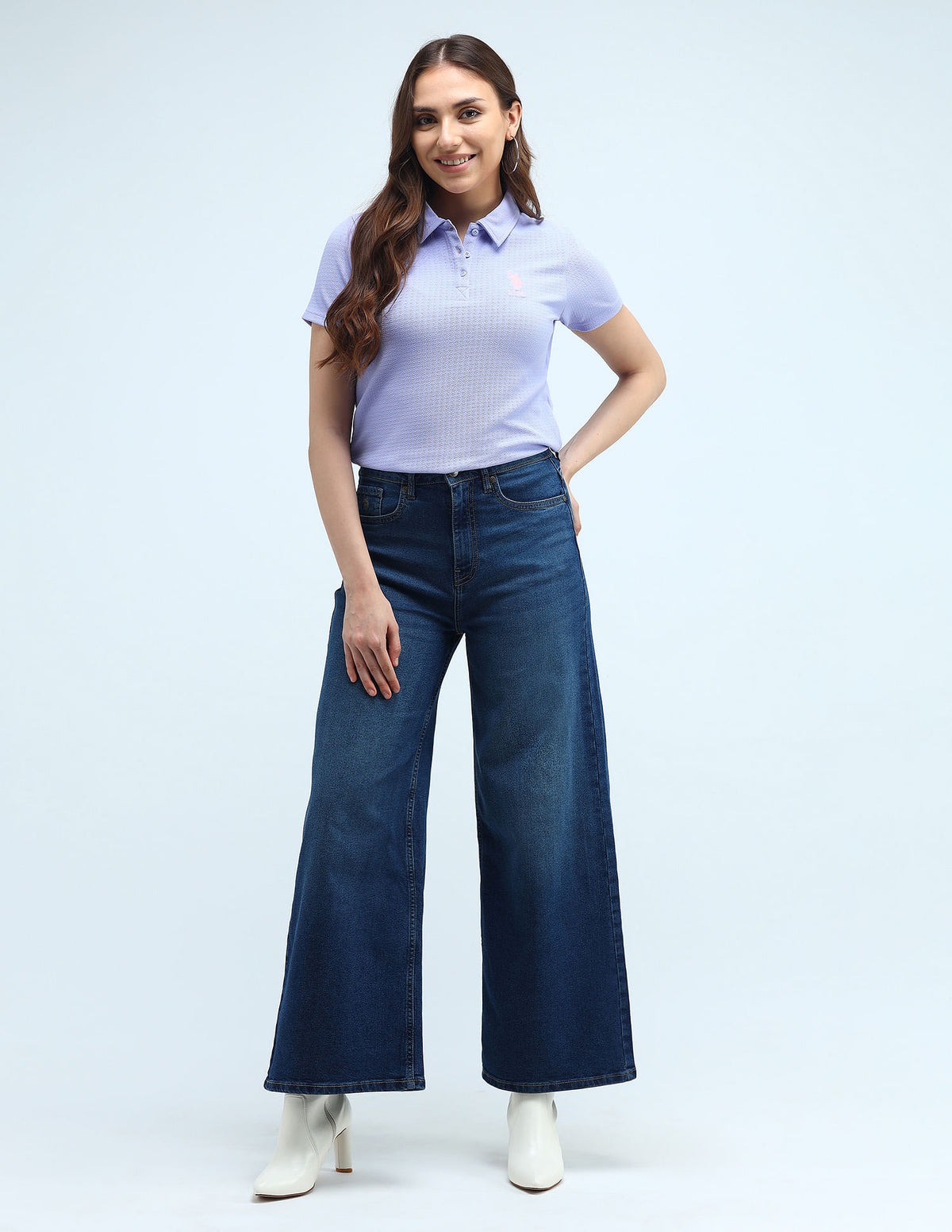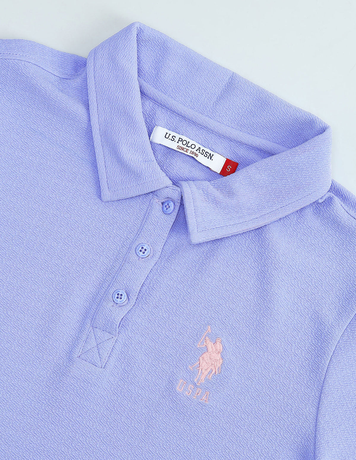 | Polo collar | Embroidered logo at chest | Short button placket | Short sleeves | Ribbed collar and sleeve hems | Vented hem | Textured patterned knit | Regular fit