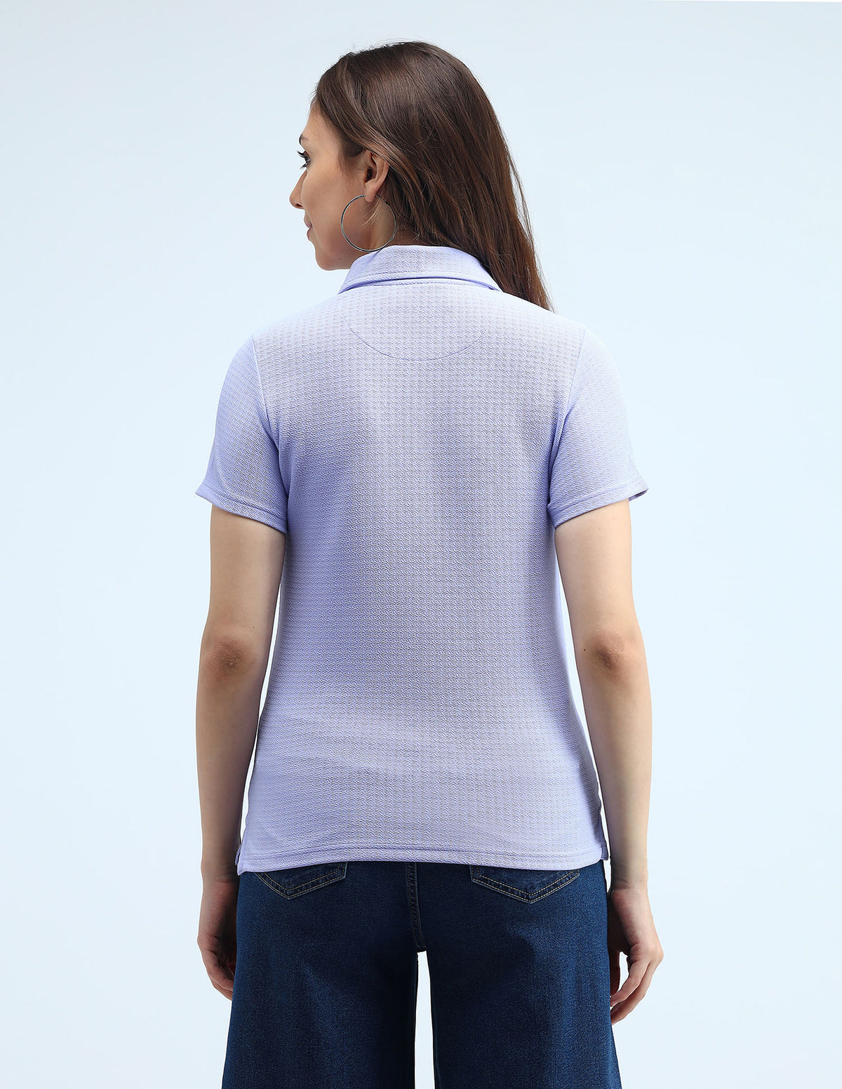 Story: Transform your wardrobe with this impressive short-sleeve polo collar tee showcasing a contrast logo on the chest, a short button placket, and a textured pattern.