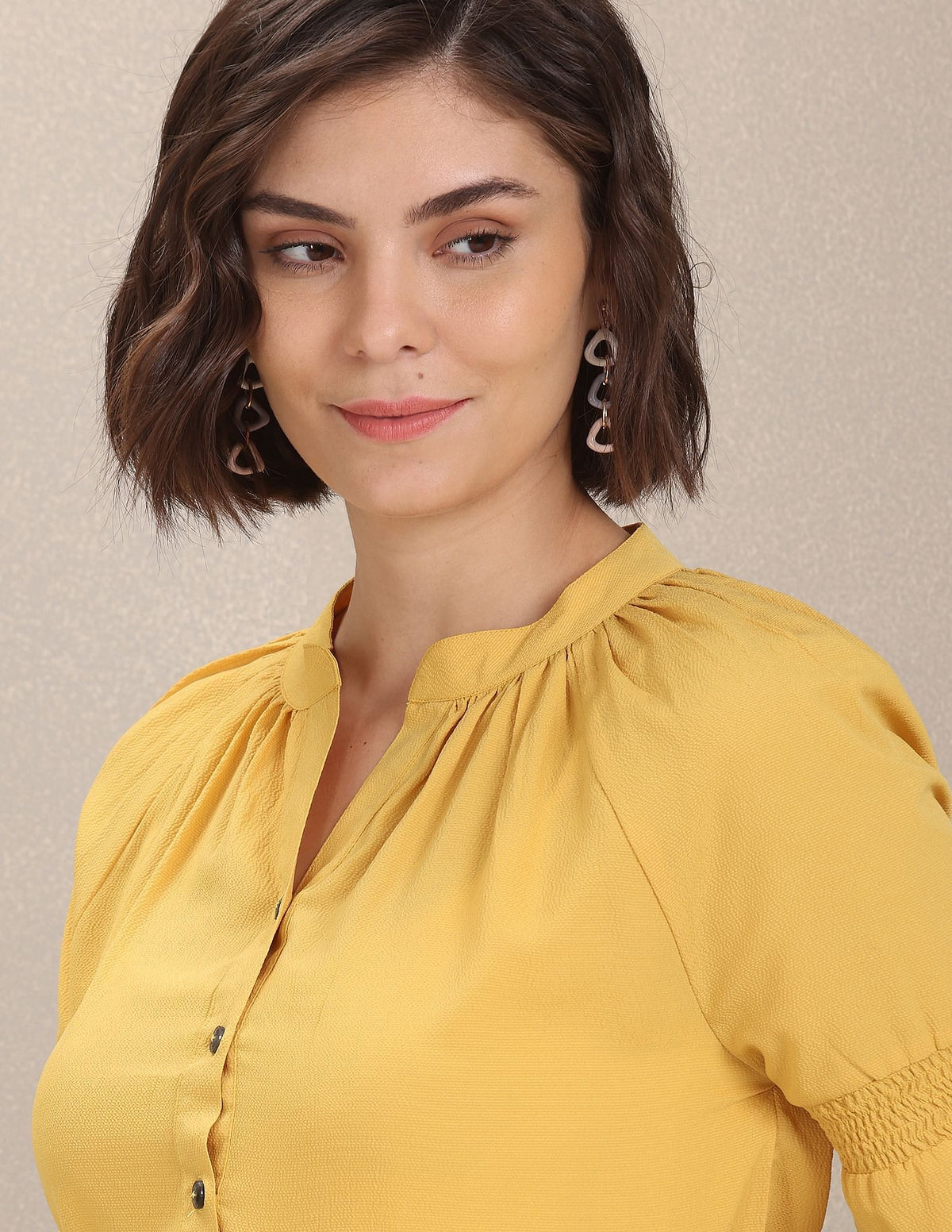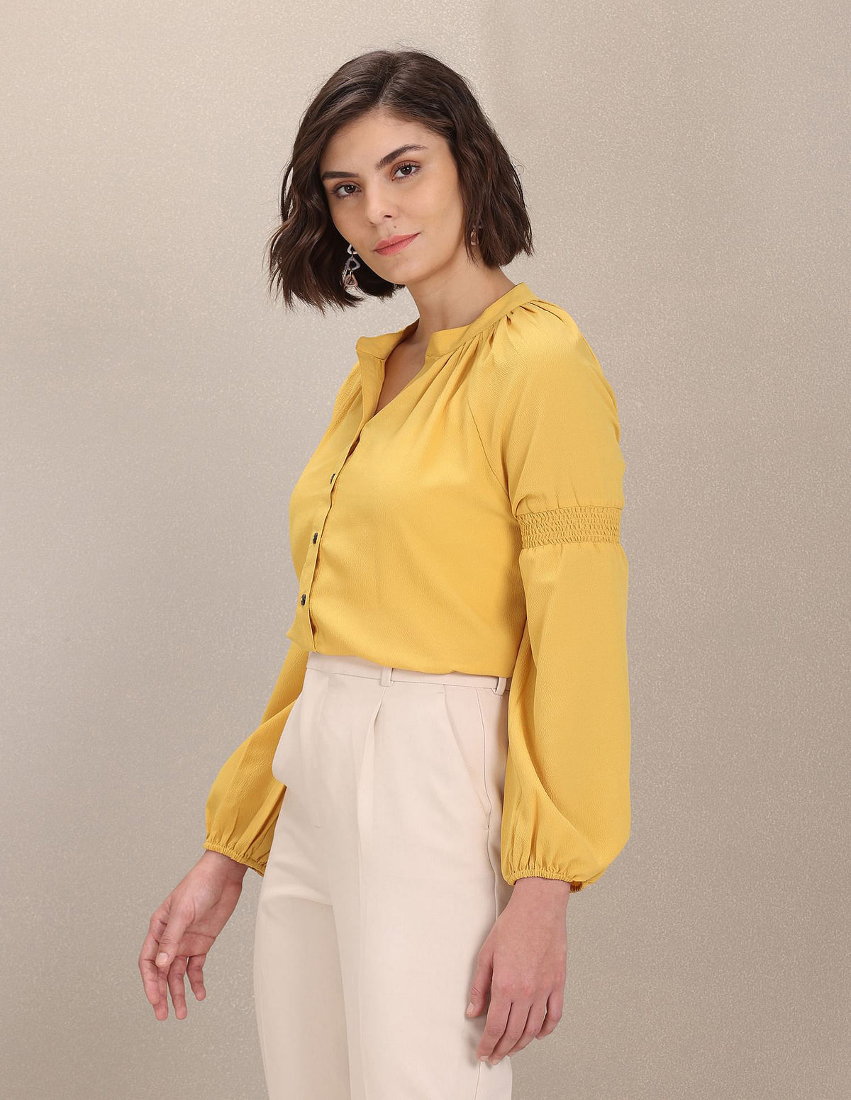 Story: Bolster your casual roster with this blended top with a mandarin collar and long sleeves.