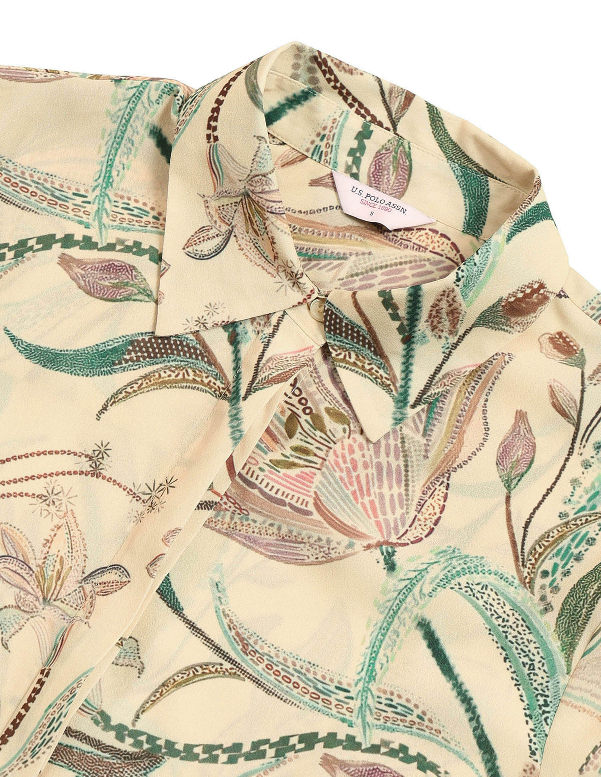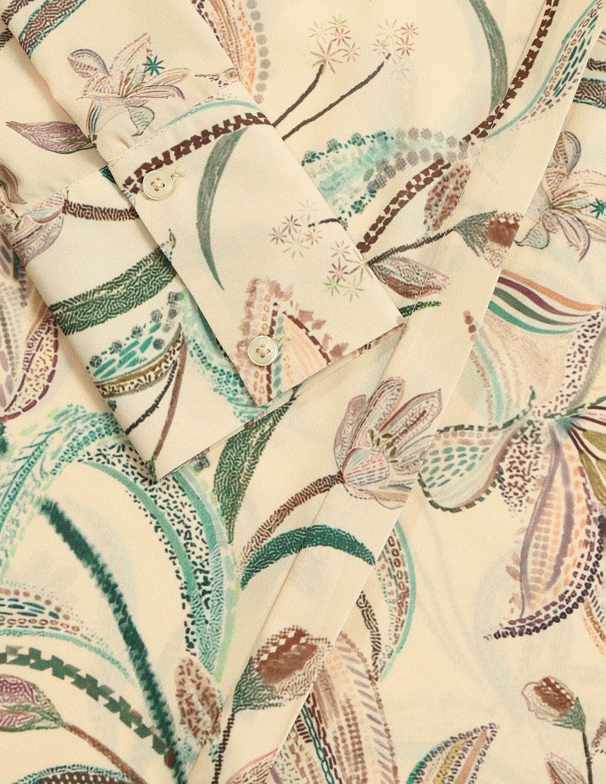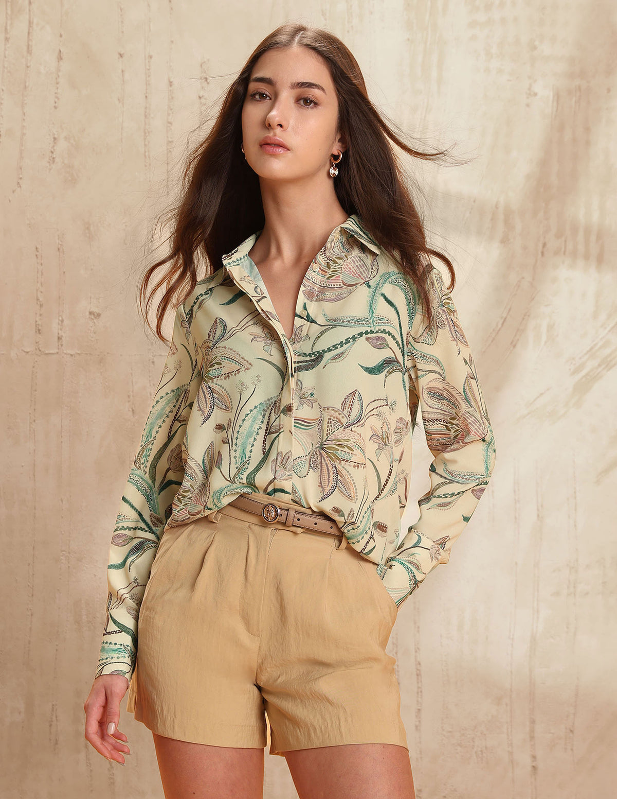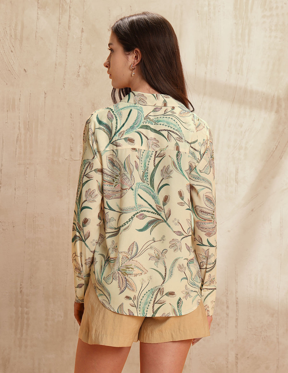 | Spread collar | Full button placket | Long sleeves with barrel cuffs | Curved hemline | Floral printed pattern | Regular weave | Regular fit |