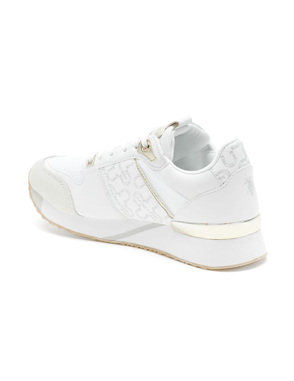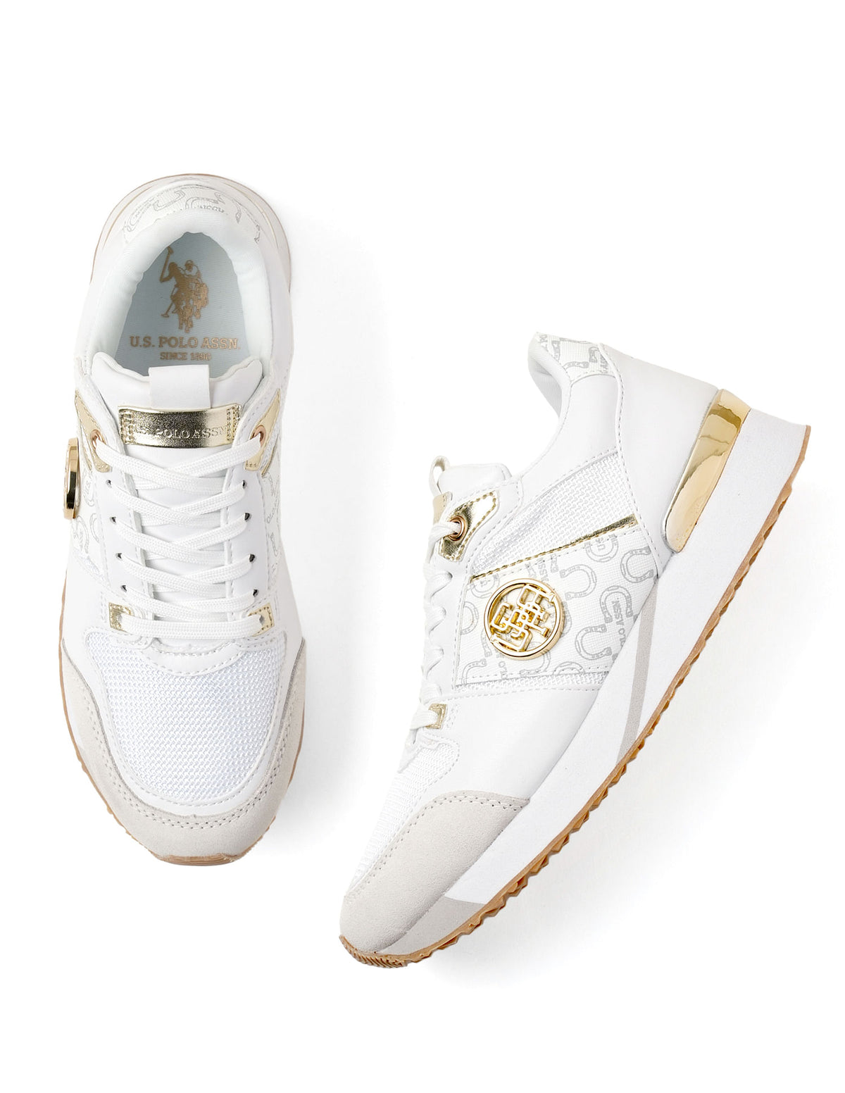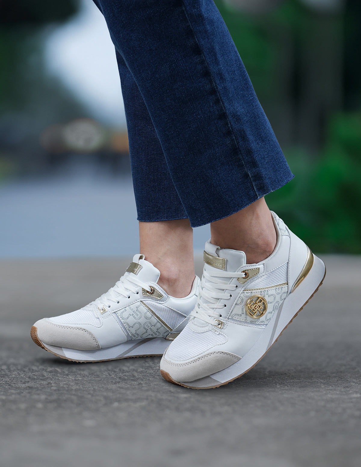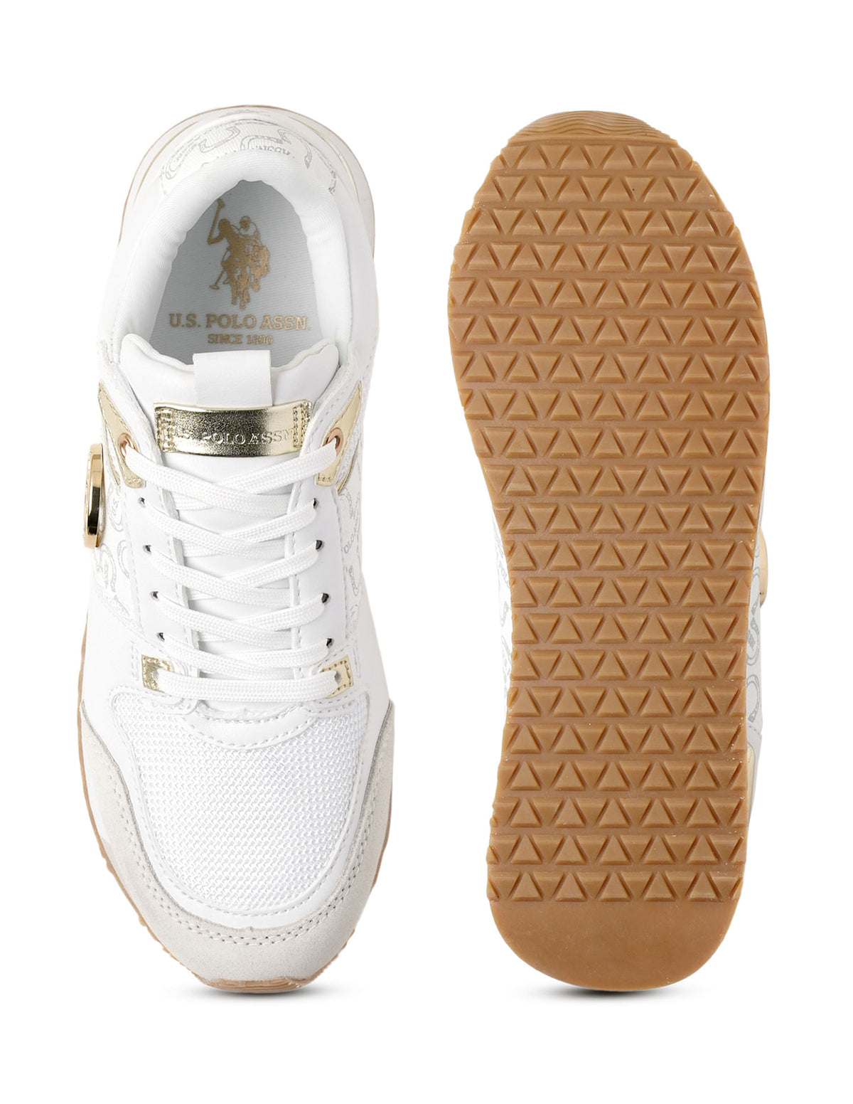 Story: Keep your feet cool and look neat with these classy sneakers, featuring a round toe and metallic logo.