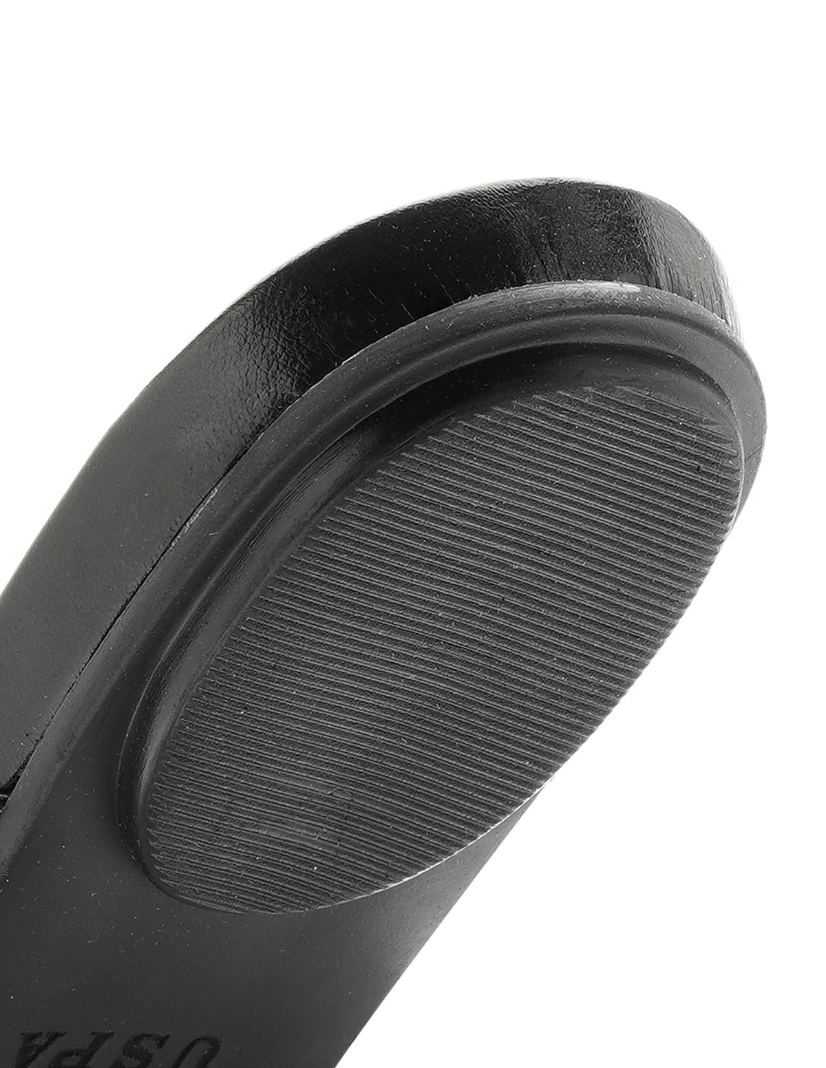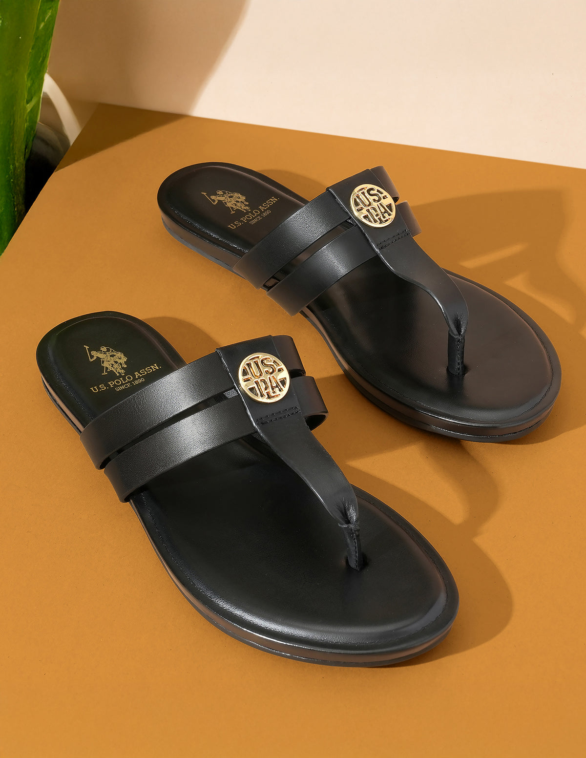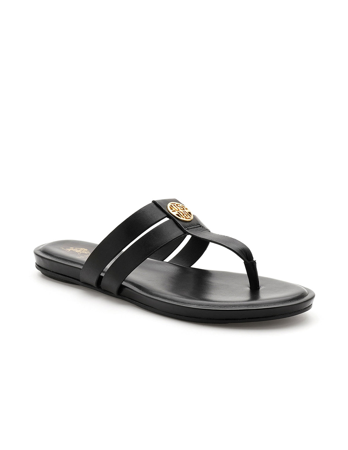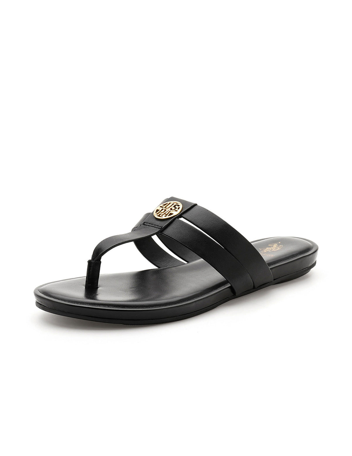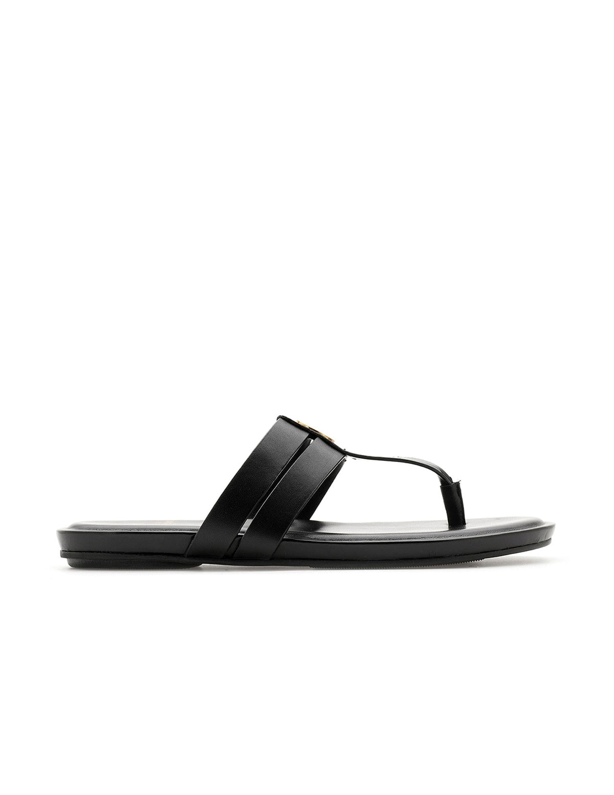 | Toe separator | Vamp strap with brand metallic accent | Cushion footbed with branding | Striped outsole | Solid pattern |