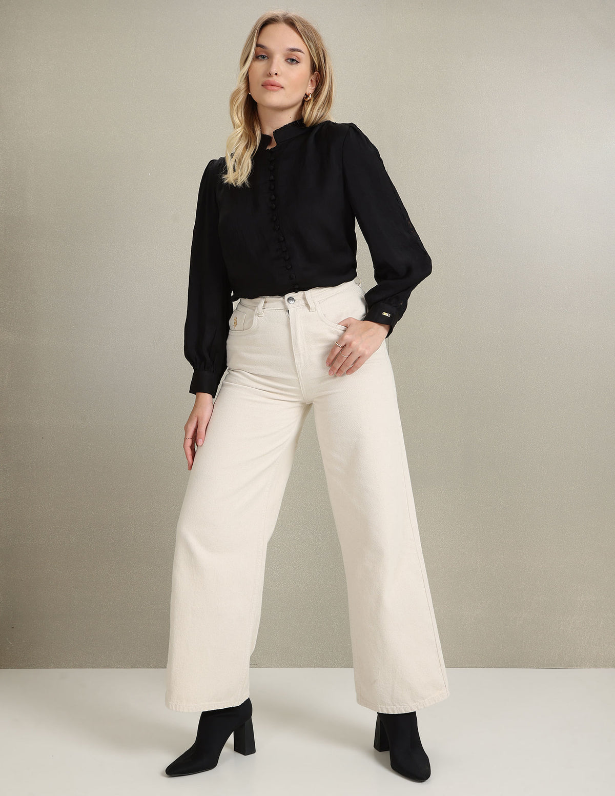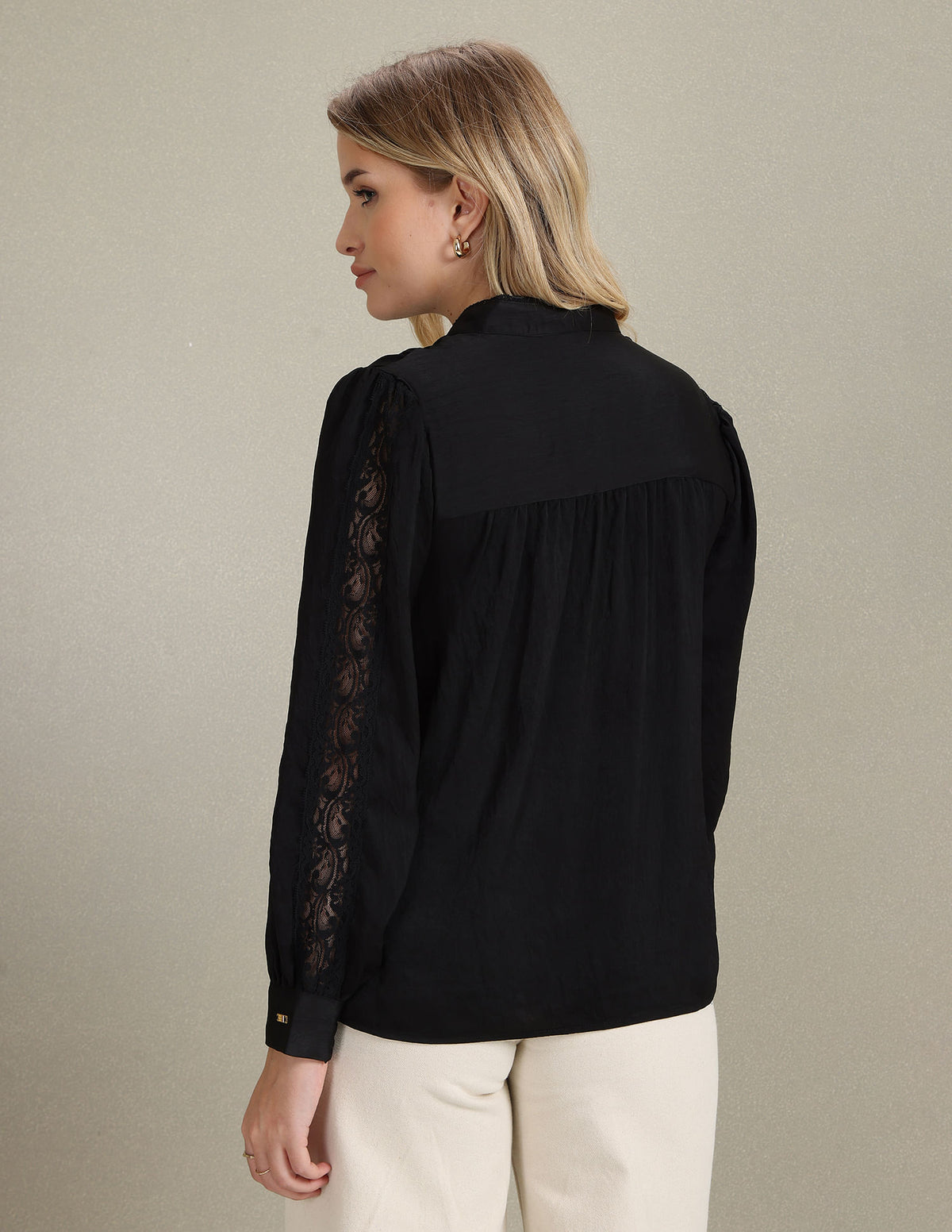 - Long sleeves with barrel cuffs and lace detail
