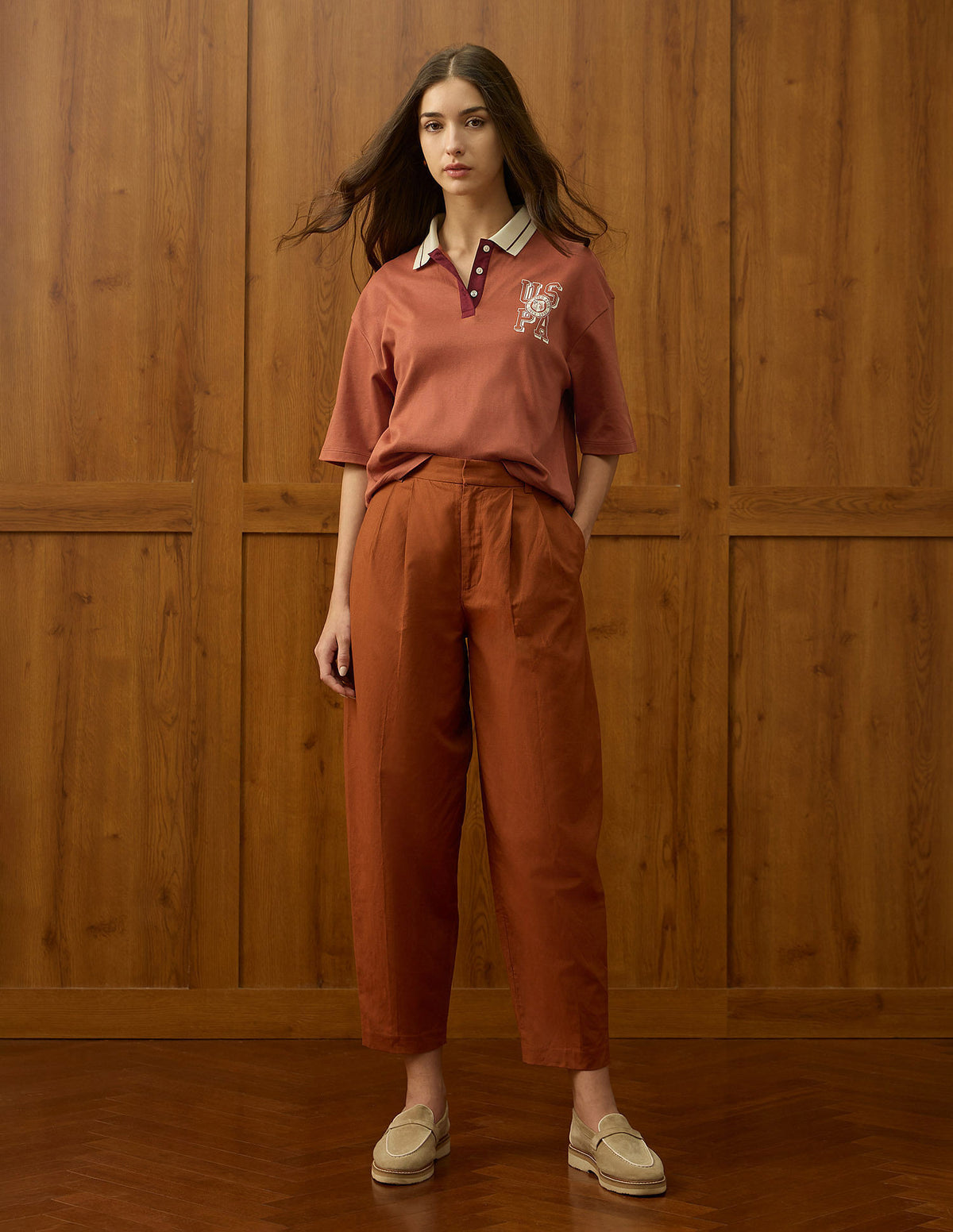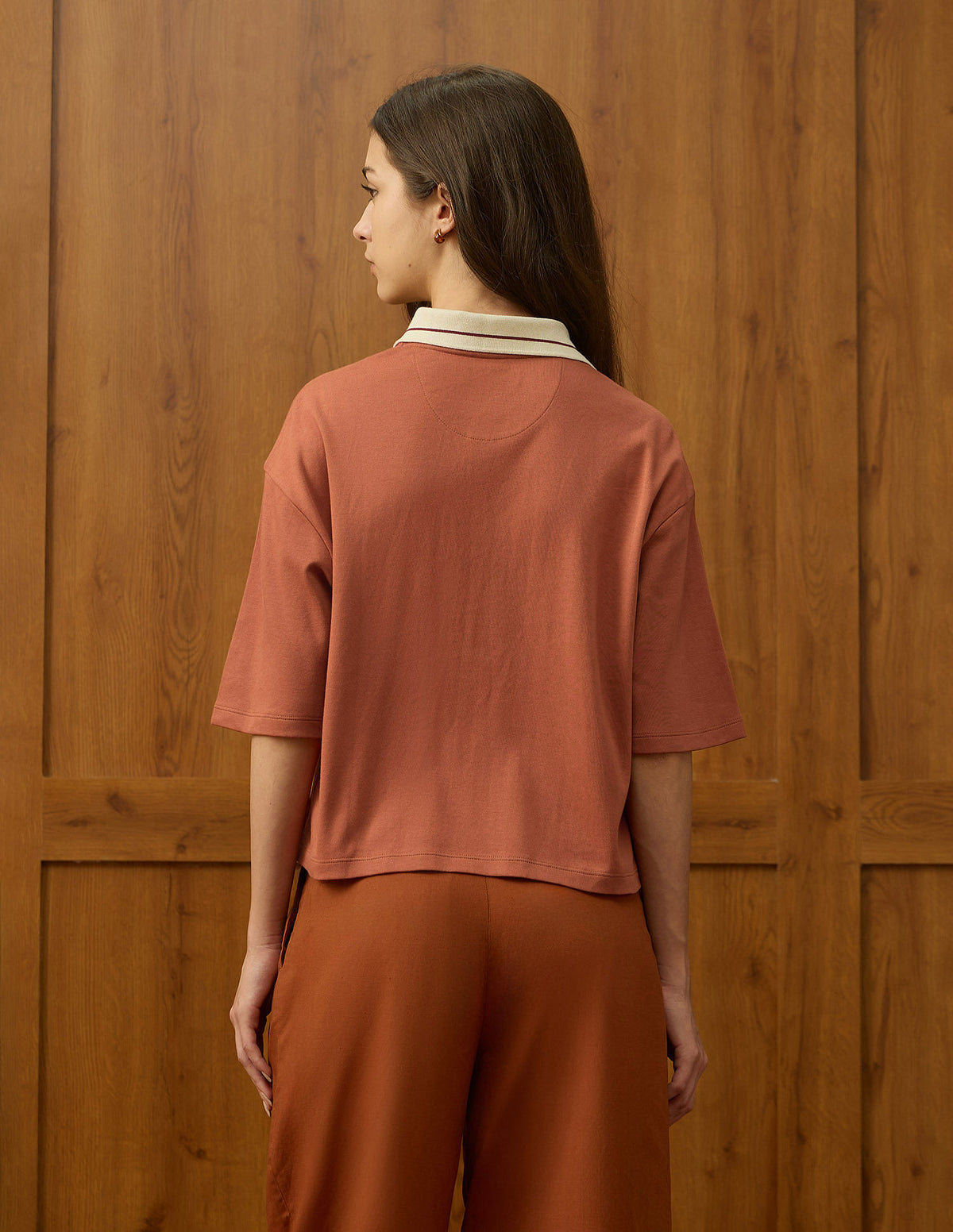 | Polo collar | Logo at chest | Short button placket | Short sleeves | Uneven vented hem | Solid pattern | Pique knit | Oversized fit |