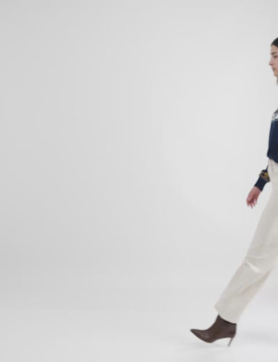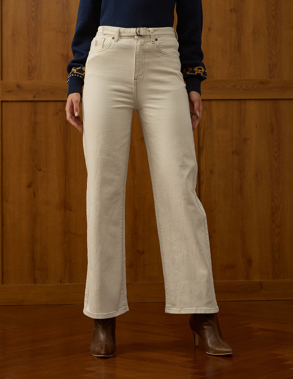 | High-rise waist | Button and zip fly closure | Five pockets | Denim weave | Wide leg fit |