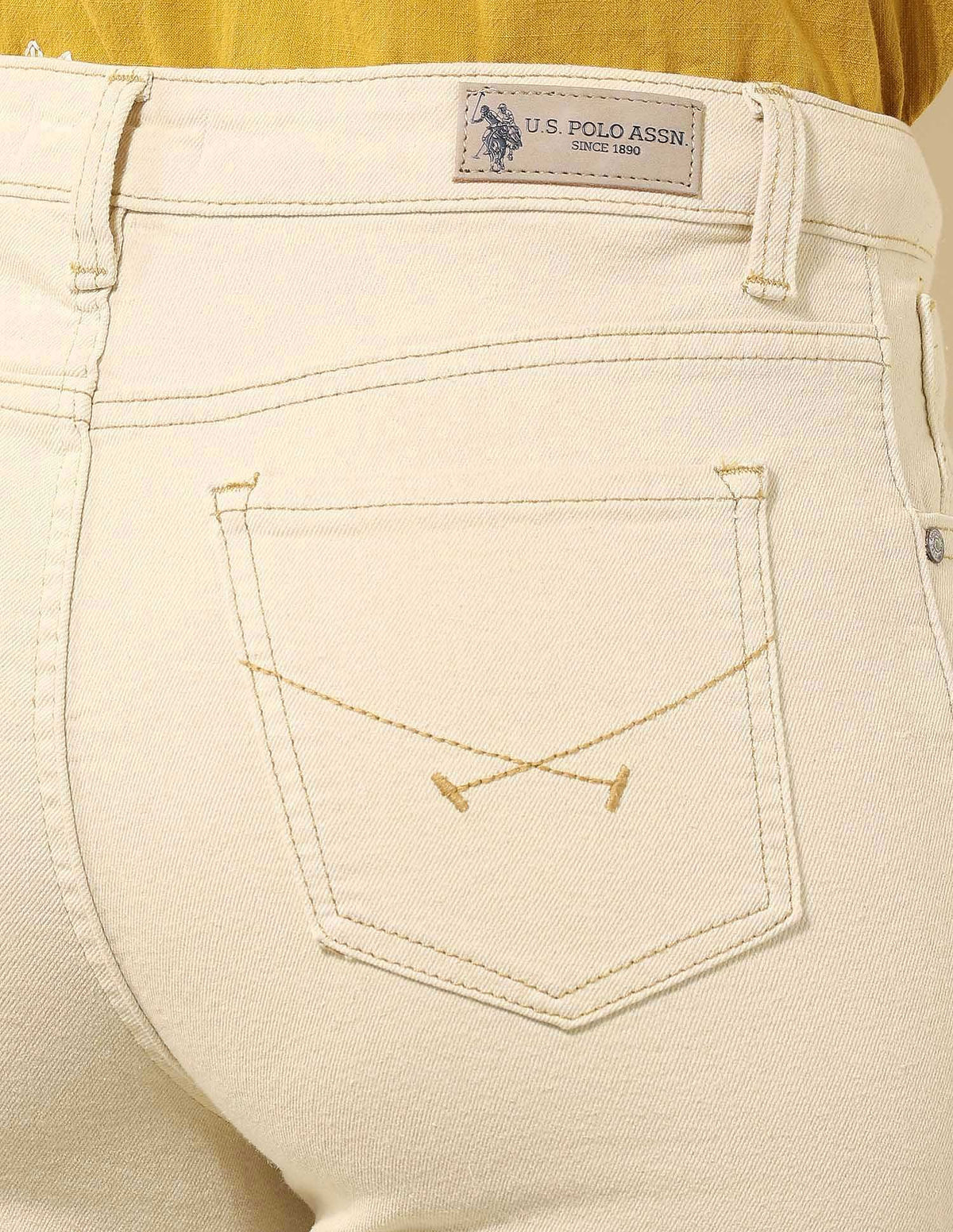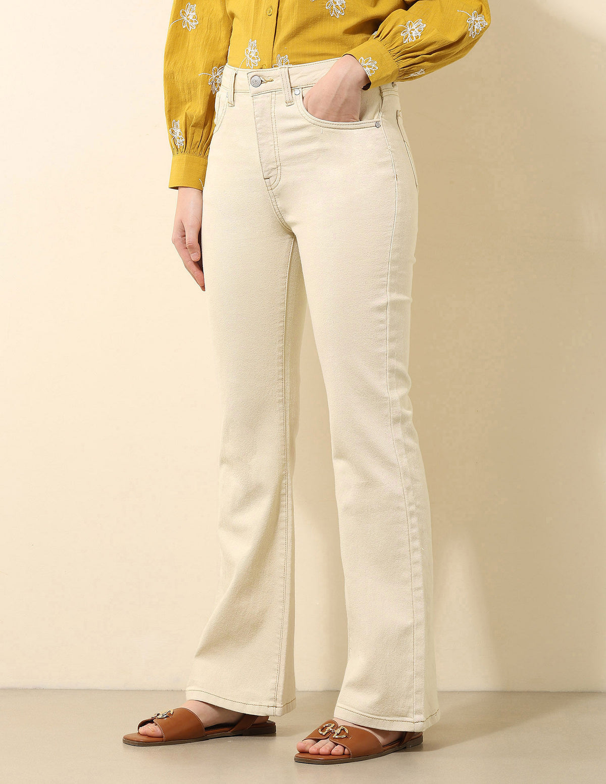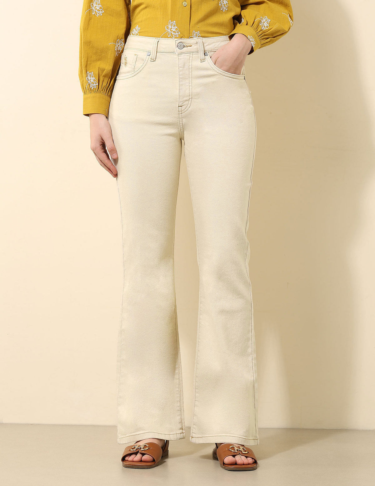 | High-rise waist | Button and zip fly closure | Five pockets | Denim weave | Flared fit |