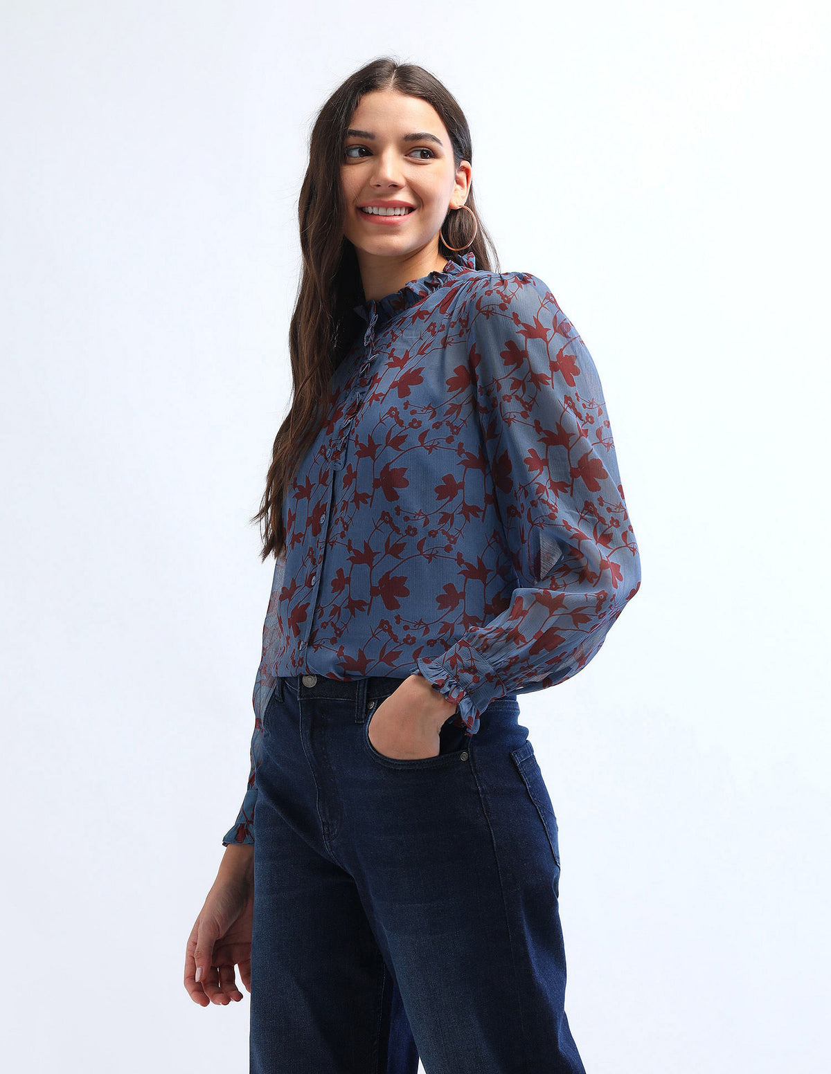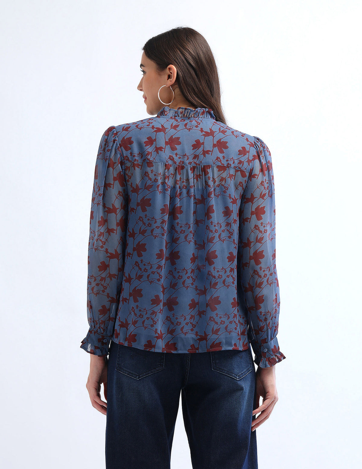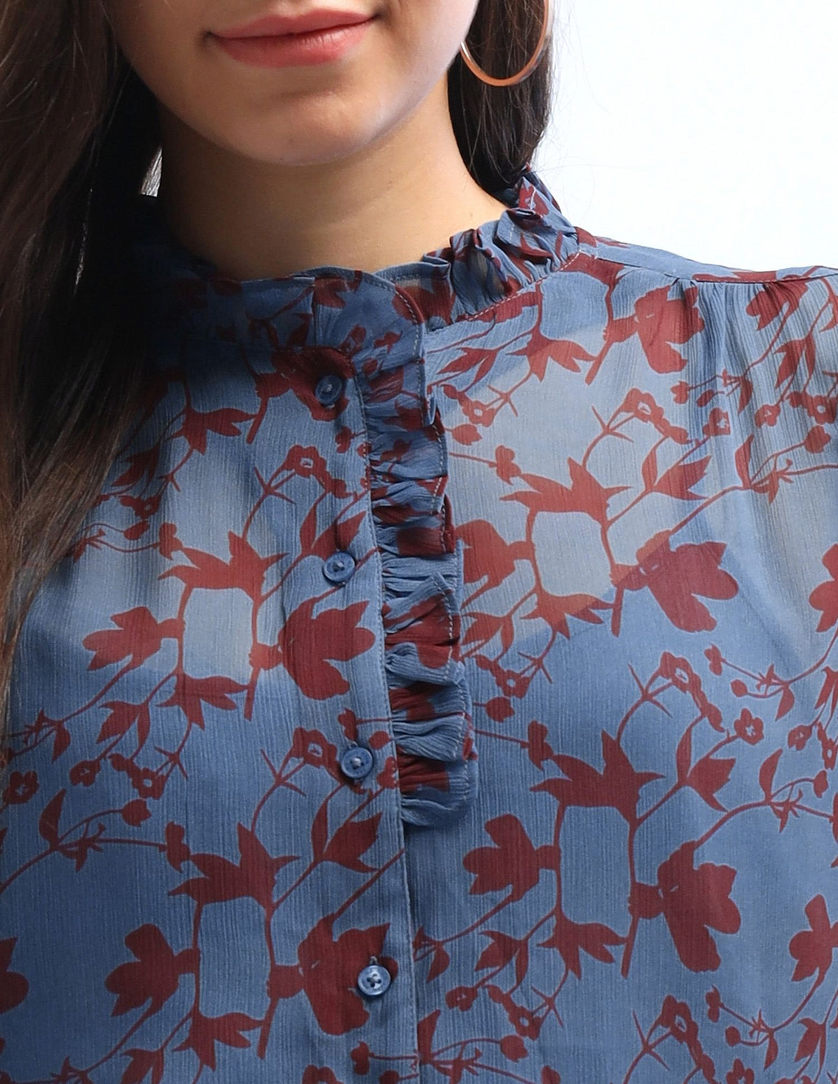 | Ruffled neck | Ruffled near placket | Full button closure | Long sleeves with ruffled hems | Straight hemline | ll-over printed pattern | Woven | Regular fit |