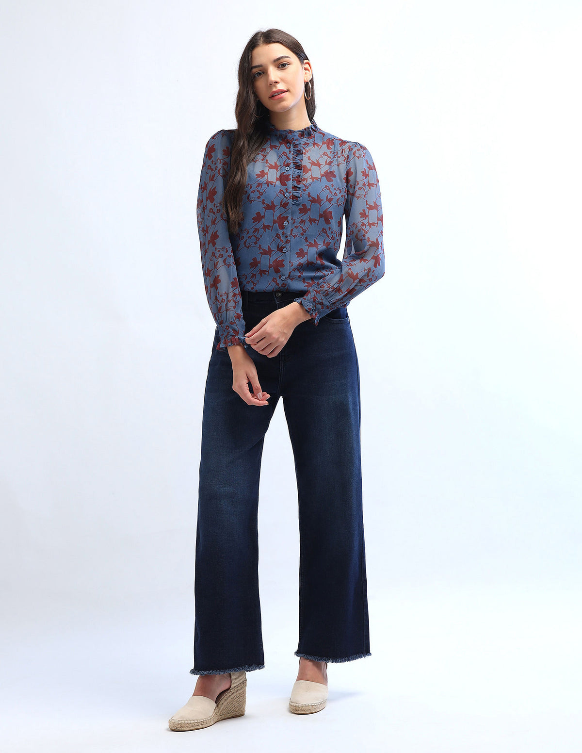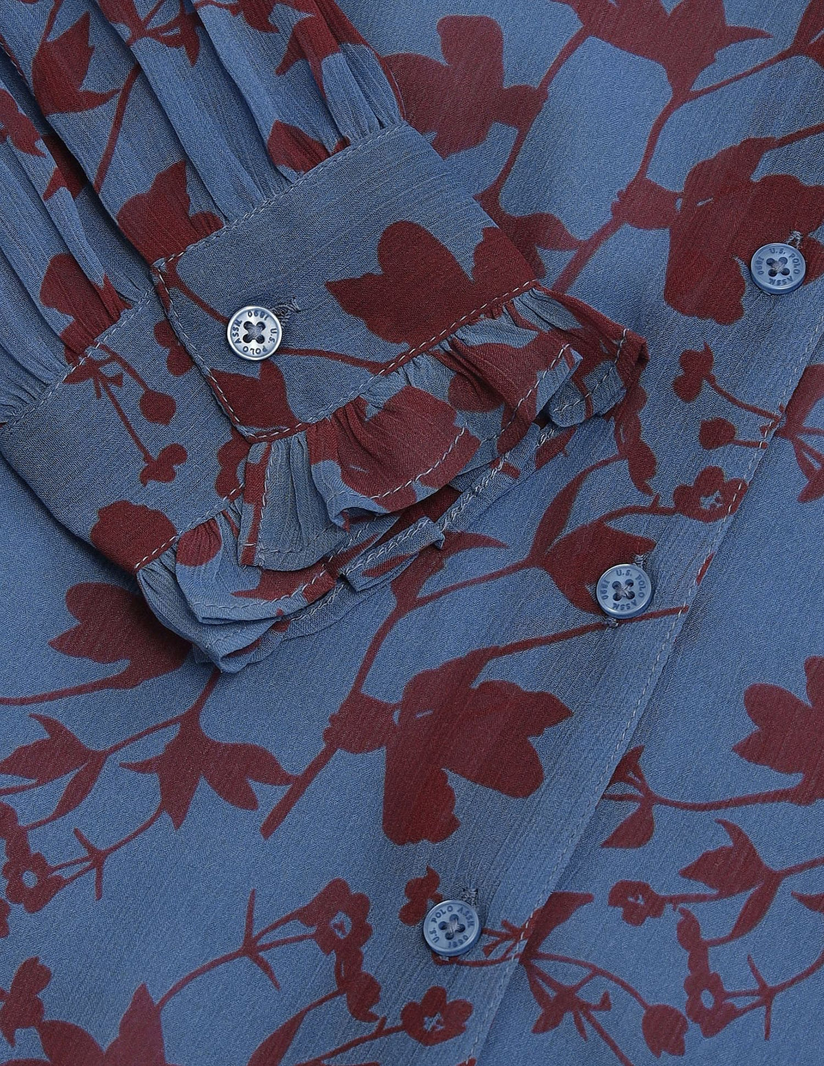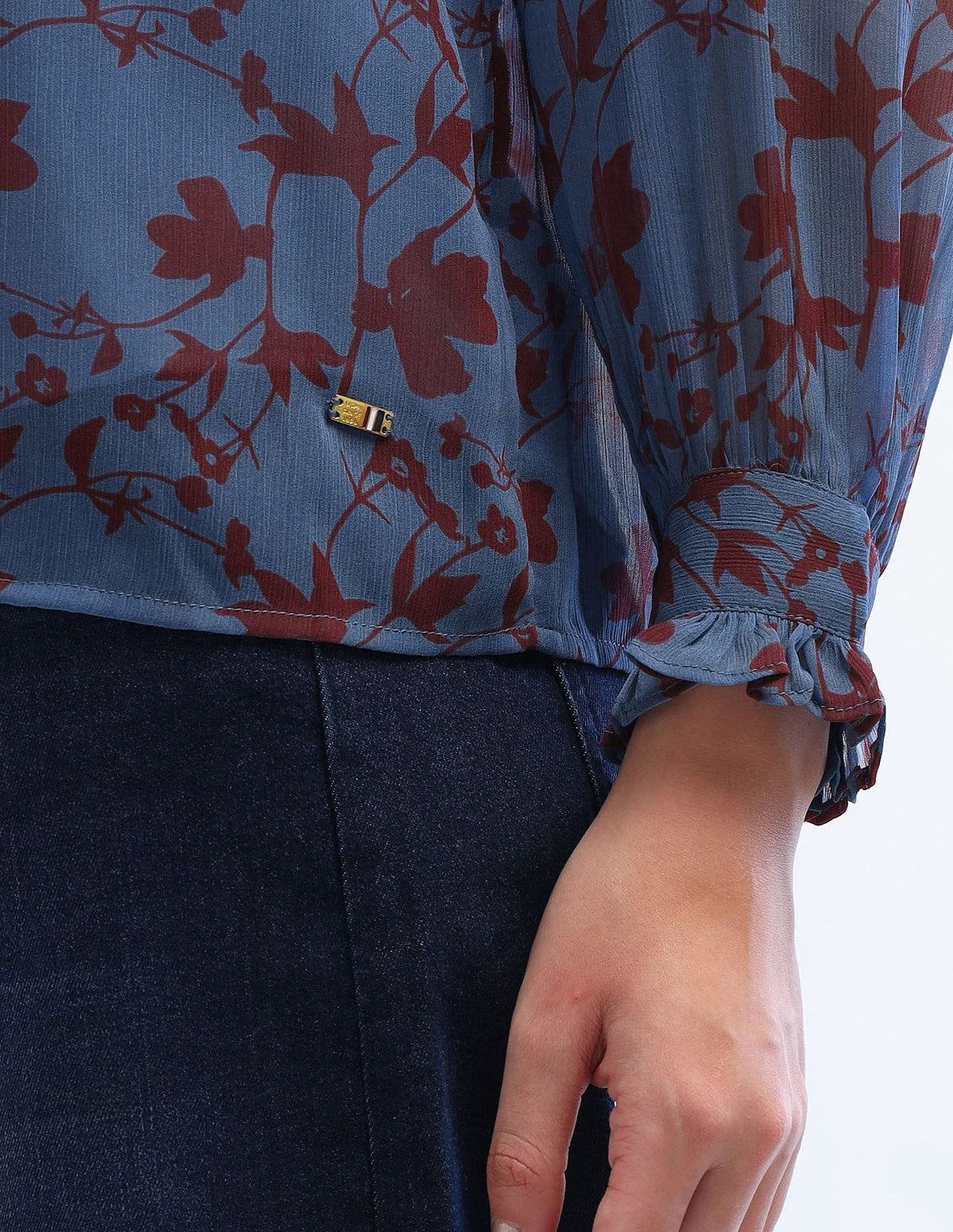 | Ruffled neck | Ruffled near placket | Full button closure | Long sleeves with ruffled hems | Straight hemline | ll-over printed pattern | Woven | Regular fit |