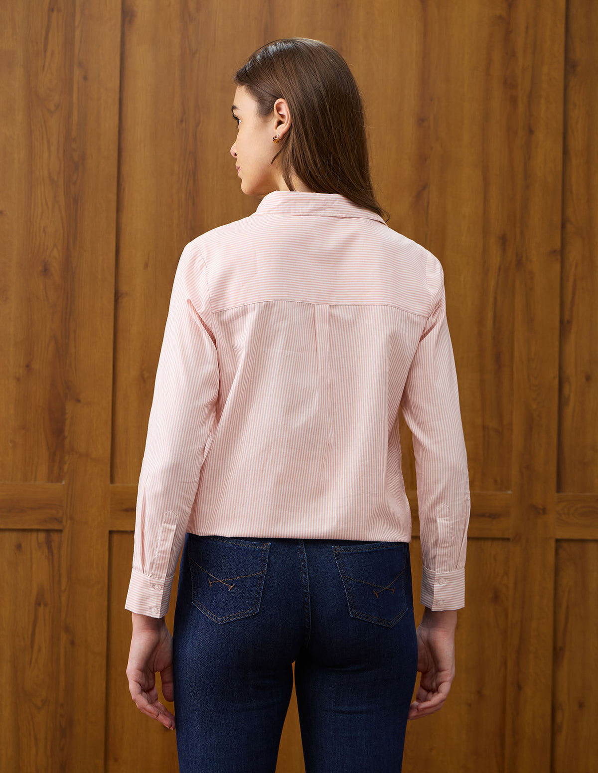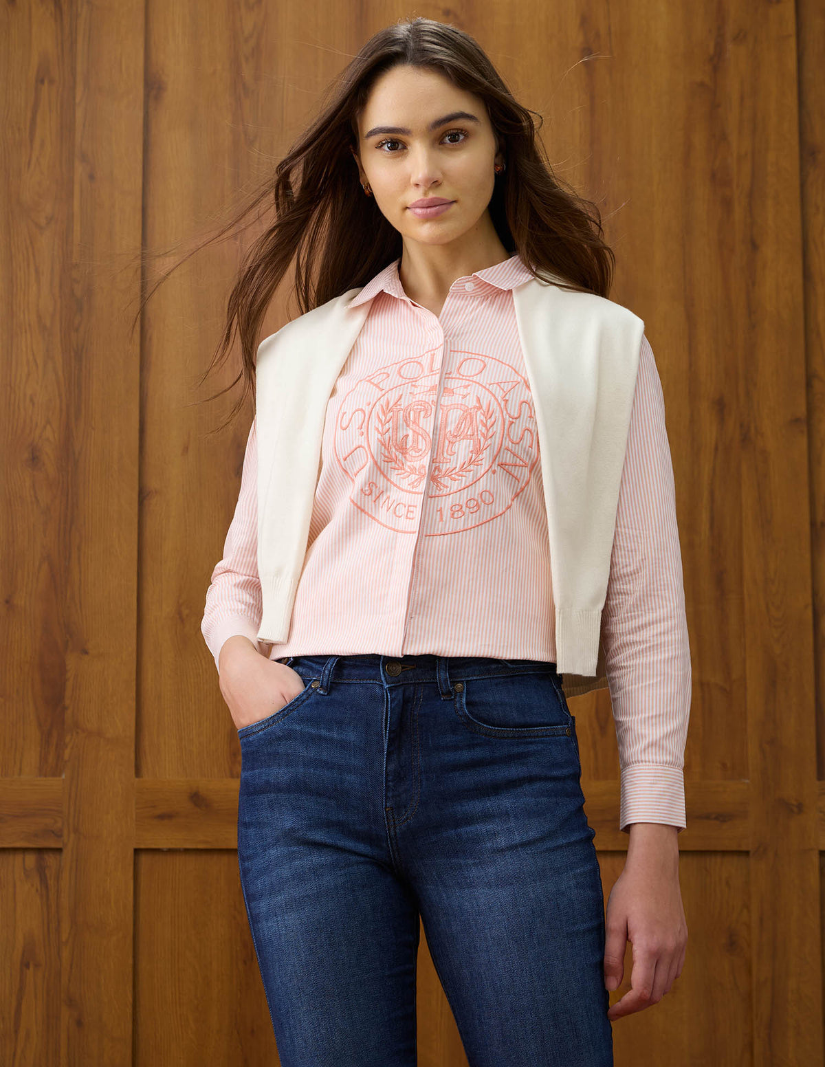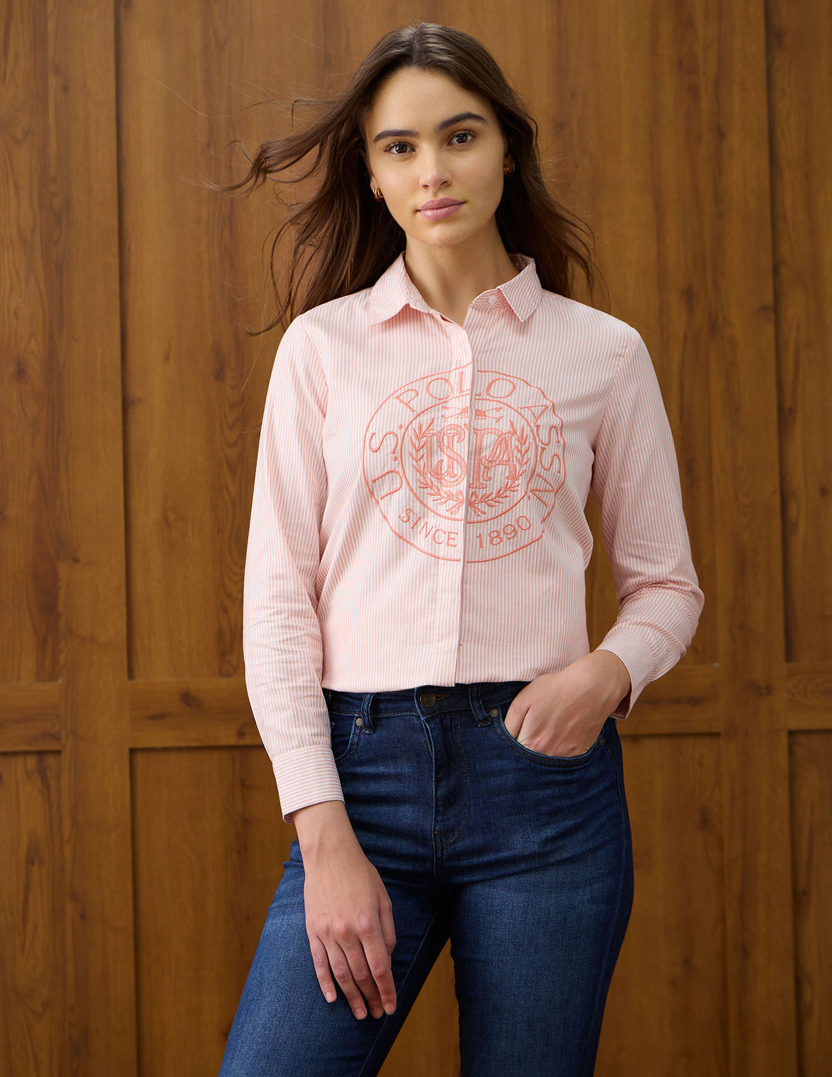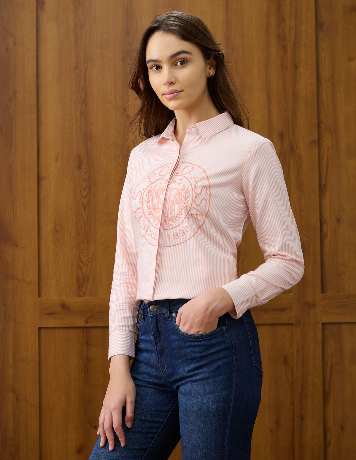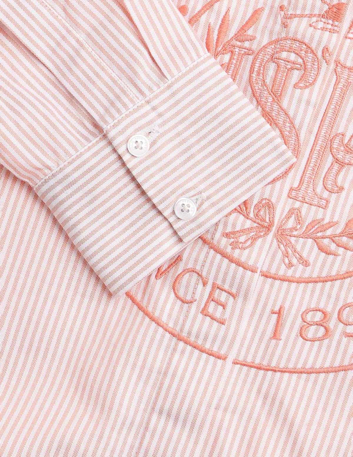 | Spread collar | Logo at chest | Full concealed button placket | Long sleeves with barrel cuffs | Curved hemline | Vertical striped with brand embroidered pattern | Dobby weave | Regular fit |
