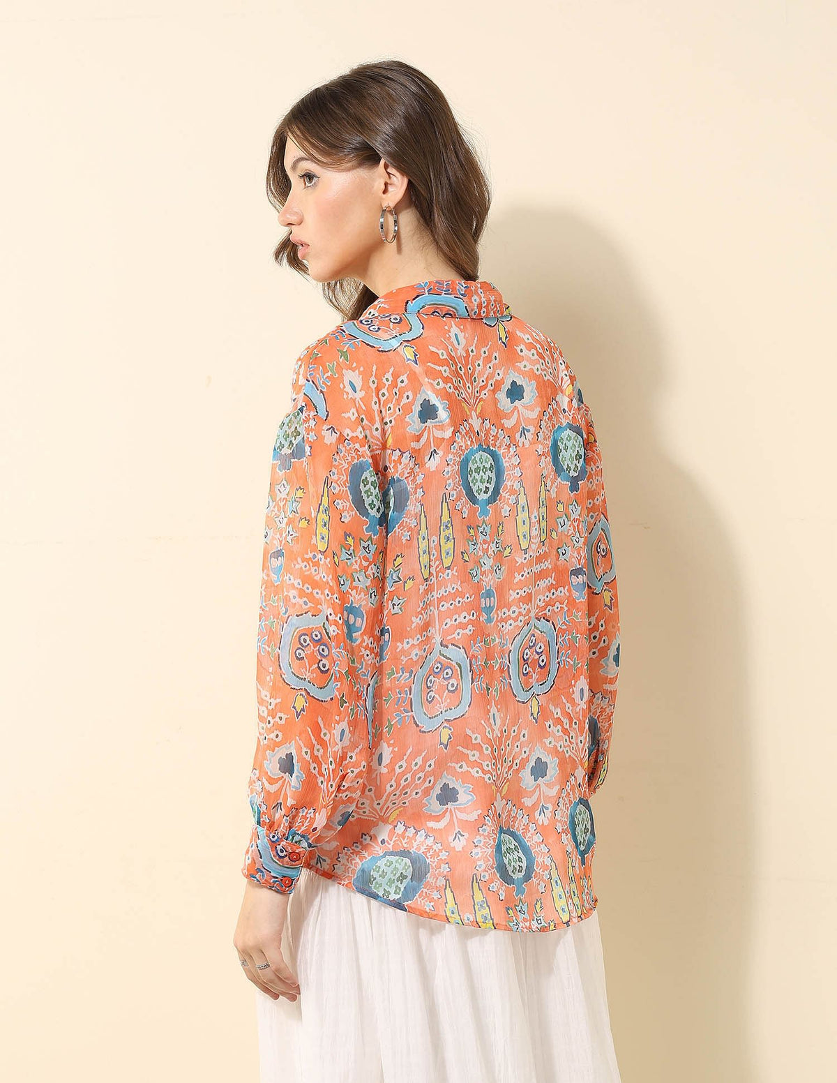 | Spread collar | Logo at chest | Full button placket | Long sleeves with barrel cuffs | Curved hemline | Tropical printed pattern | Chiffon weave | Relaxed fit |