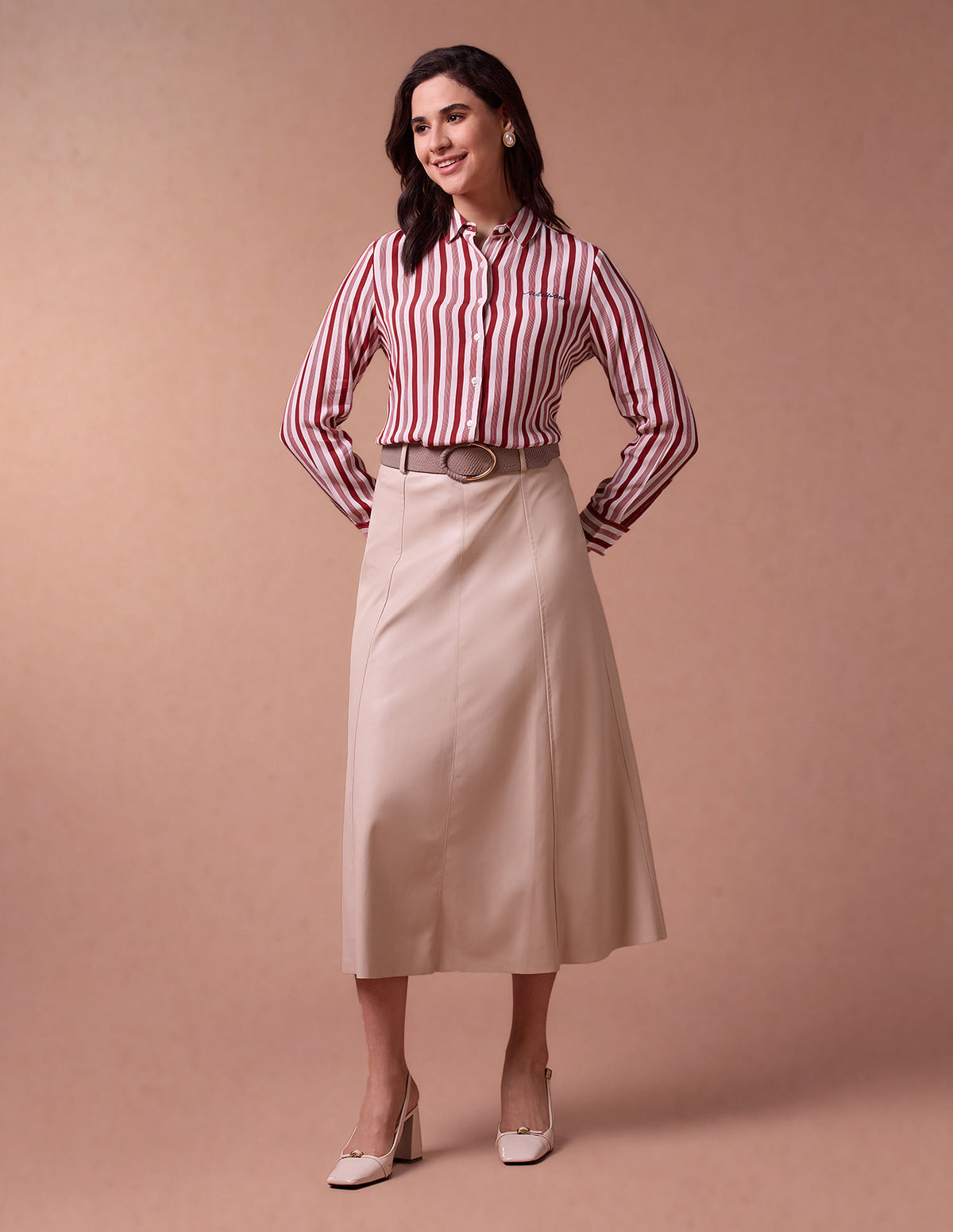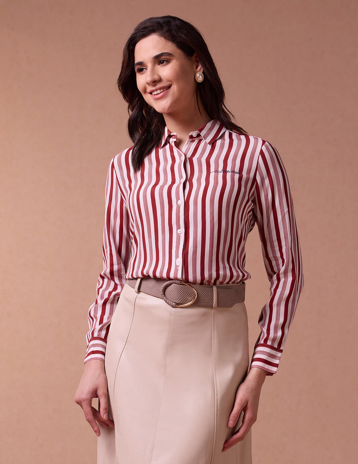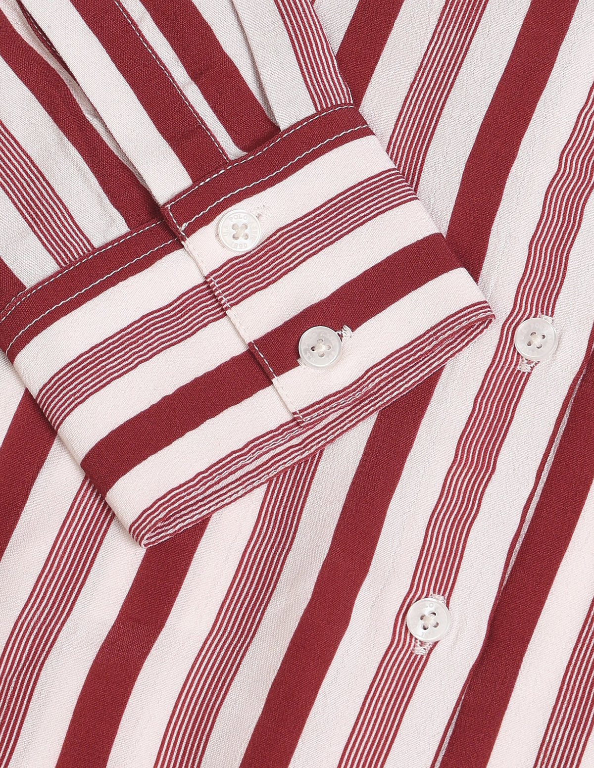| Spread collar | Embroidered logo at chest | French button placket | Long sleeves with barrel cuffs | Curved hemline | Vertical striped pattern | Regular weave | Relaxed fit