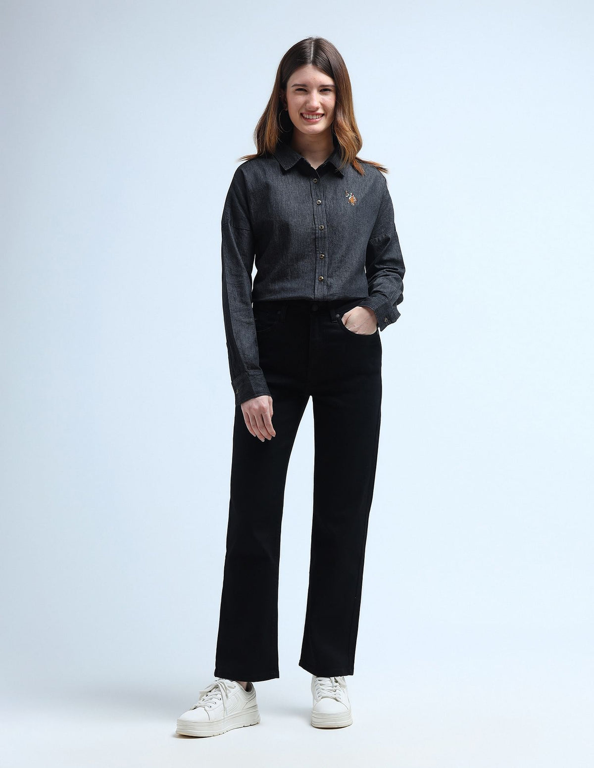 | Spread collar | Embroidered logo at chest | Full button placket | Long sleeves with barrel cuffs | Curved hemline | Washed pattern | Chambray weave | Loose fit