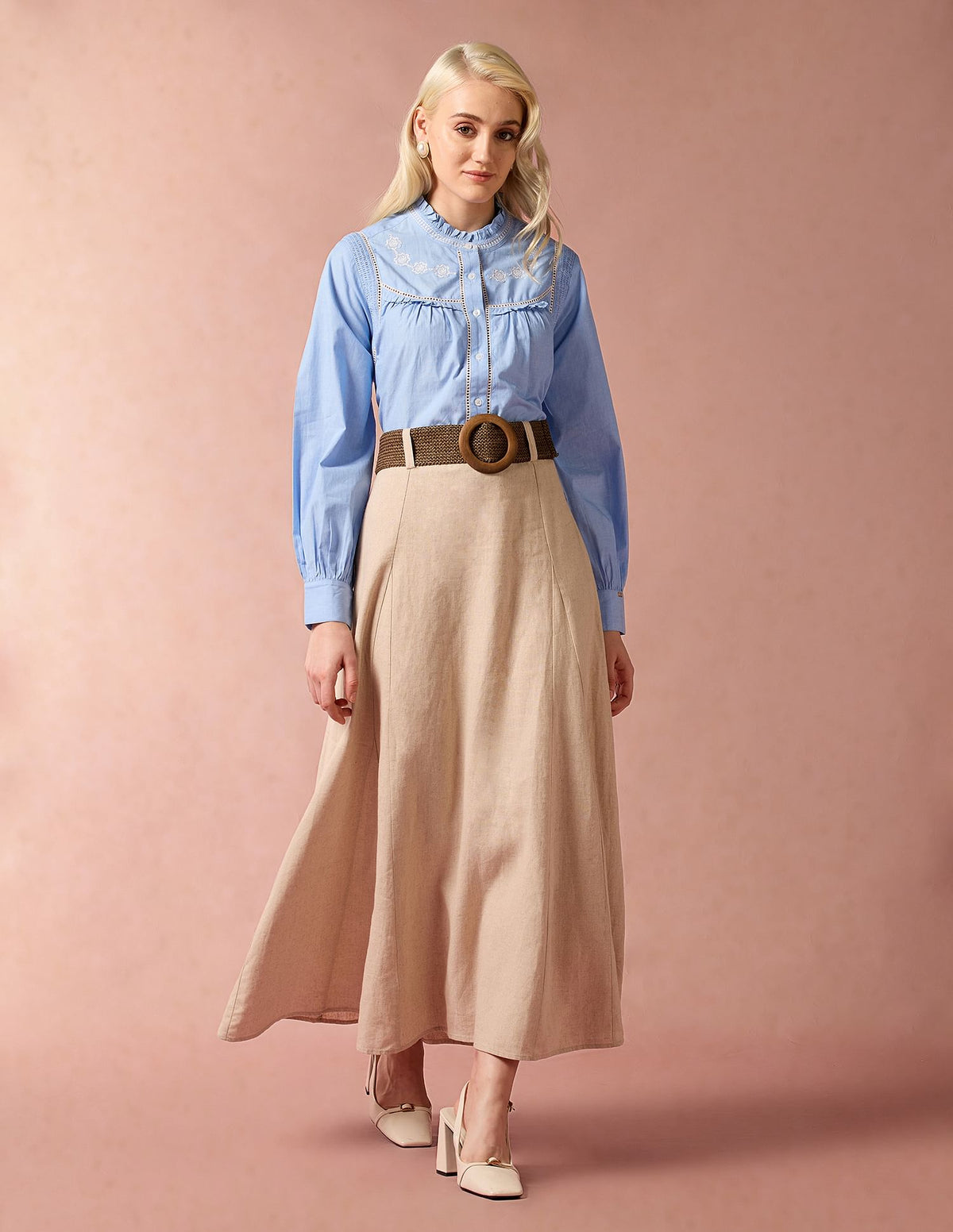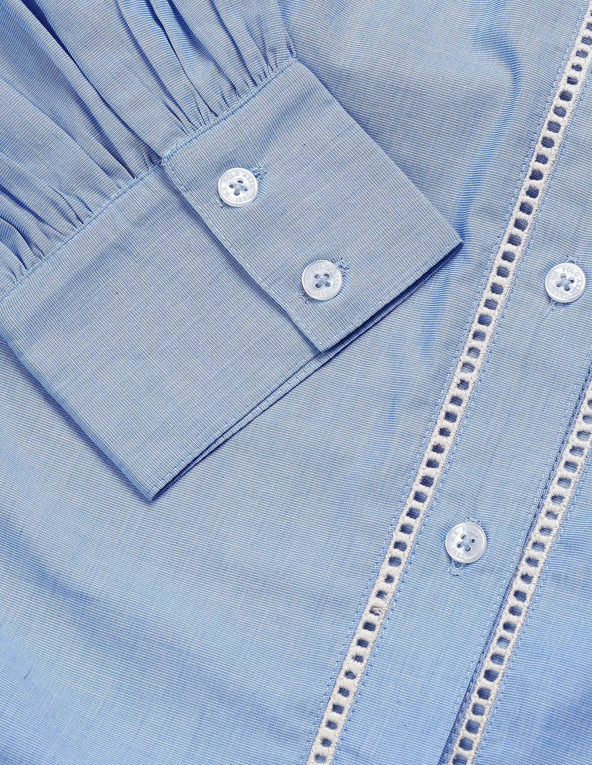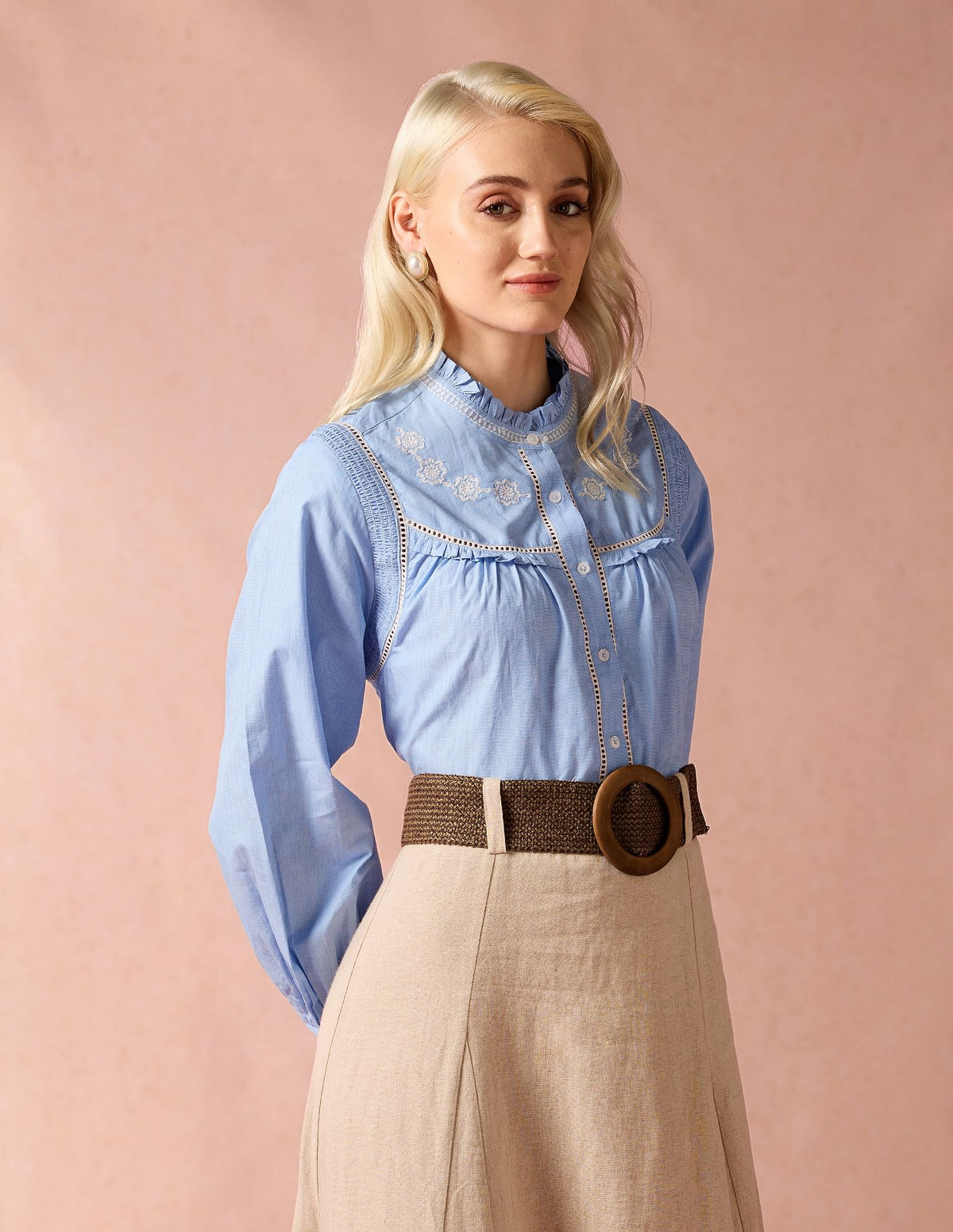 | Mandarin collar with ruffled details | Full button placket | Long sleeves with barrel cuffs | Straight hemline | Embroidered yoke with ruffles at chest | Smoked detail at armhole | Solid pattern | Fil-a-fil weave | Regular fit