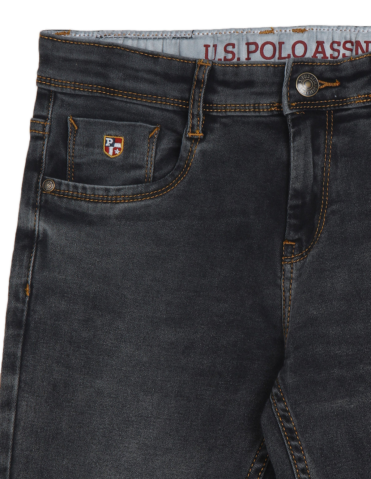 Story: Ideal for weekend wear, these jeans from U.S. Polo Assn. will make a rugged choice. They're constructed from sturdy denim, have a button waist, zip fly, and are lightly distressed. Style them with a bomber jacket.