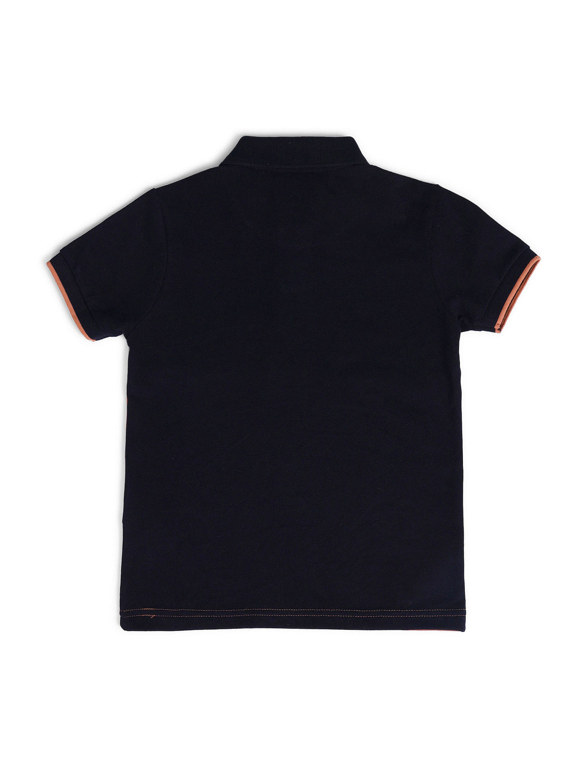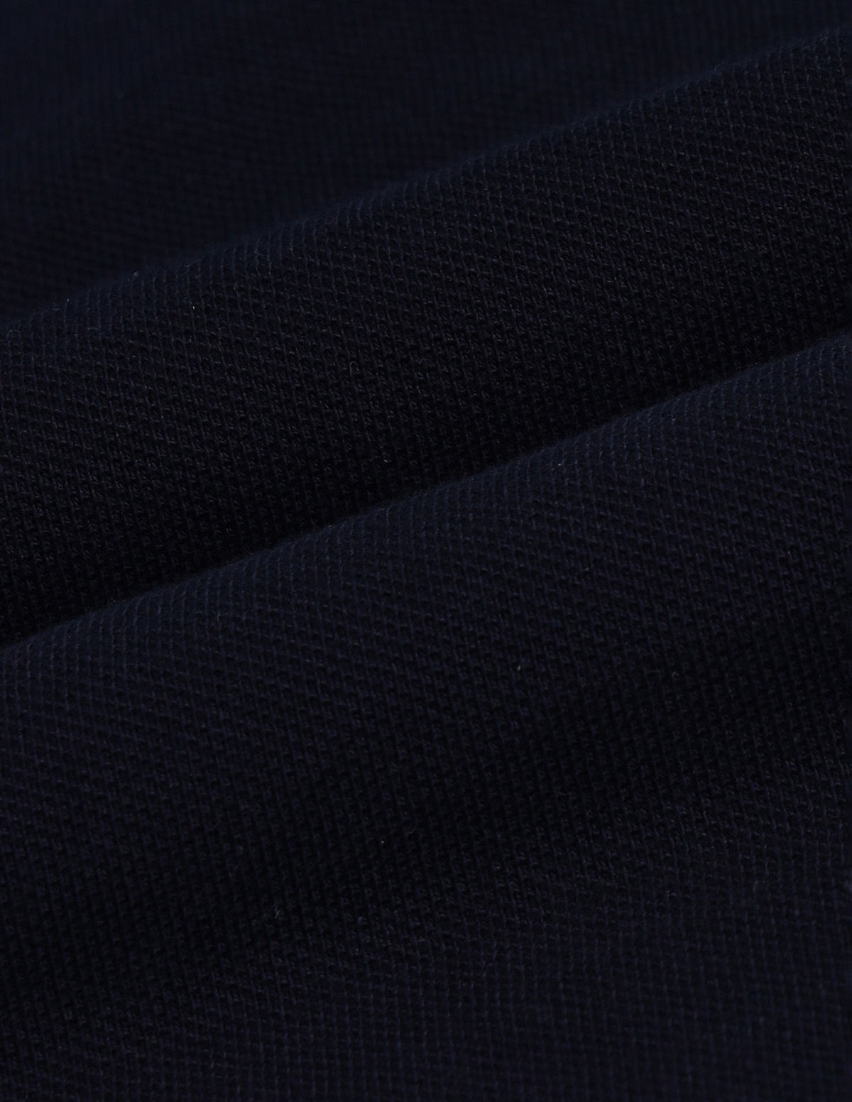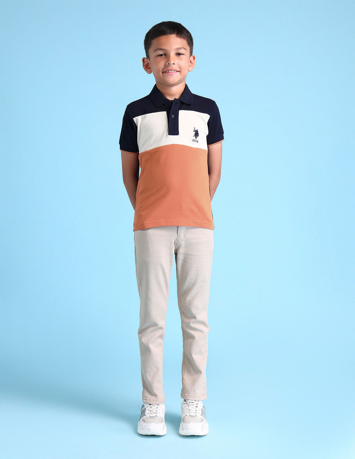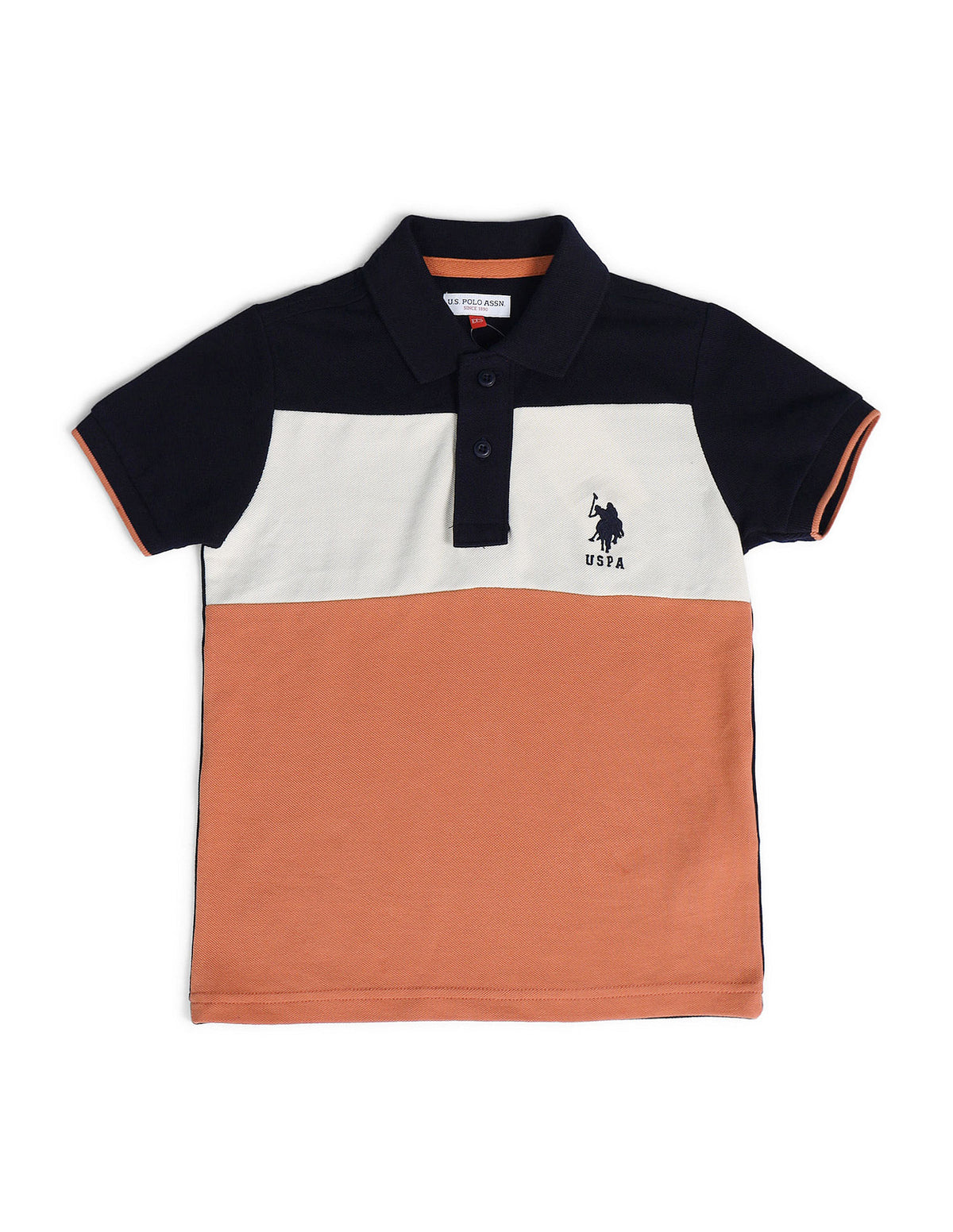 | Polo collar | Short button placket | Short sleeves | Ribbed collar and sleeve hems | Uneven vented hem | Colourblocked pattern | Regular fit |