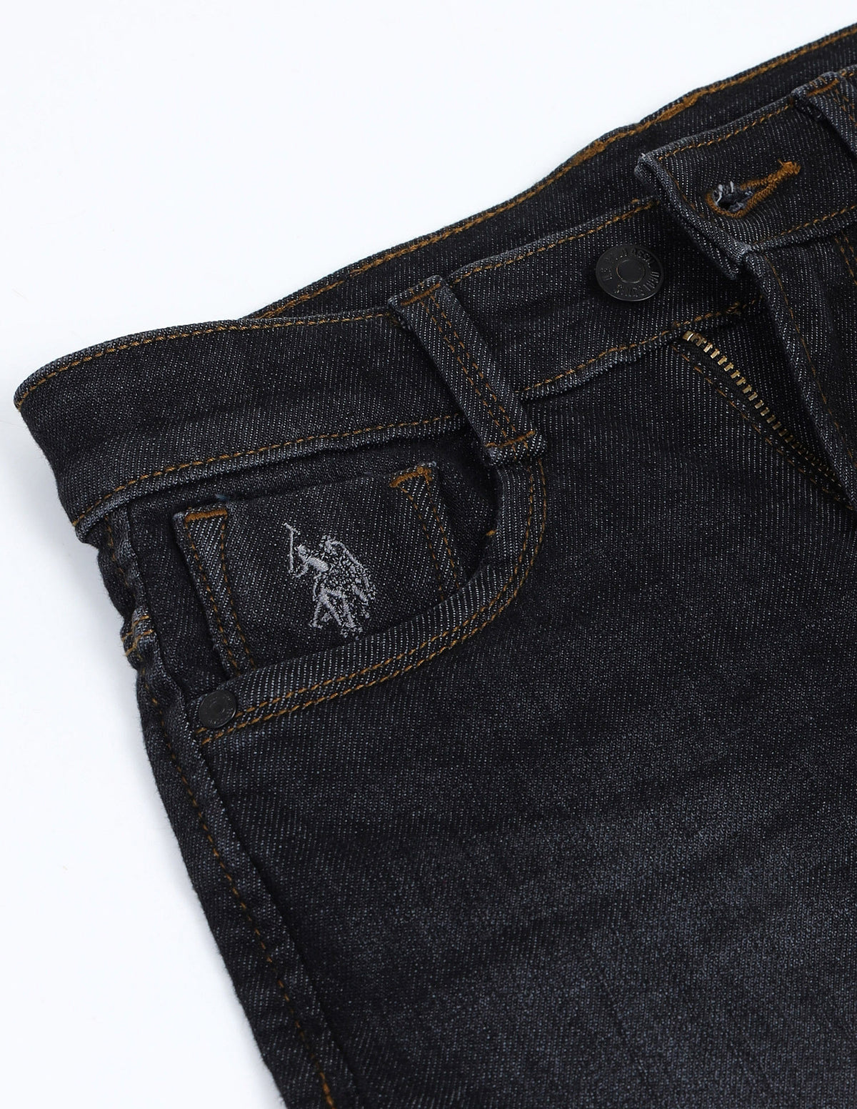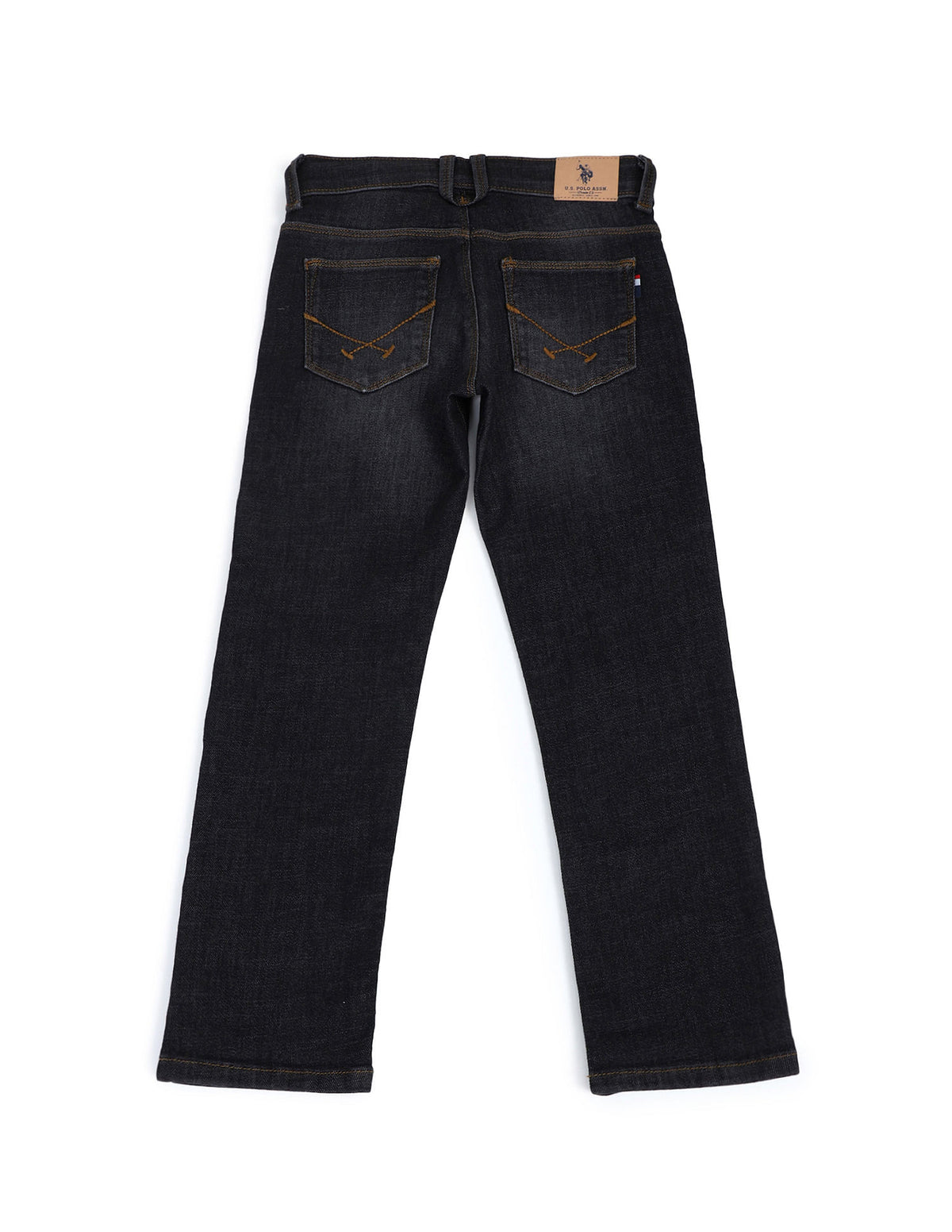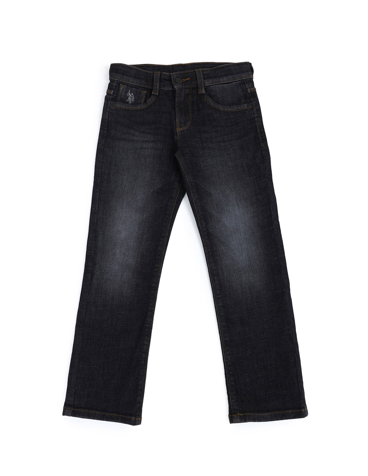 | Mid-rise | Adjustable waist tabs | Button and zip fly closure | Five-pocket styling |Denim weave | Relaxed fit |