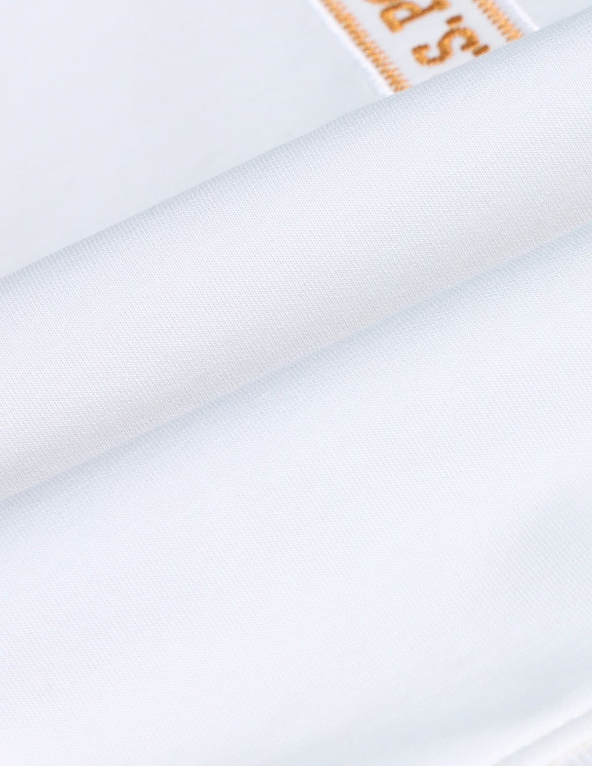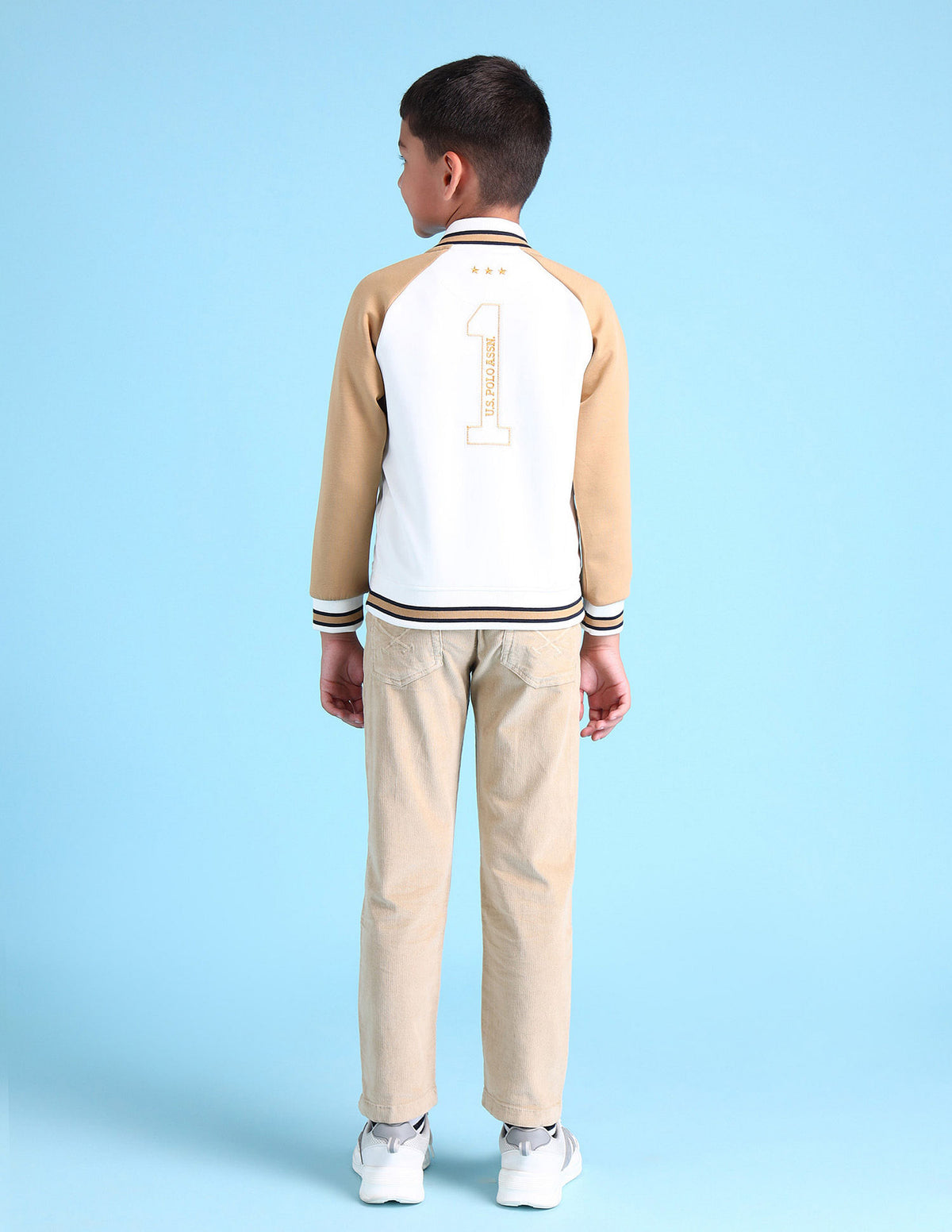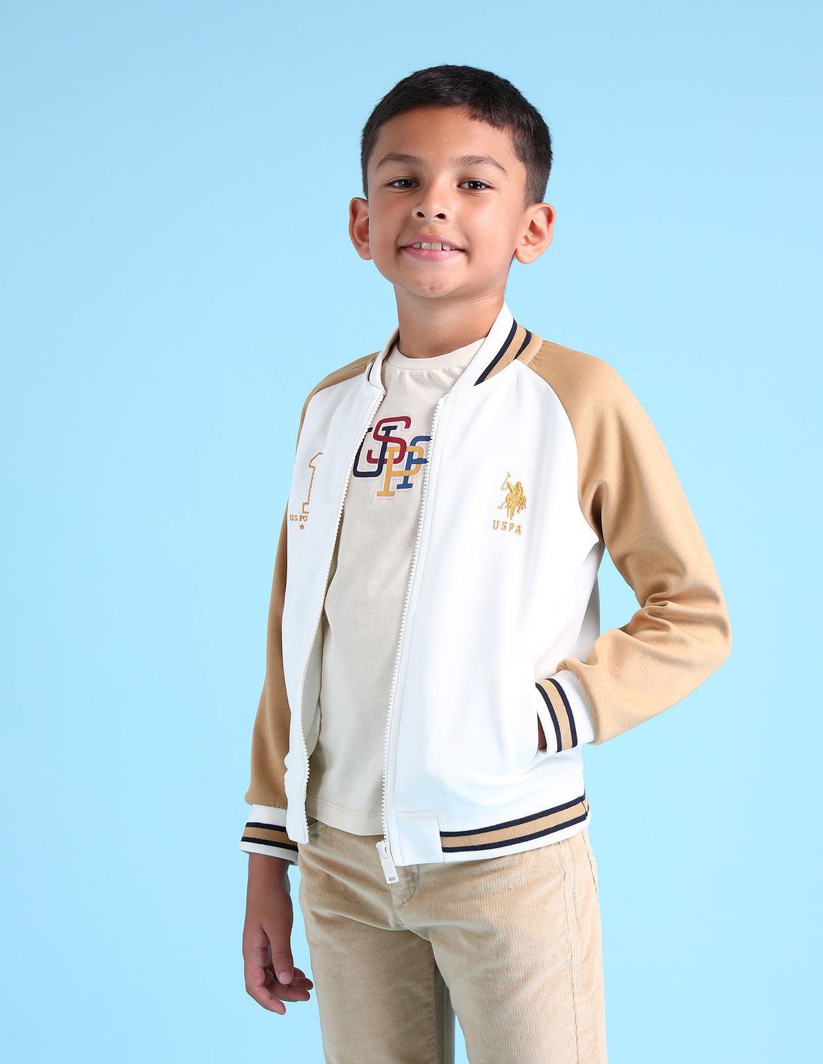 | Stand neck | Full zip-up closure at front | Long sleeves | Ribbed and striped neck, sleeve hems and hemline | Two waist pockets | Brand embroidered pattern | Knitted |