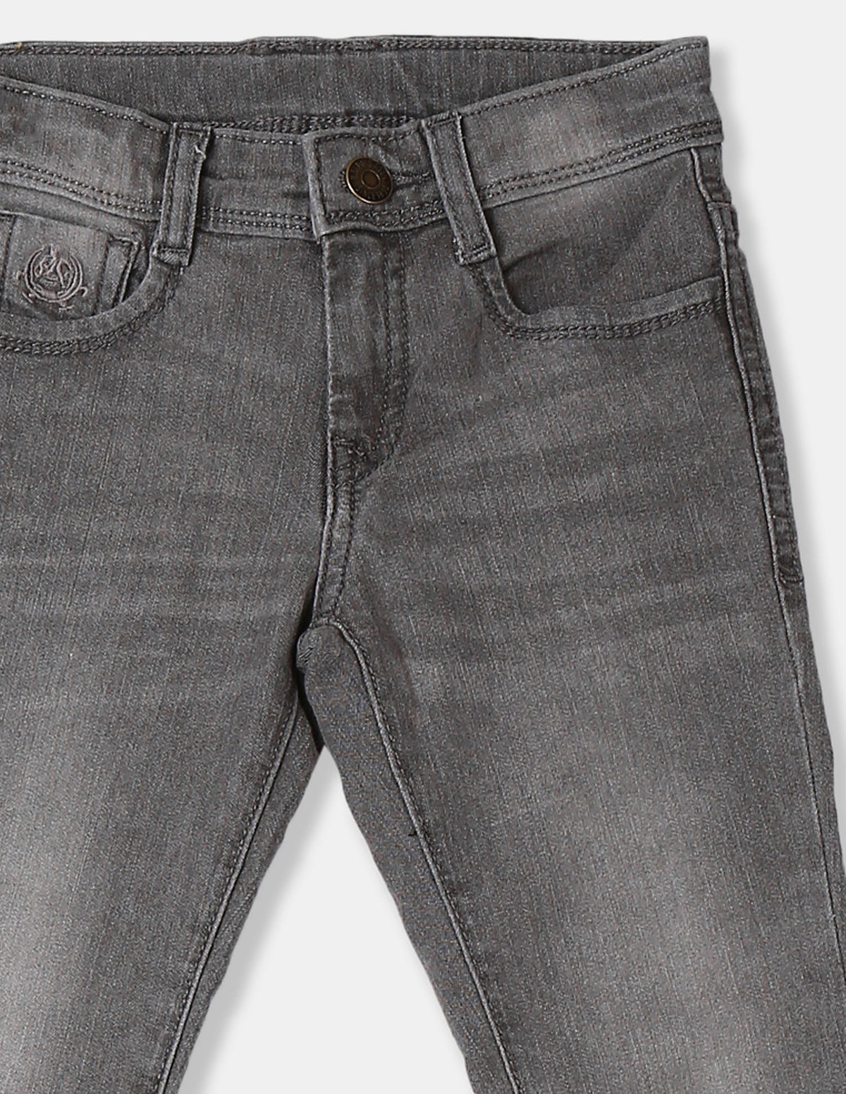 | Mid-rise waist | Adjustable inner elasticized waist tabs | Five-pocket styling | Dark wash | Lightly whiskered