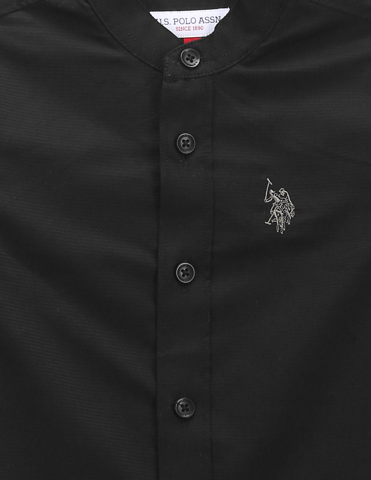 Story: Make a stylish statement with this mandarin collar shirt from the Mini Me collection, offering a modern twist on the traditional button-down with its distinctive collar design.
