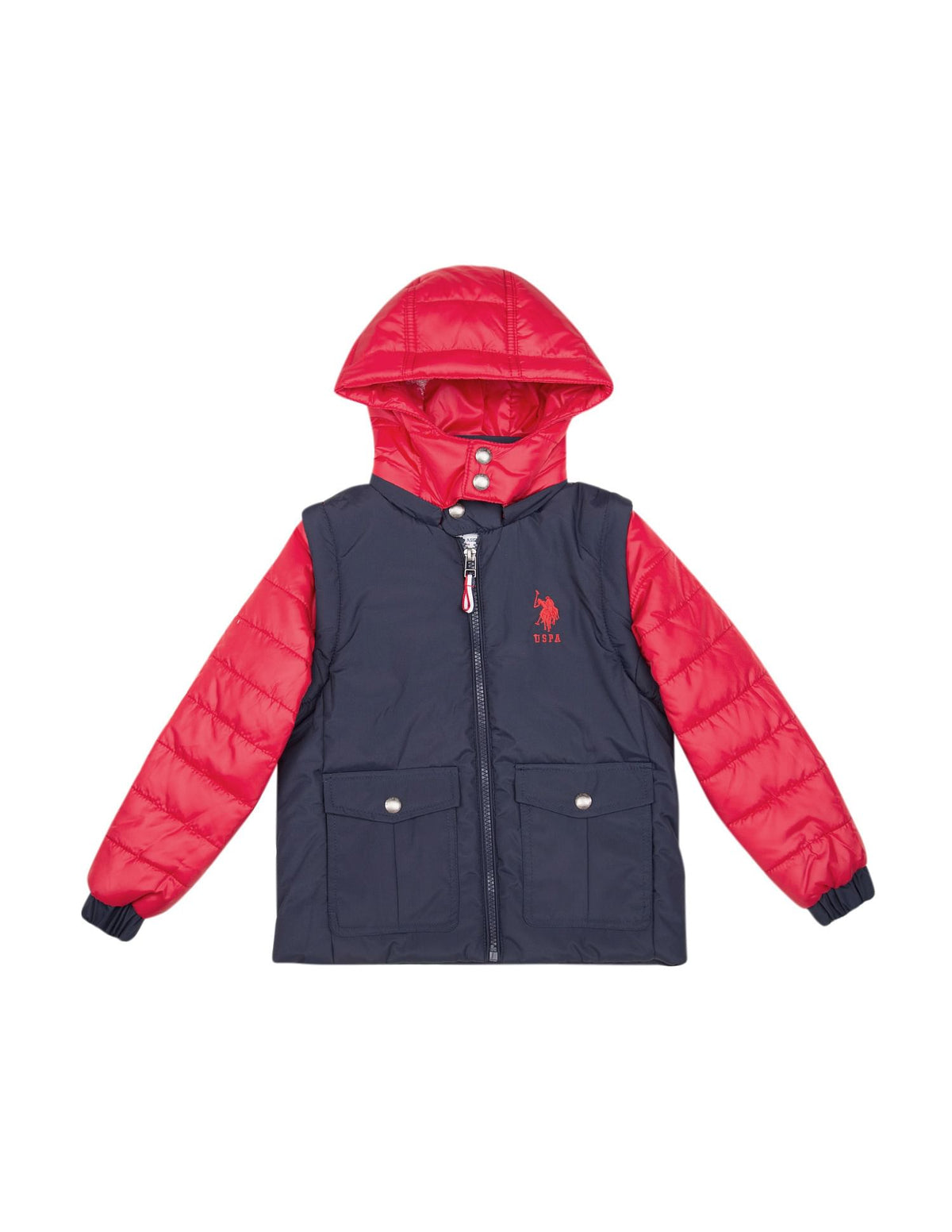 - Detachable hood with snap button closures