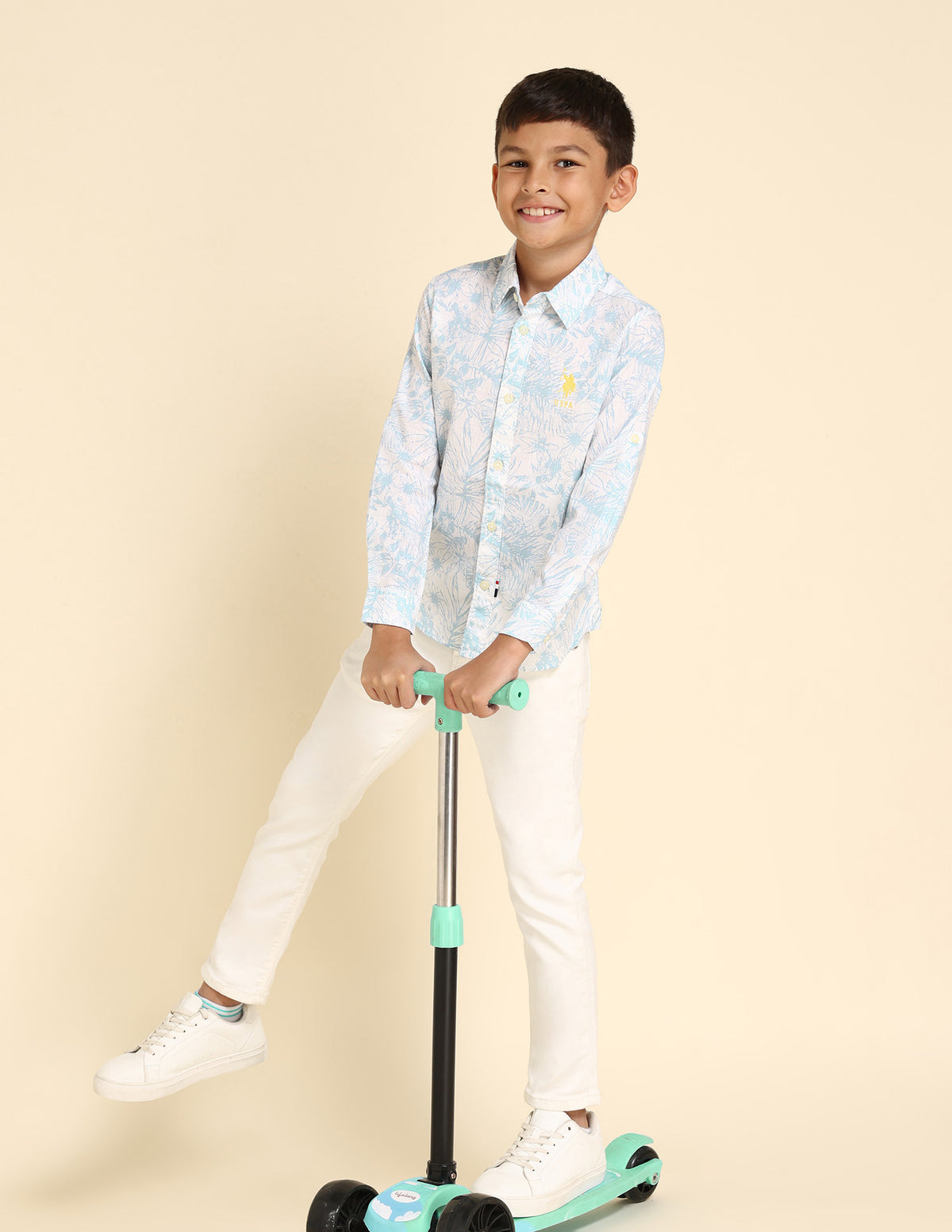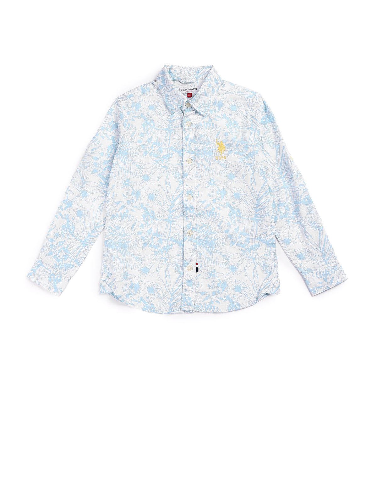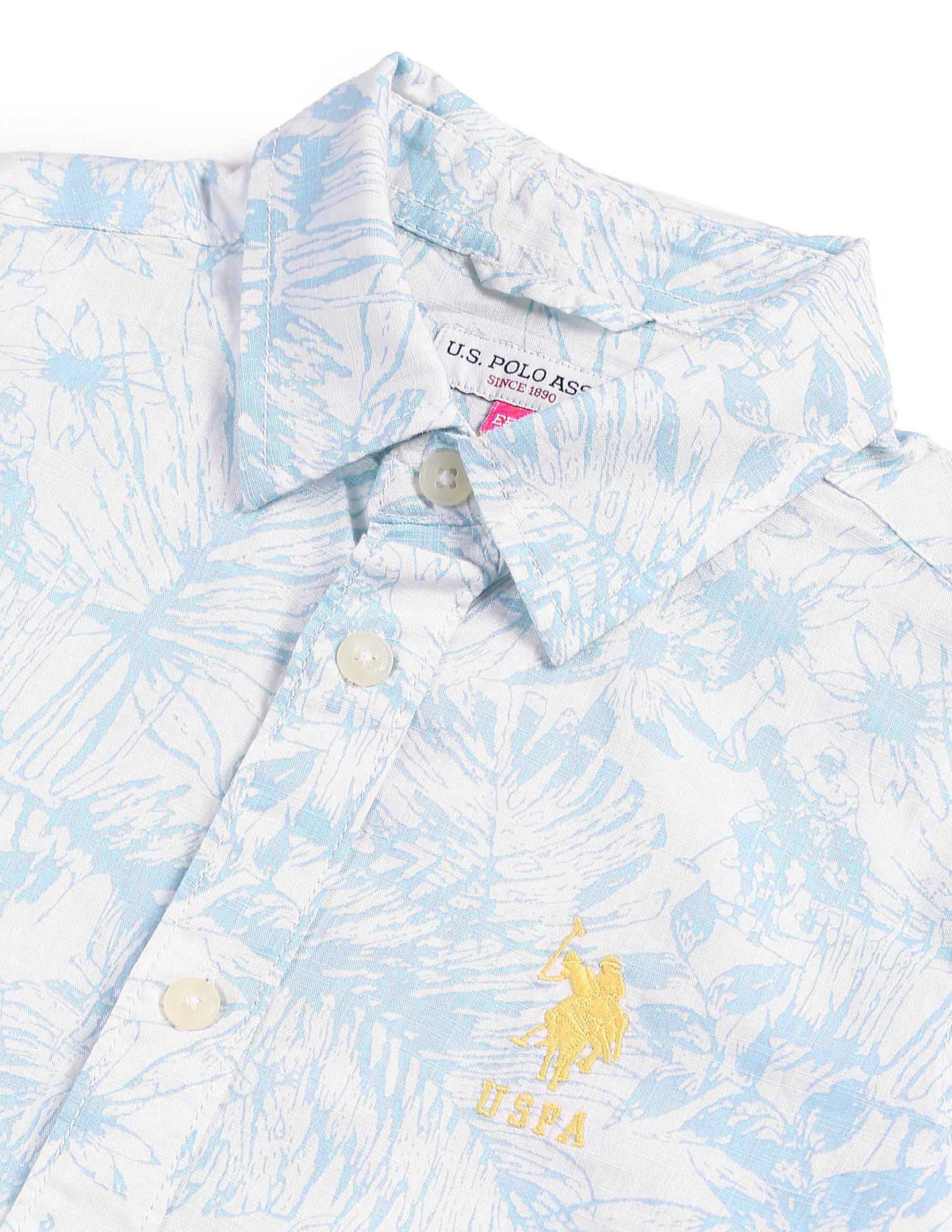 | Spread collar | Embroidered logo at chest | Full button placket | Convertible sleeves with rounded cuffs | Curved hemline | Tropical printed pattern | Regular weave | Regular fit | Country Of Origin - India- New Season - Summer Heroes