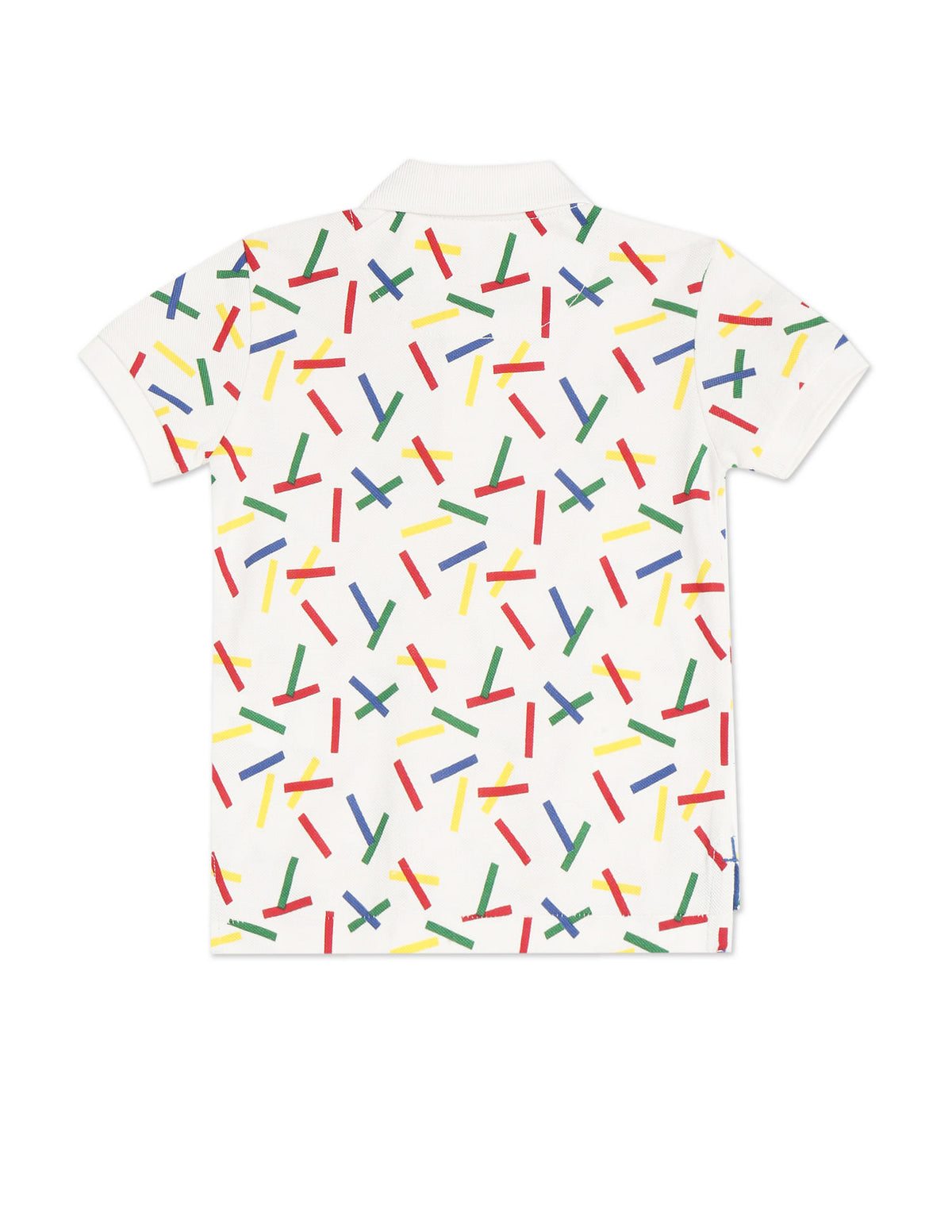 | Ribbed polo collar | Short button placket | Short sleeves with ribbed hems | Uneven vented hem | All over print