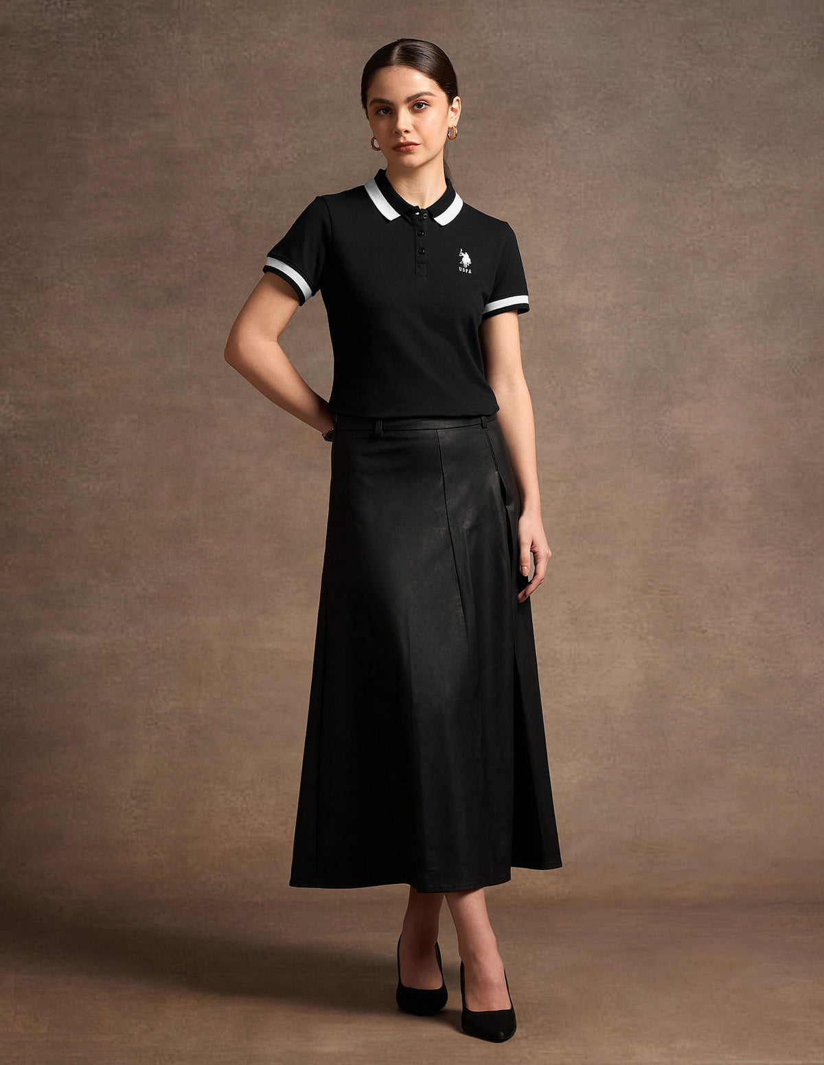 | Polo collar | Embroidered logo at chest | Short button placket | Short sleeves | Striped collar and sleeve hems | Straight hemline | Solid pattern | Pique knit | Regular fit | Country Of Origin - India