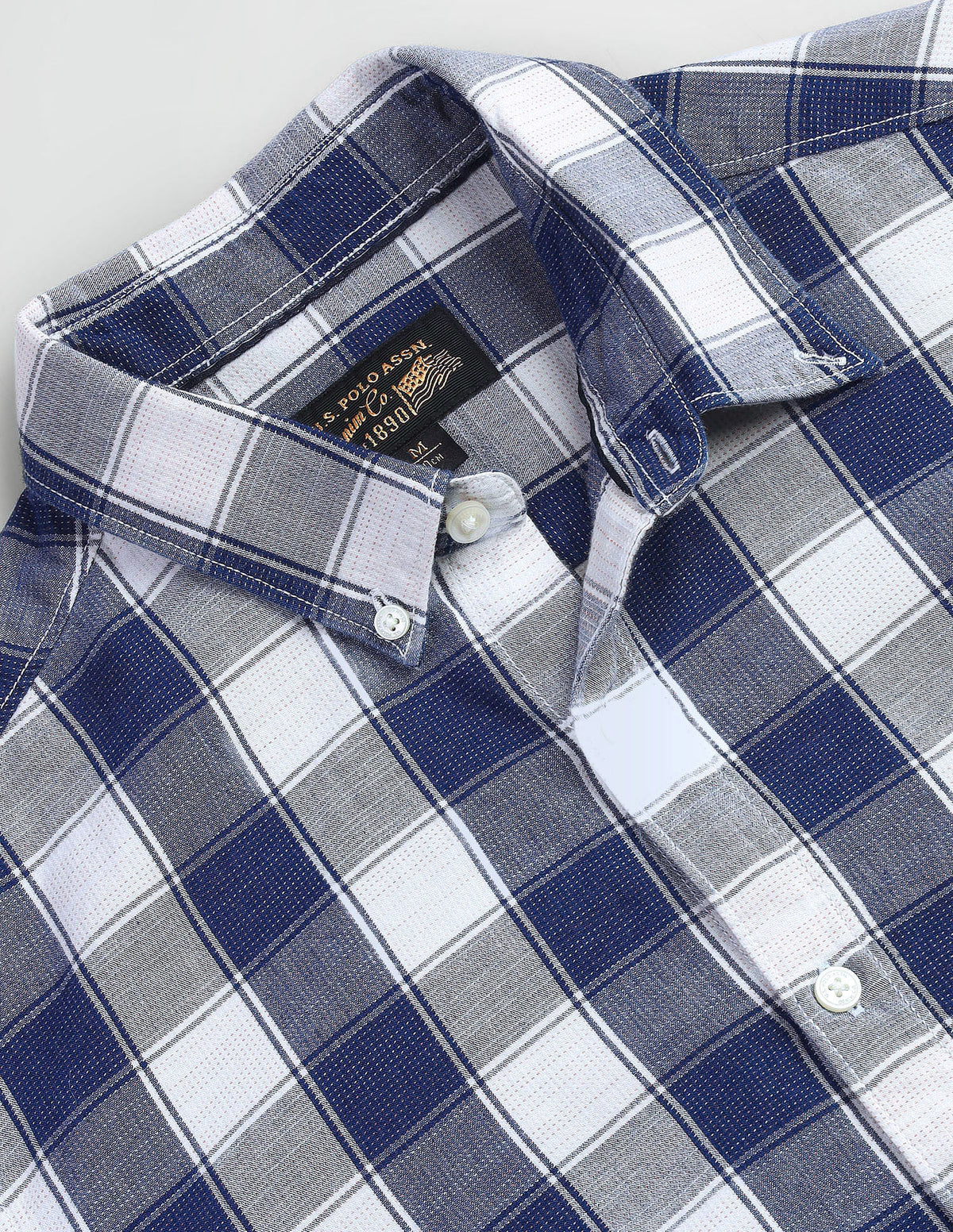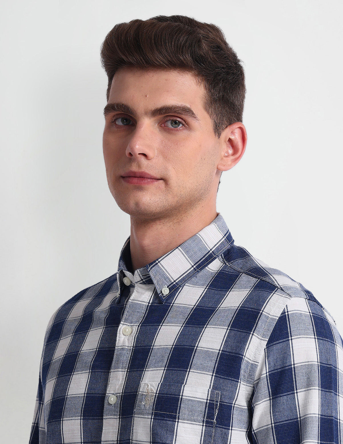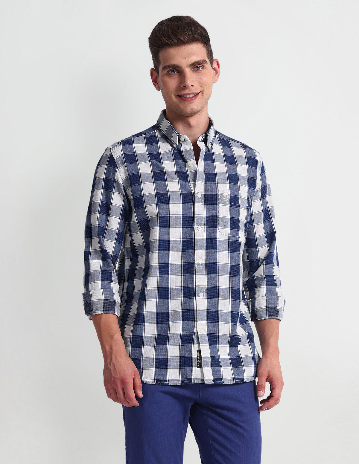 | Button-down collar | Chest patch pocket | Full button placket | Long sleeves with rounded cuffs | Curved hemline | Buffalo checked pattern | Patterned weave | Slim fit | Country Of Origin - India
