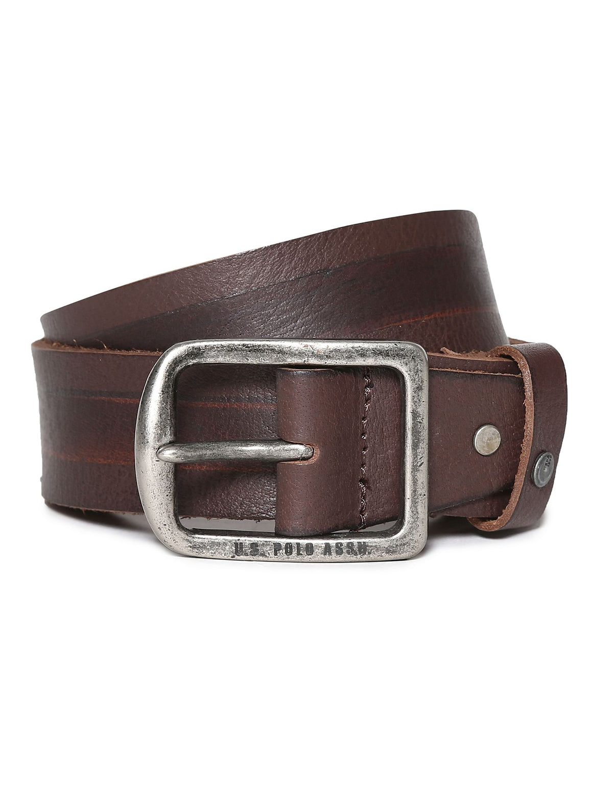 Story: U.S. Polo Assn.'s belt is cut from distressed leather that wears extremely well due to its texture. This tactile piece is offset with a burnished adjustable buckle fastening and a contrast stripe. Team yours with chinos or jeans for a neat finish to everyday looks.
