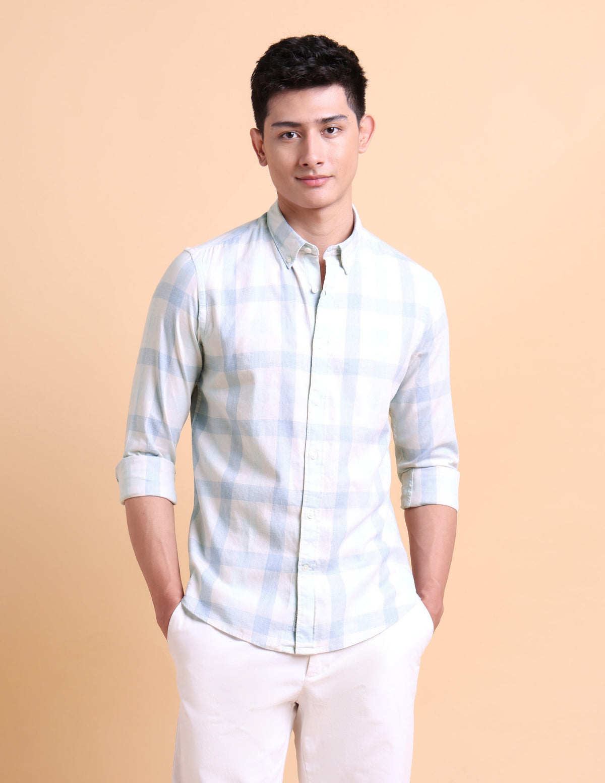 | Button-down collar | Logo at chest | Full button placket | Long sleeves with rounded cuffs | Curved hemline | Checked pattern | Dobby weave | Brand fit: Tailored fit | Fit mapping: Regular fit | Country Of Origin - India | AW-24