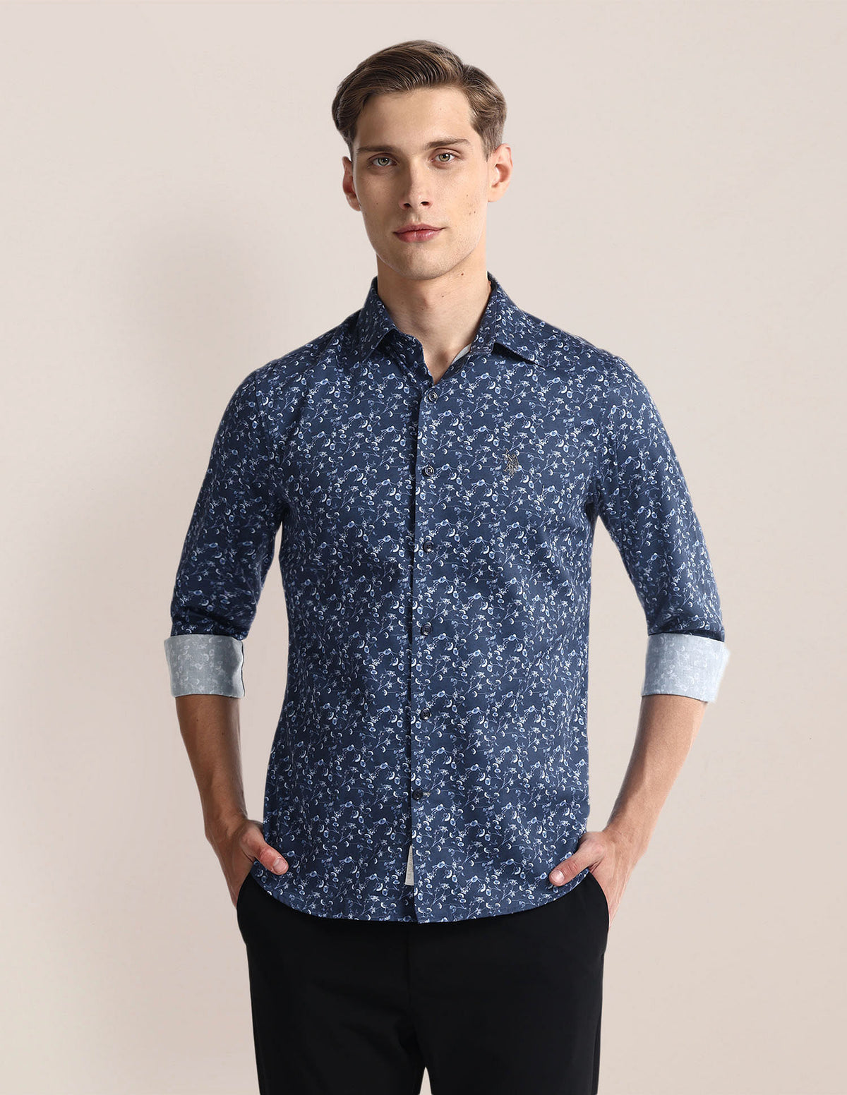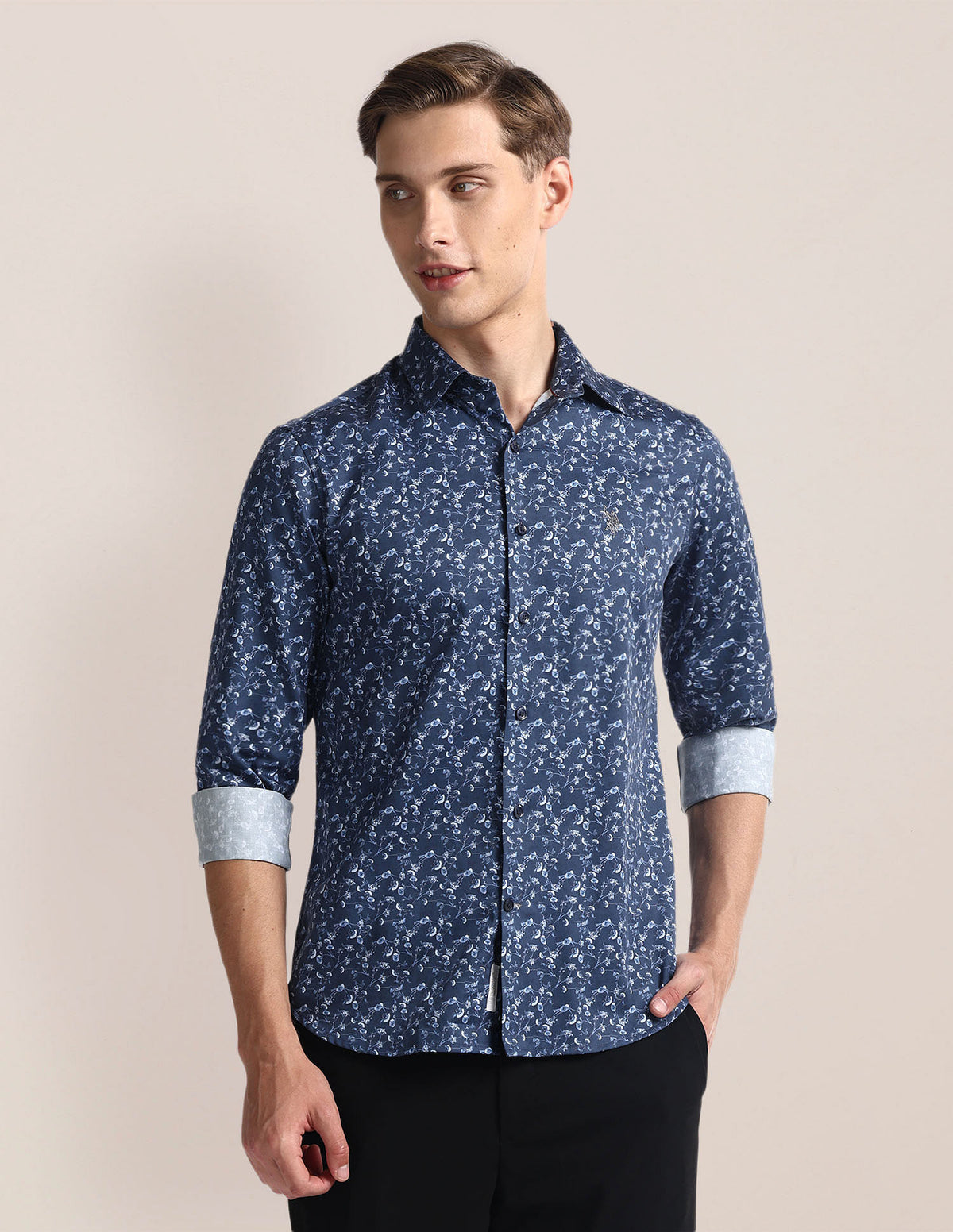 | Spread collar | Logo at chest | French button placket | Long sleeves with rounded cuffs | Curved hemline | Floral printed pattern | Sateen weave | Brand fit: Tailored fit | Fit mapping: Regular fit | Country Of Origin - India- New Season - Summer Heroes
