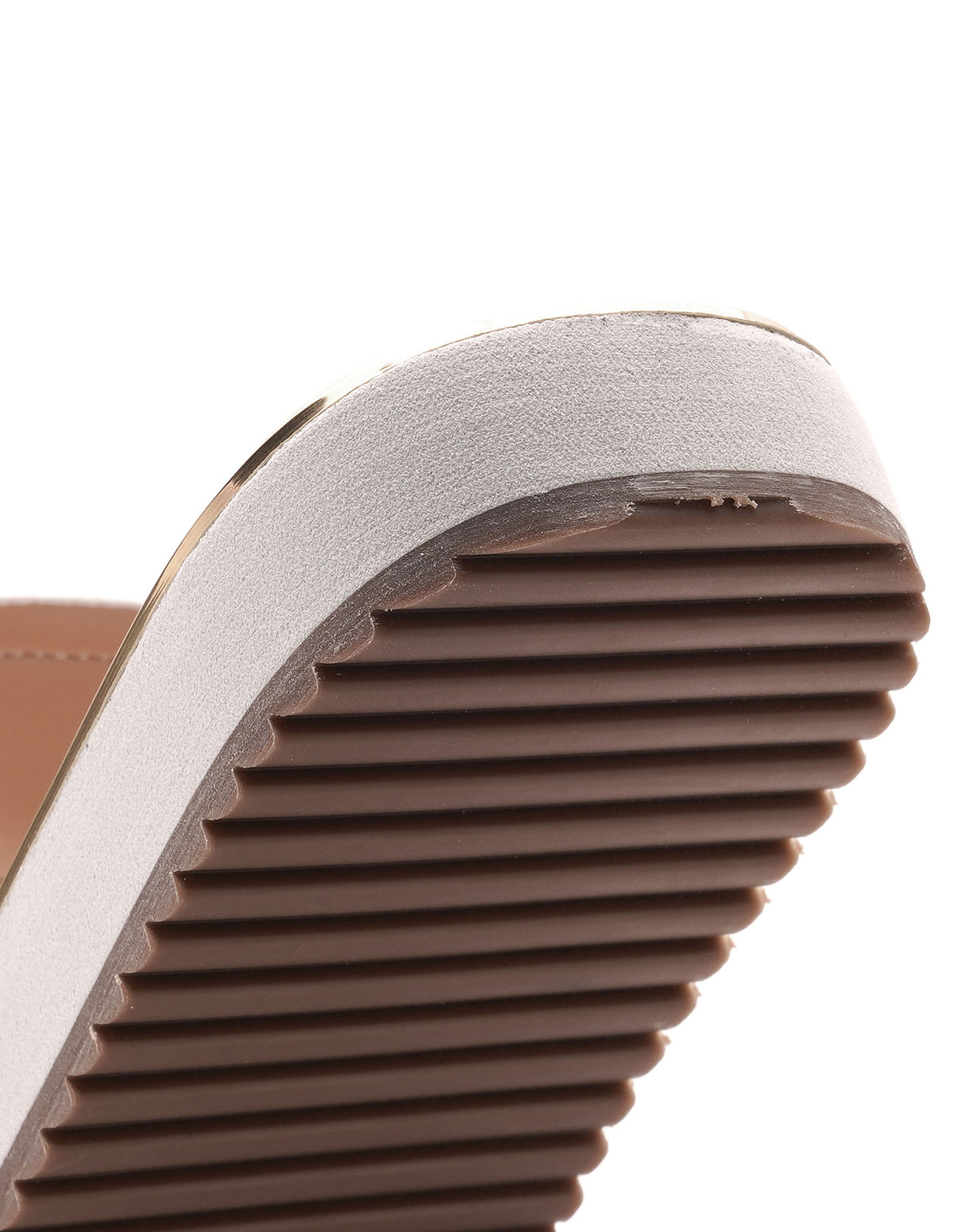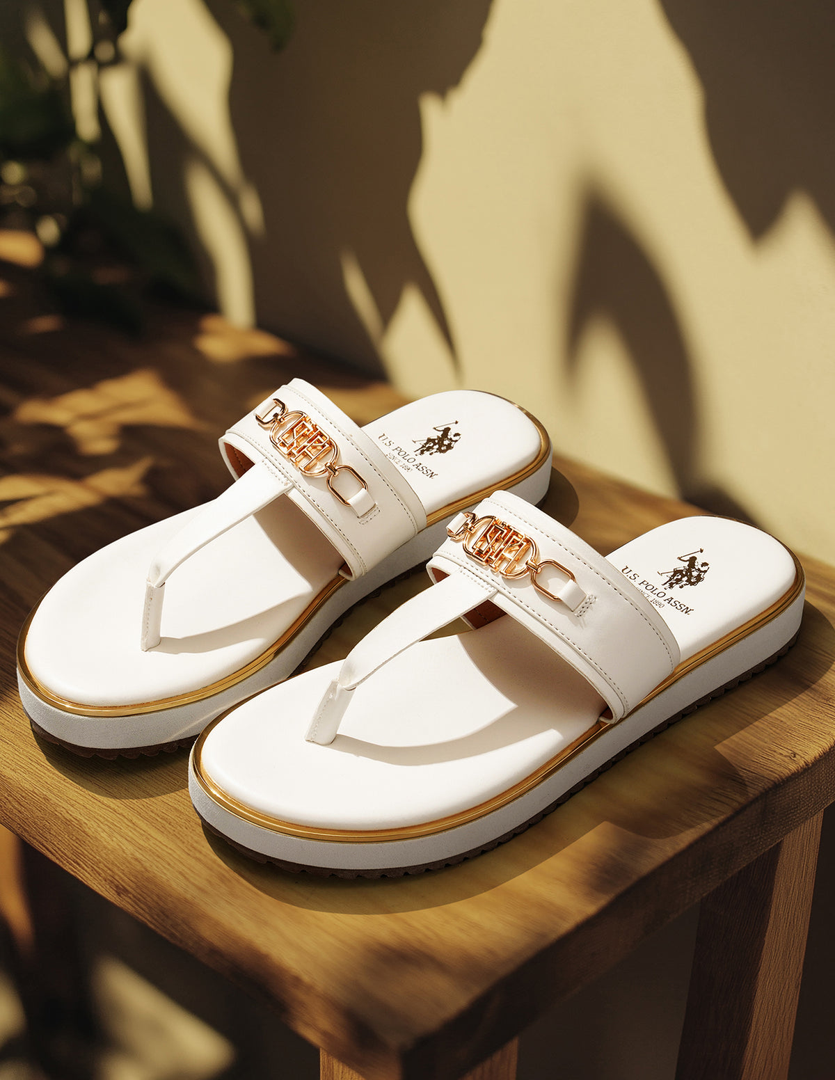 | Toe separator | Vamp strap with brand metallic accent | Cushion footbed with branding | Striped outsole | Solid pattern