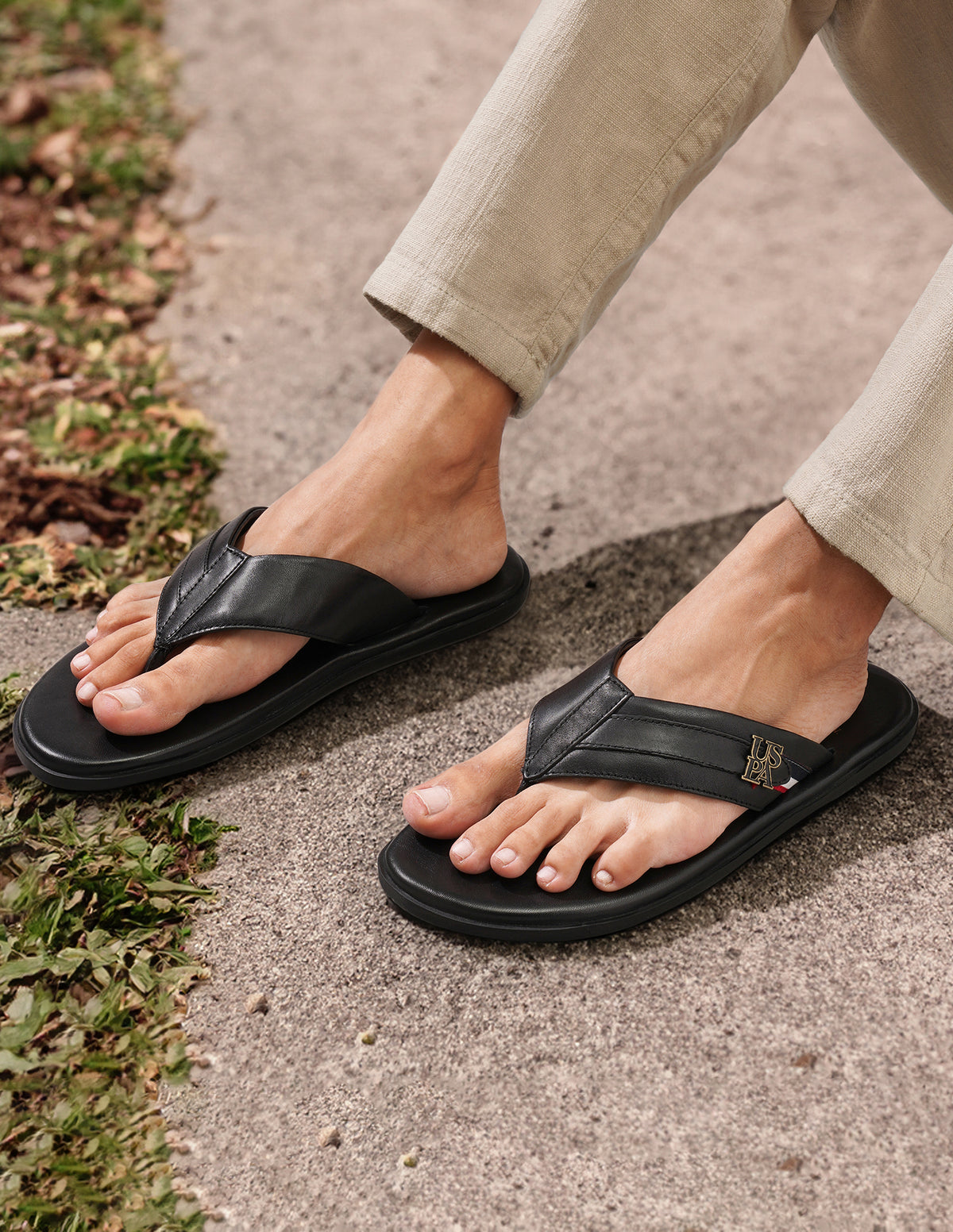 | Toe separator | Broad V-strap with monogram | Cushioned footbed with logo | Textured outsole | Solid pattern | Country Of Origin - India