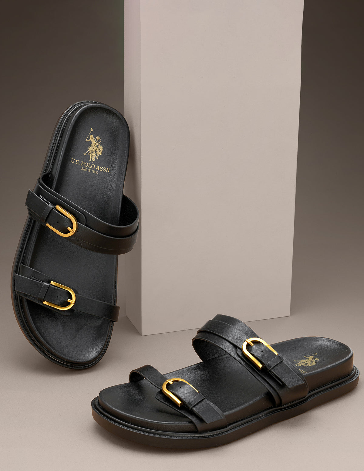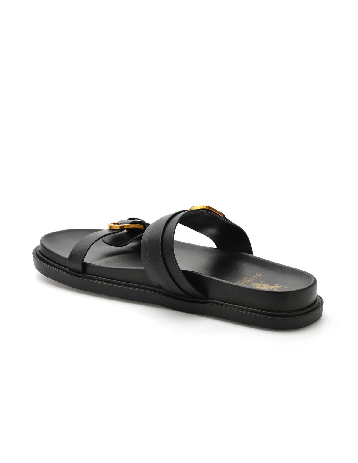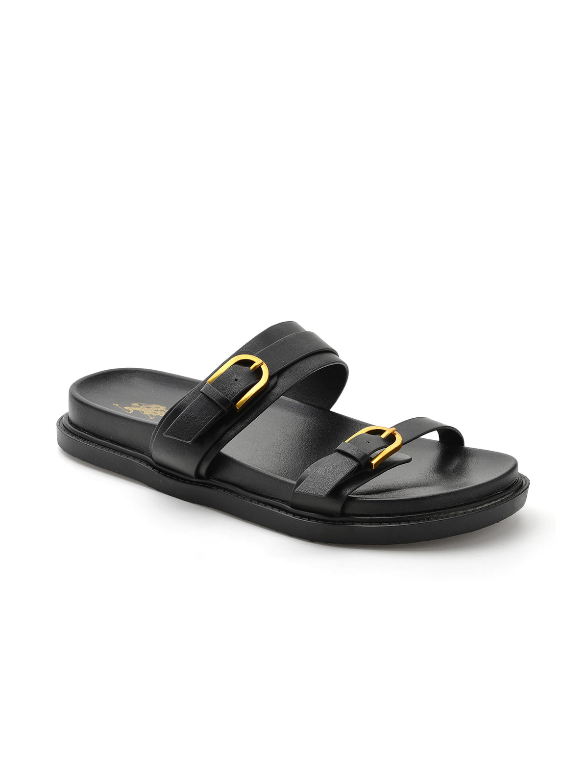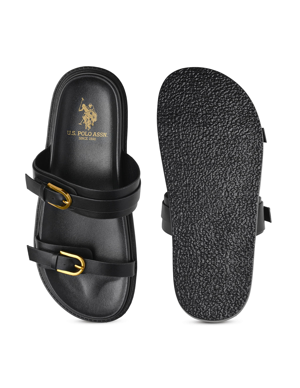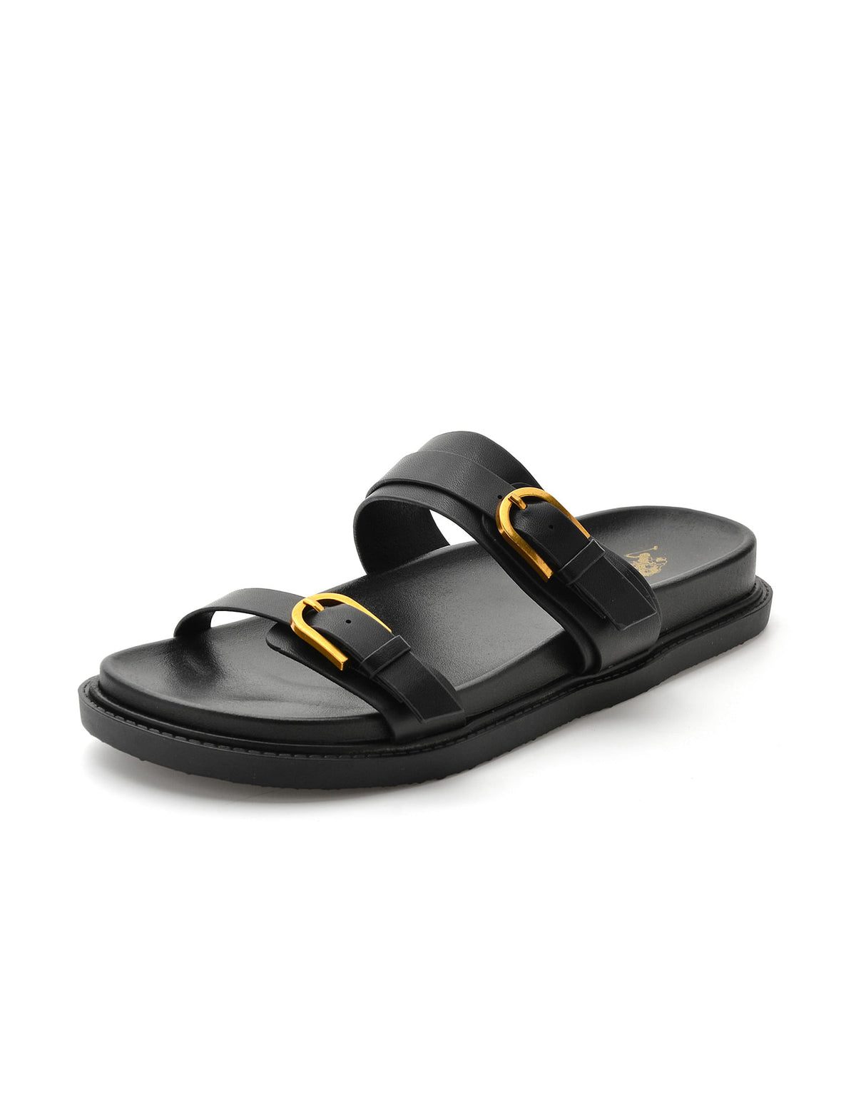 | Open toe | Double strap with adjustable buckle closure across vamp | Ankle strap with elasticized gusset | Cushioned footbed | Textured outsole