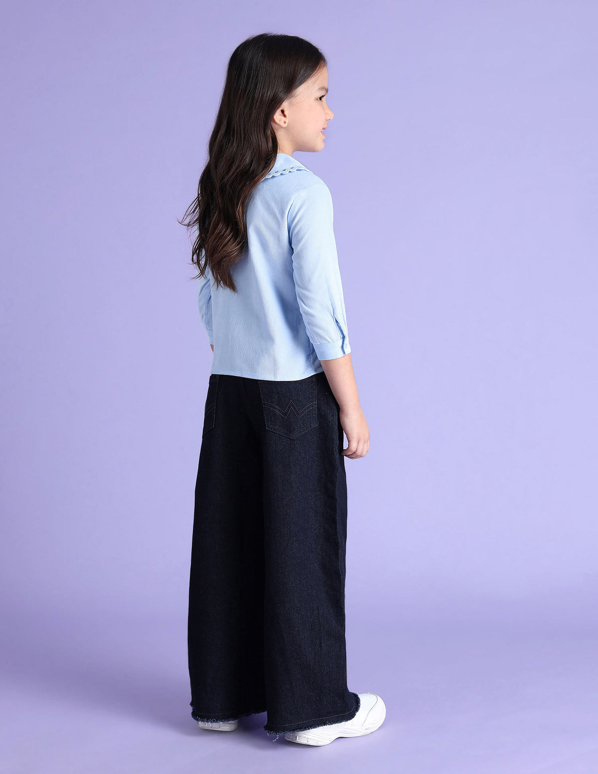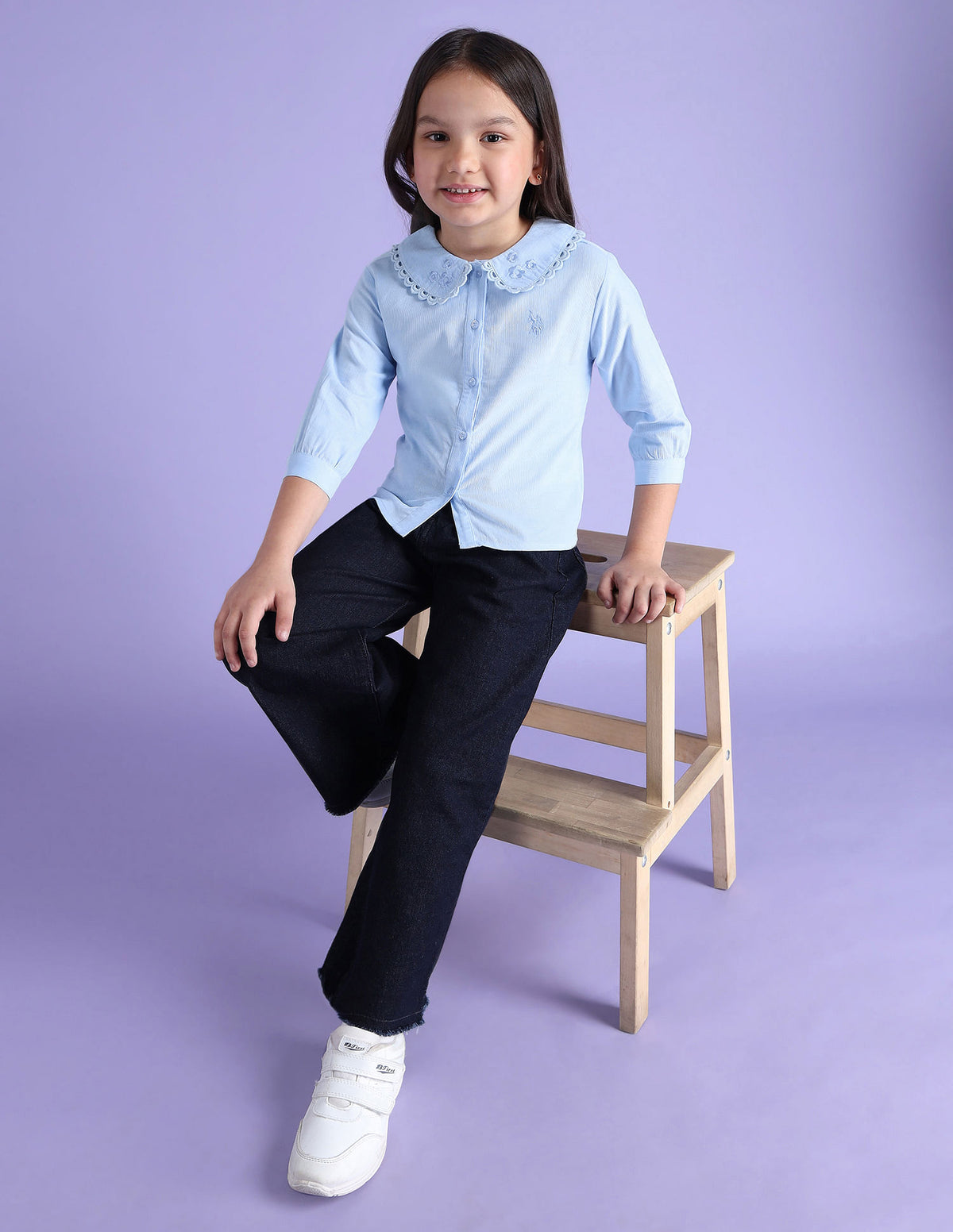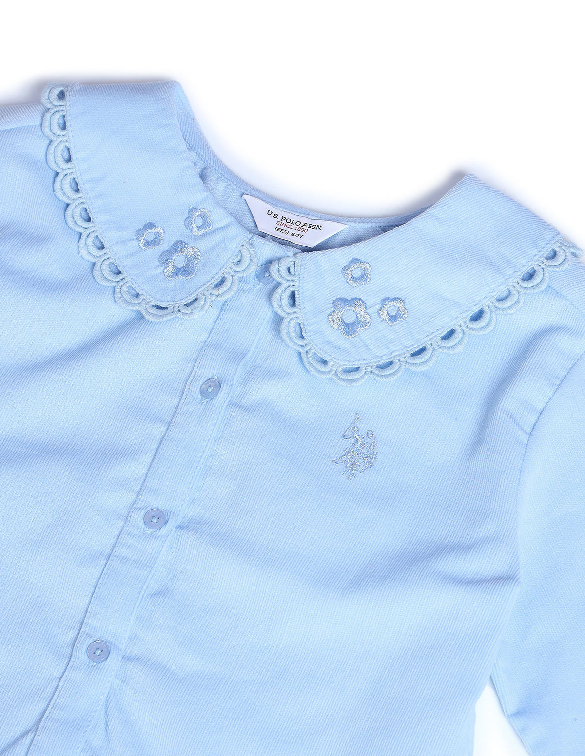 | Peter pan collar | Lace detailed yoke at chest | Button and loop closure at back | Three-quarter sleeves with elasticized hems | Straight hemline | Solid pattern | Regular weave | Regular fit |