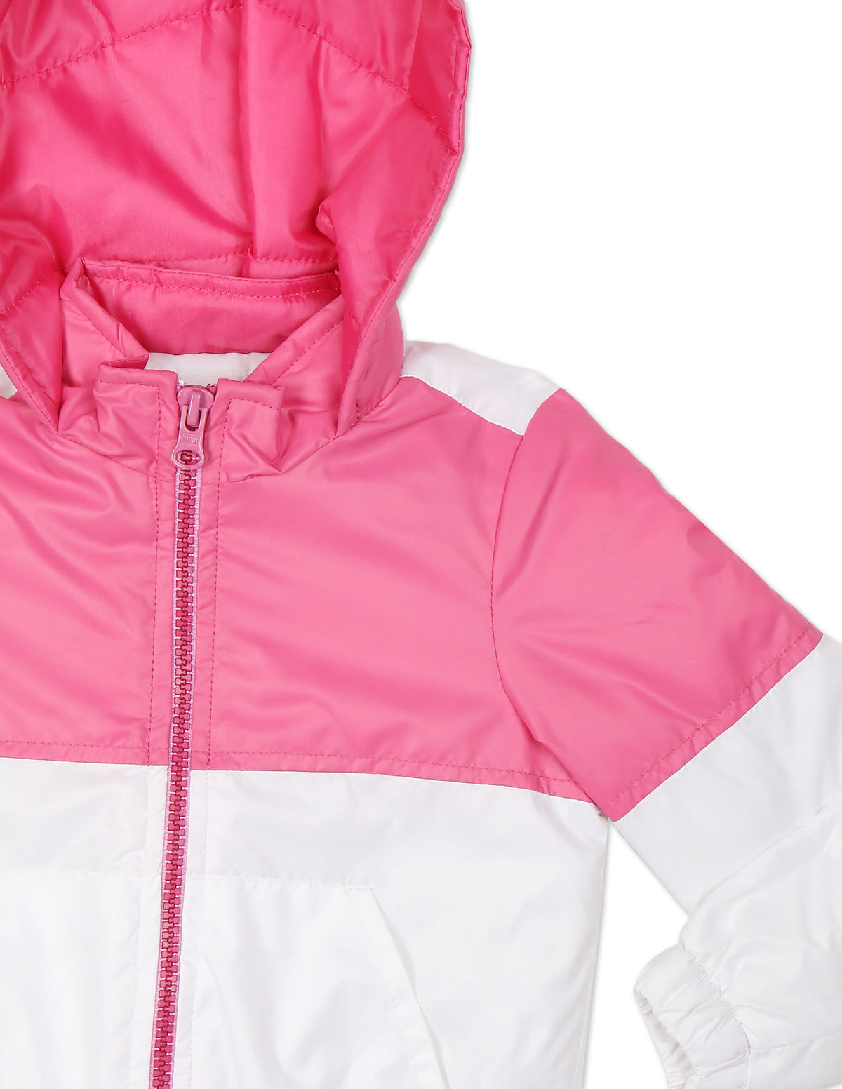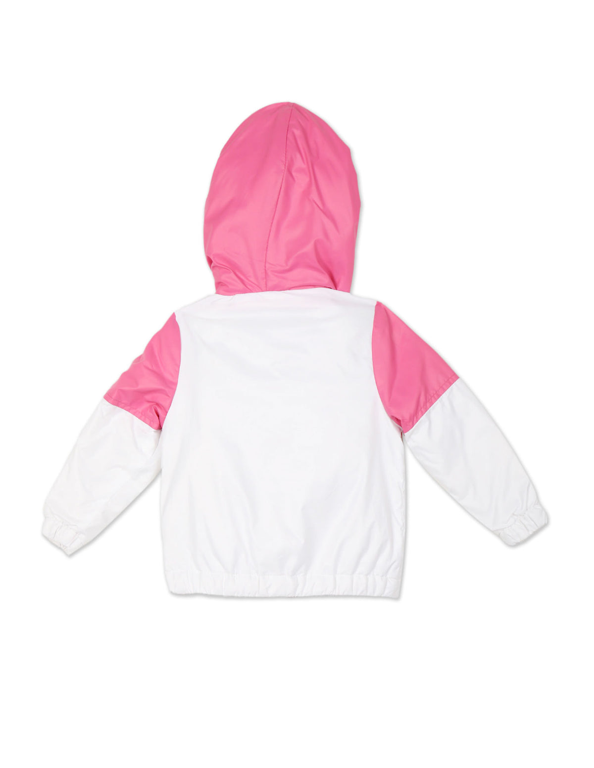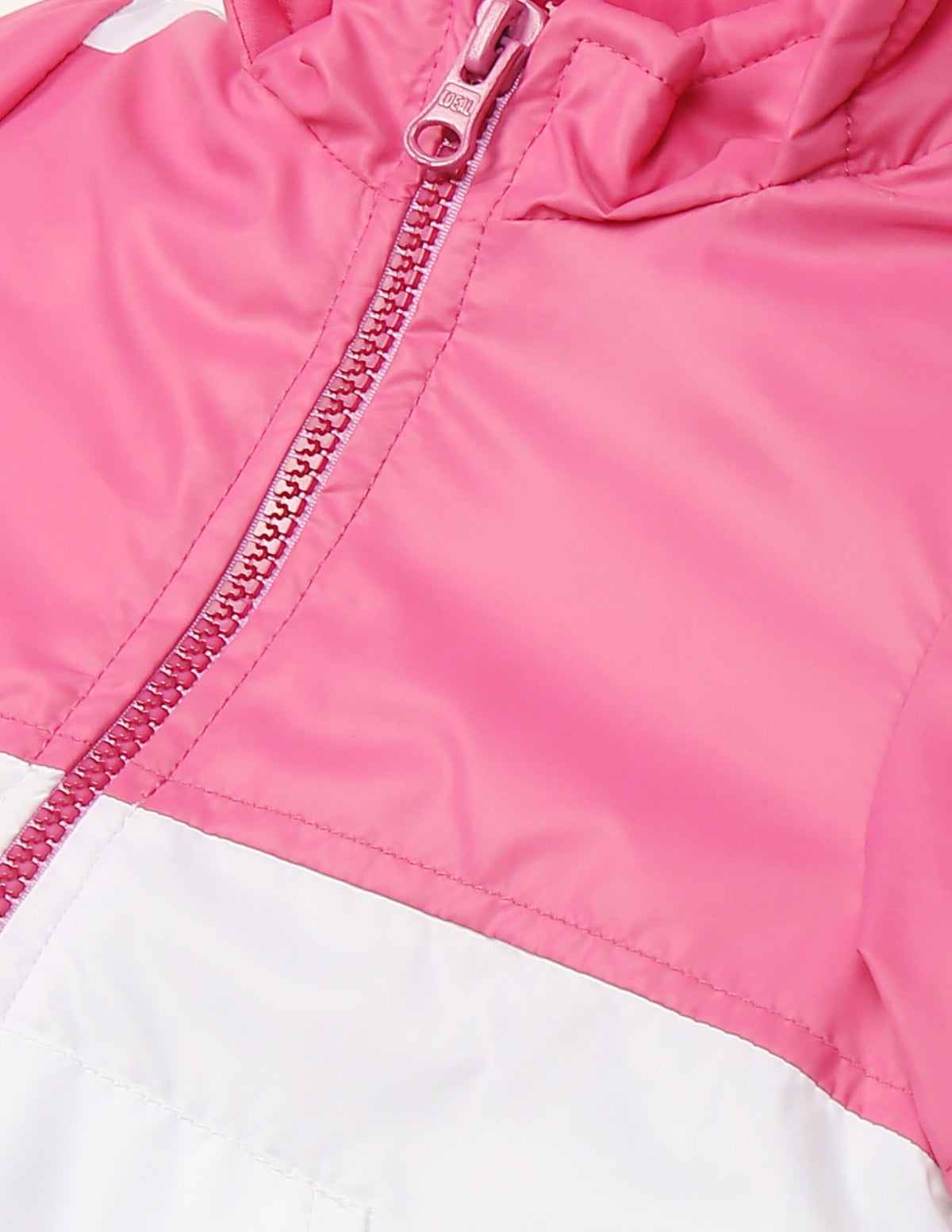 | High neck with attached hood | Full zip-up front | Two pockets | Long sleeves with elasticized hems | Colour blocked