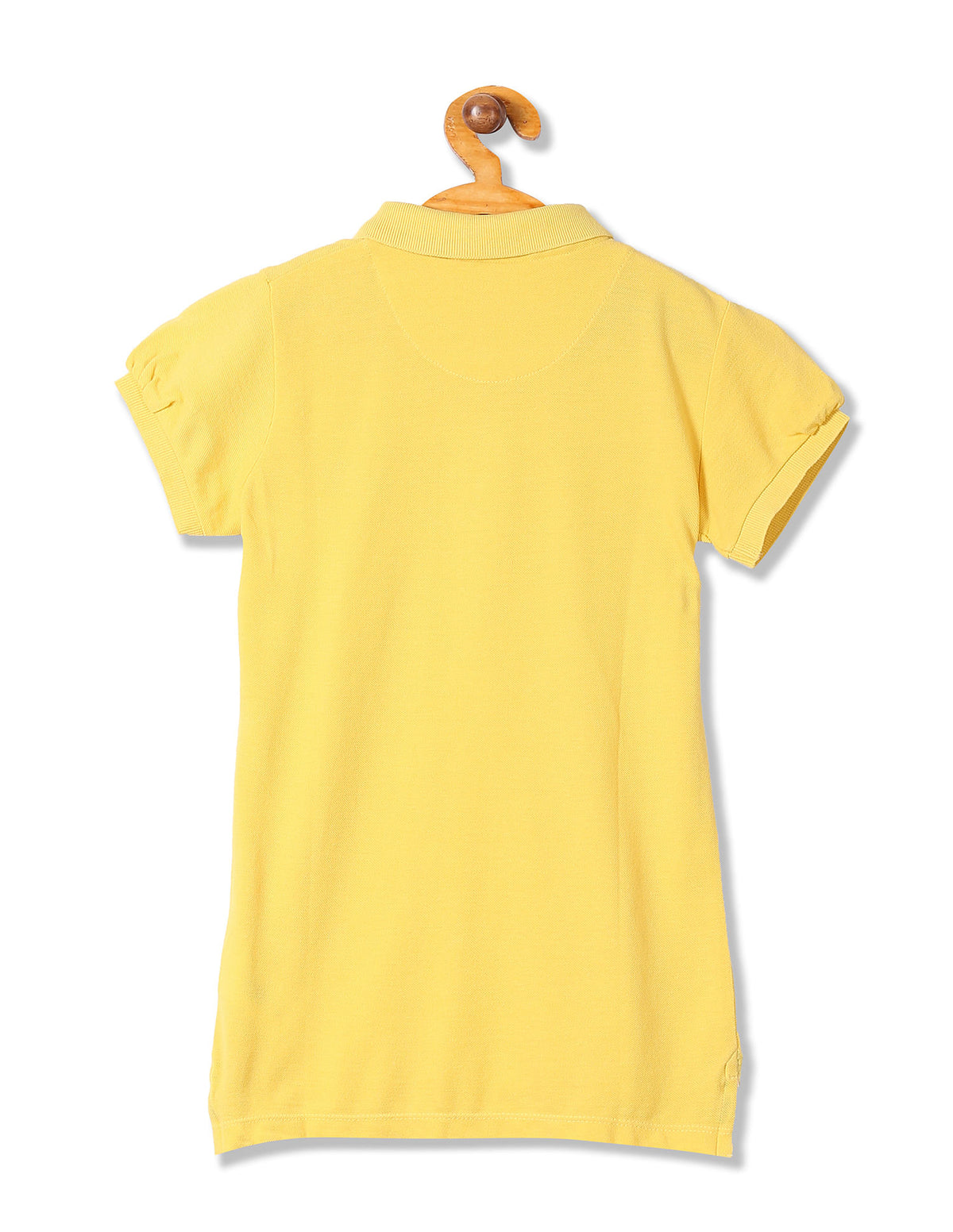 Story: The relaxed hue of this polo shirt from U.S. Polo Assn. is sure to stand out from her casual closet. The conventional design includes a ribbed collar, buttoned placket, short sleeves and an evident logo at the chest for signature style. Have your little diva wear it with a flared skirt and flats.