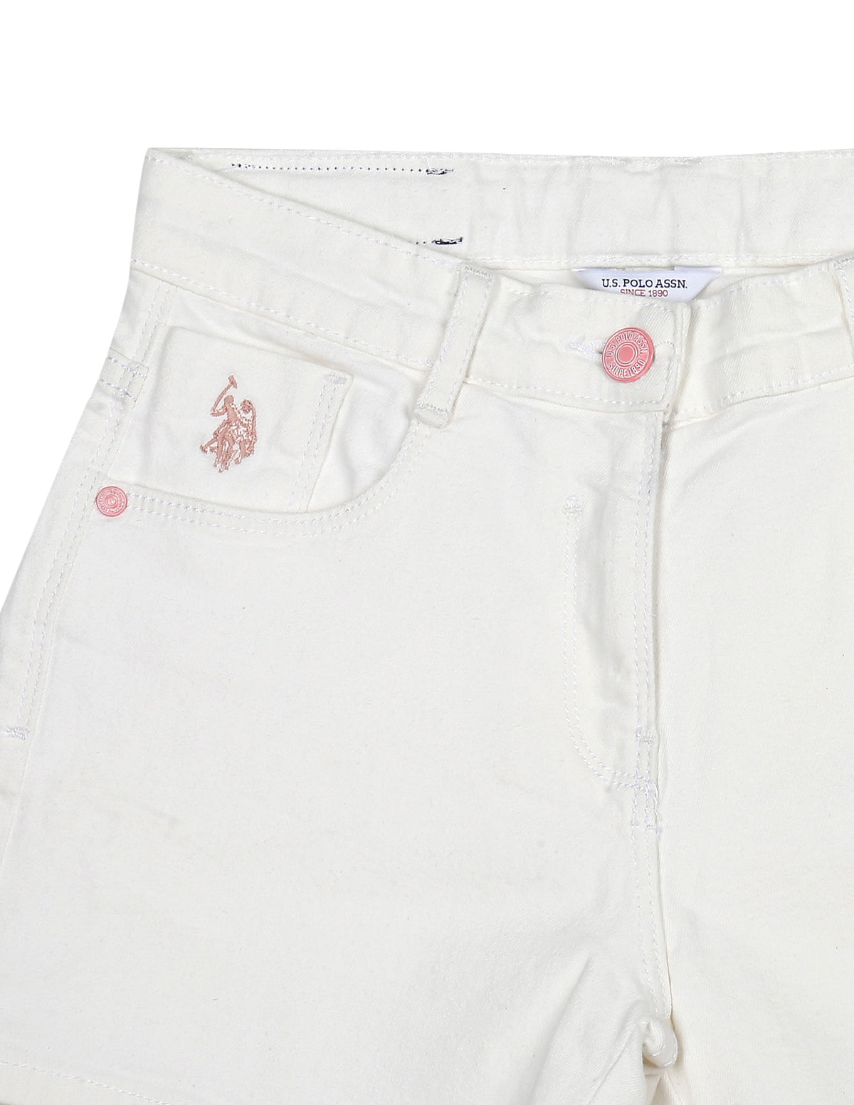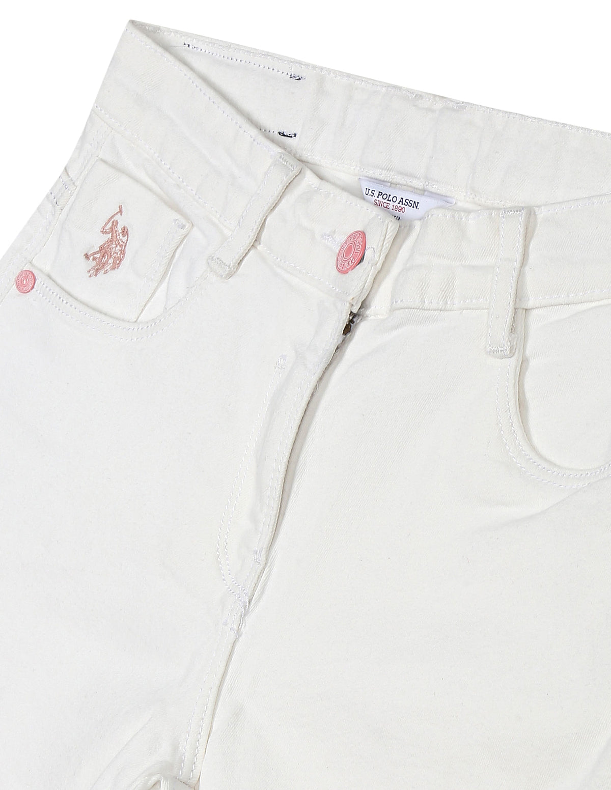 | Mid-rise | Button waist and zip fly | Five-pocket styling | Solid