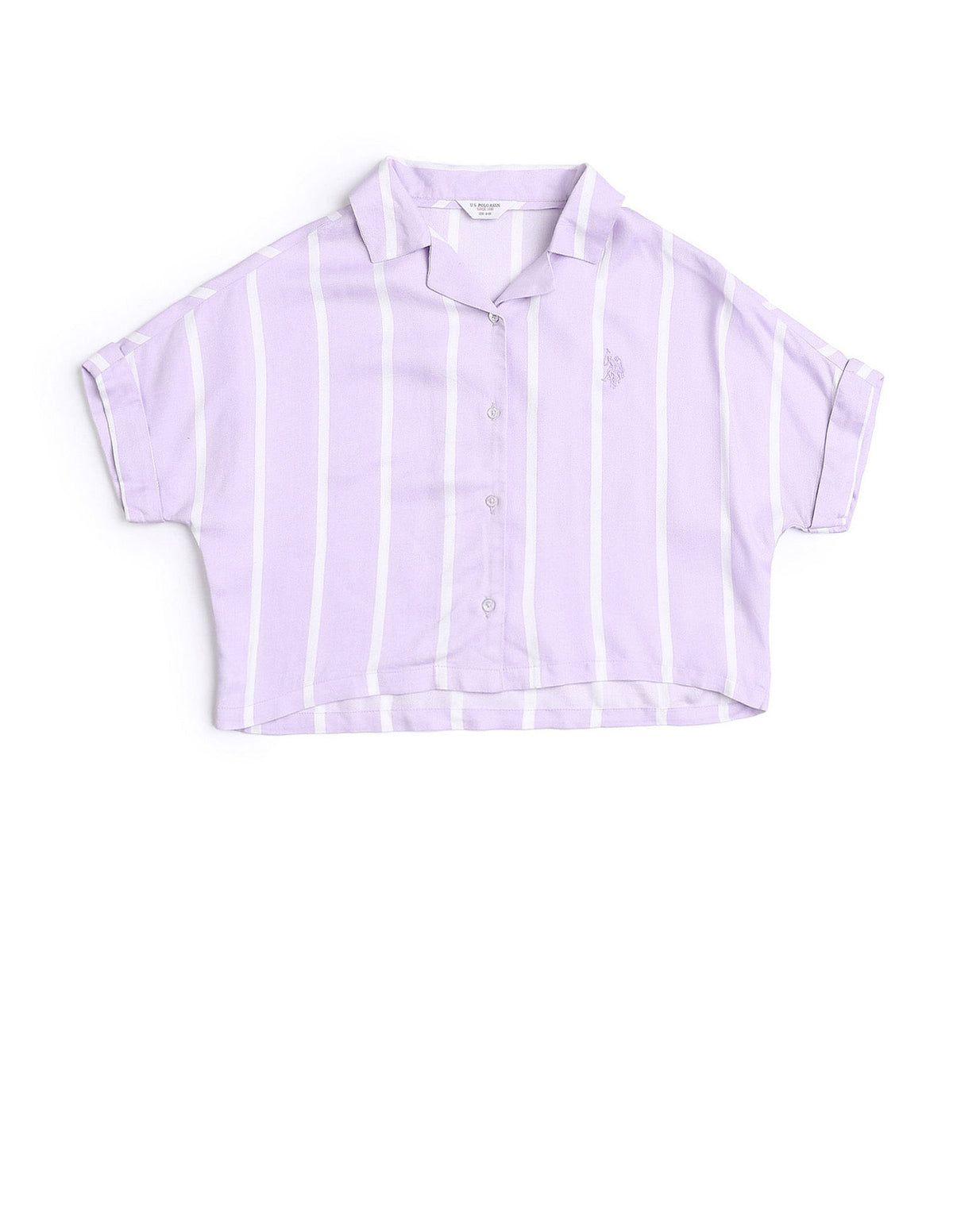 | Top: | Cuban collar | Logo embroidered at chest | Full button placket | Short sleeves | Straight hemline | Vertical striped pattern | Short: | Mid-rise waist | Elasticated waistband | Vertical striped pattern |