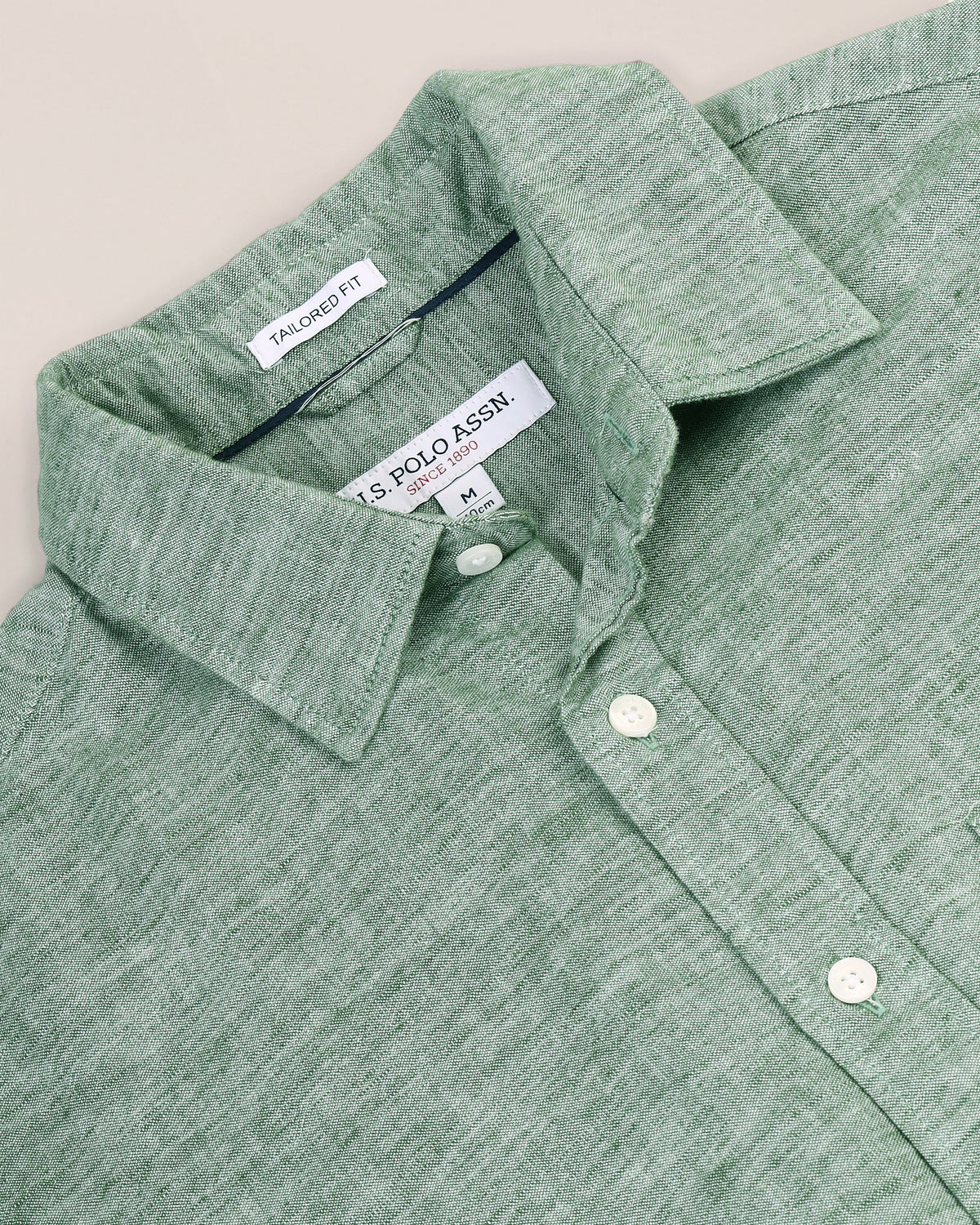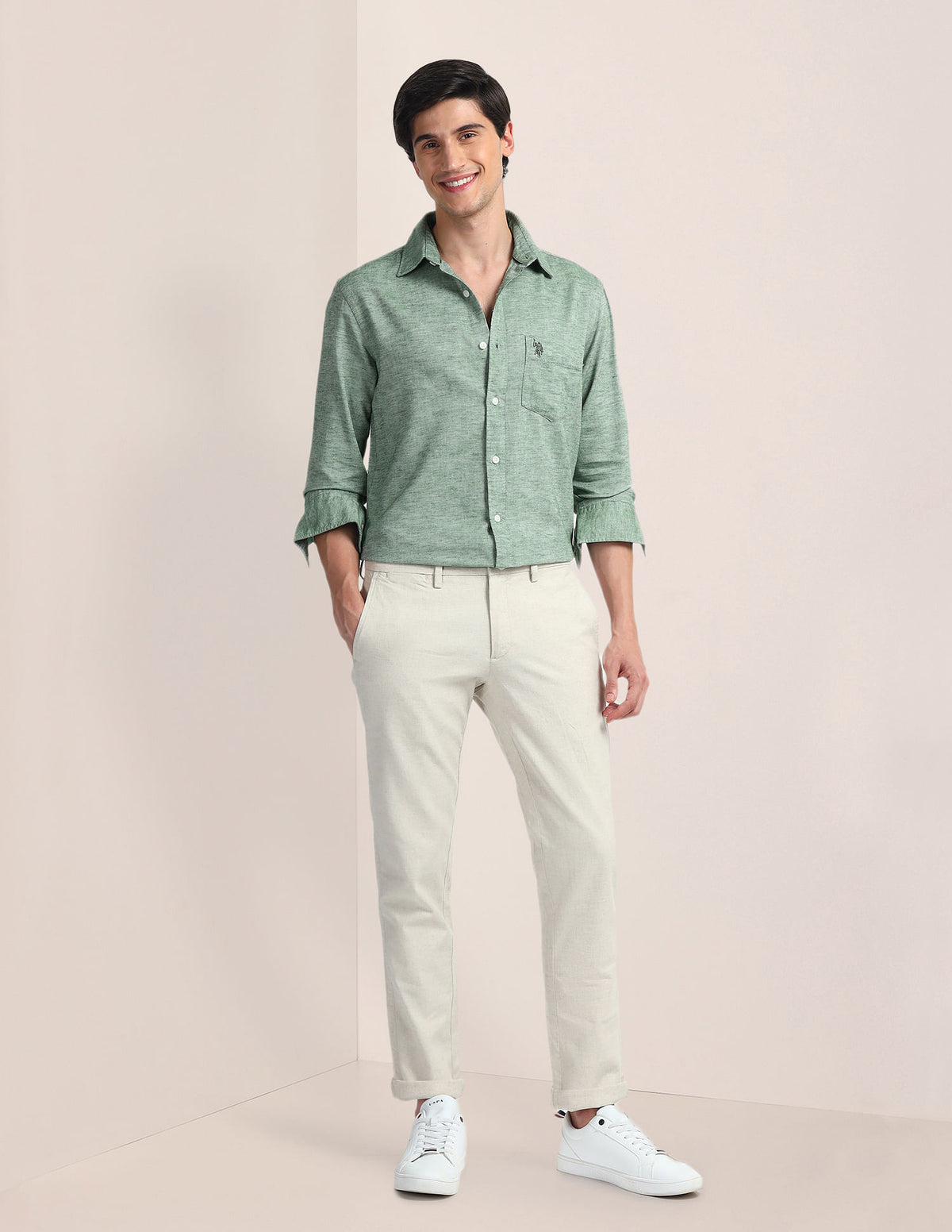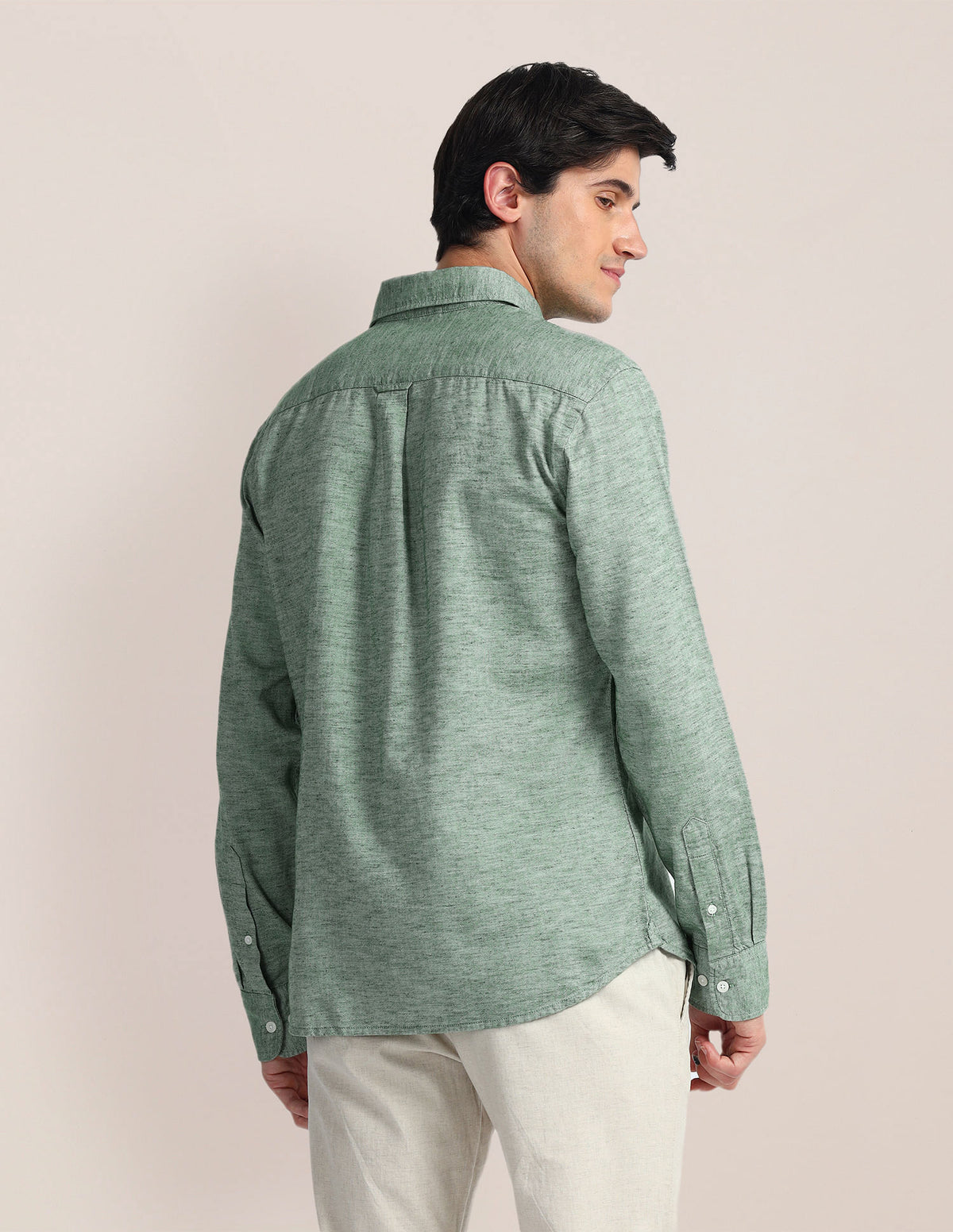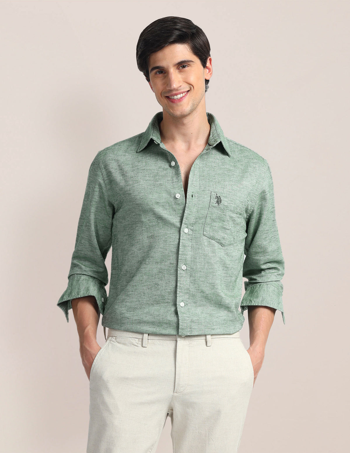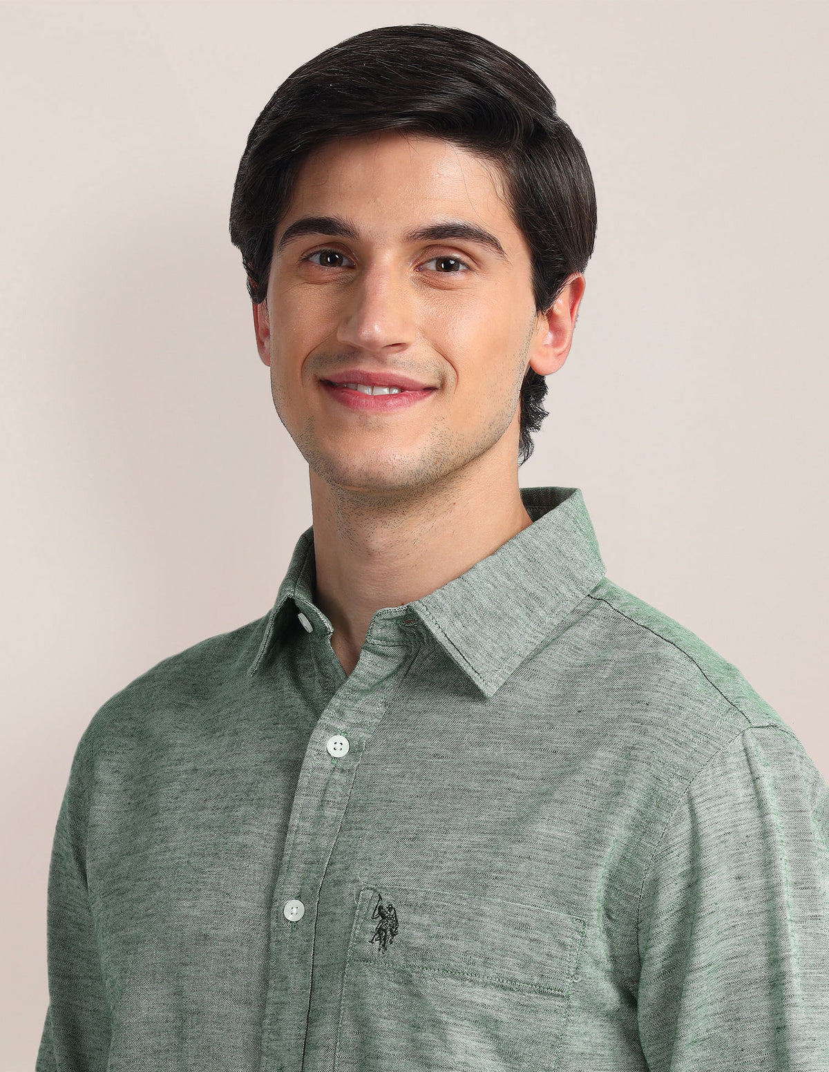 | Semi-cutaway collar | Chest patch pocket | Full button placket | Long sleeves with rounded cuffs | Curved hemline | Heathered pattern | Dobby weave | Brand fit: Tailored fit | Fit mapping: Regular fit | Country Of Origin - India| AW-24