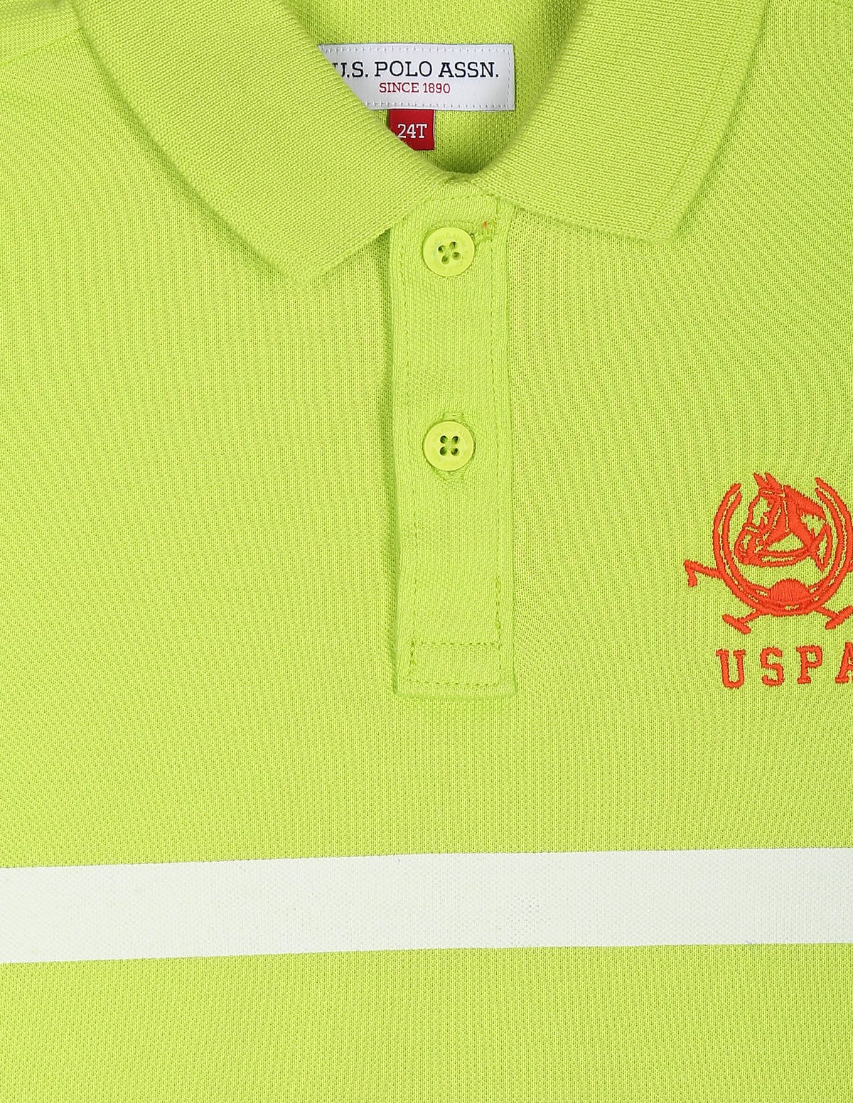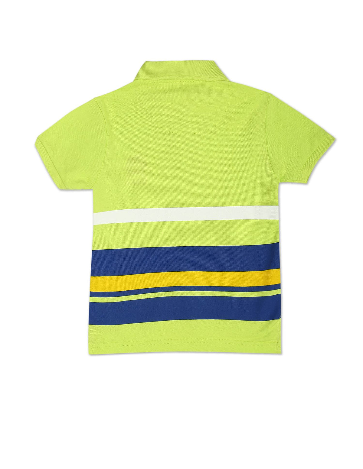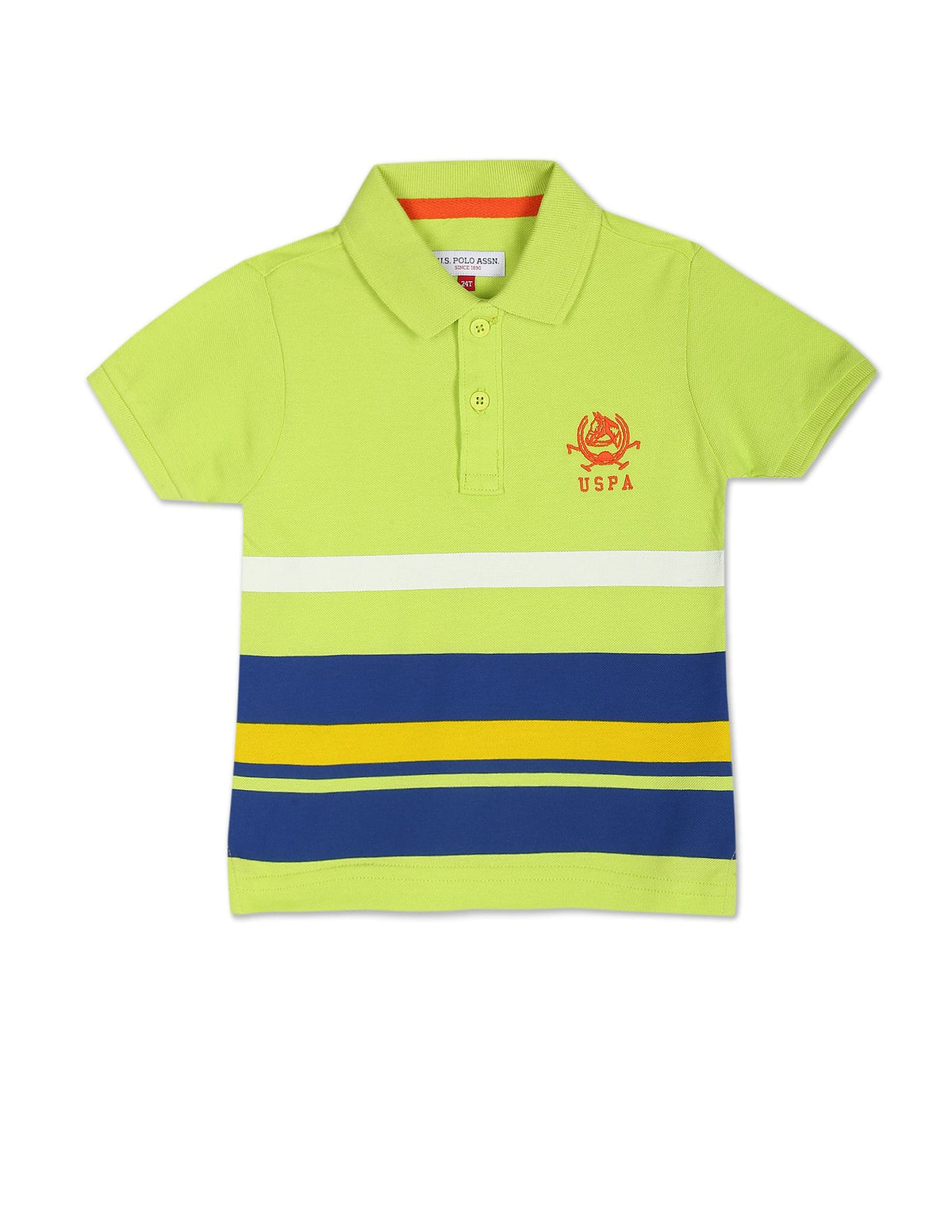 Story: This vibrant polo shirt with a striped pattern is soft, durable and breathable against the skin and features a neat collar and short sleeves.