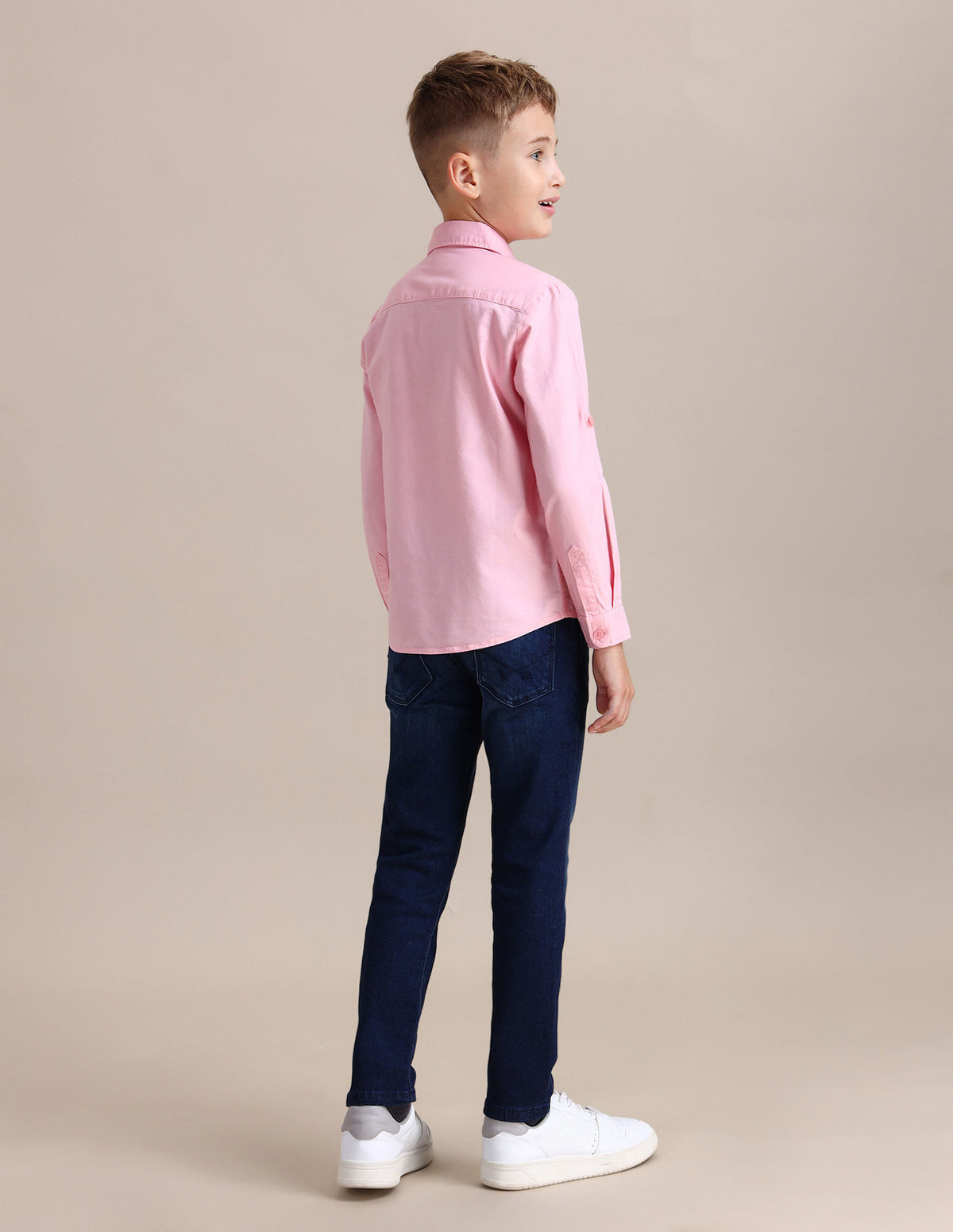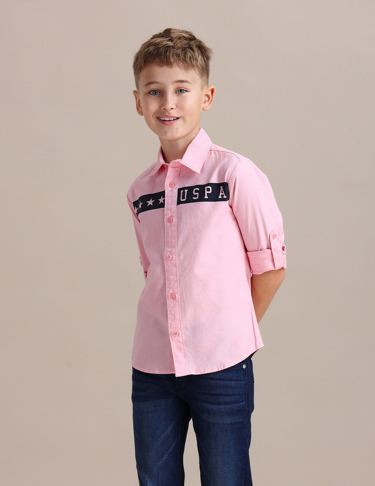 | Spread collar | Full button placket | Long sleeves with rounded cuffs | Curved hemline | Brand printed pattern | Twill weave | Regular fit |