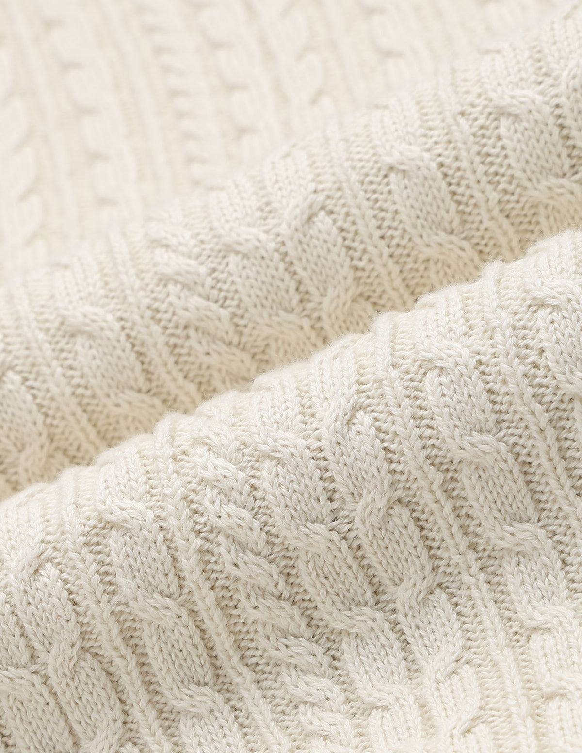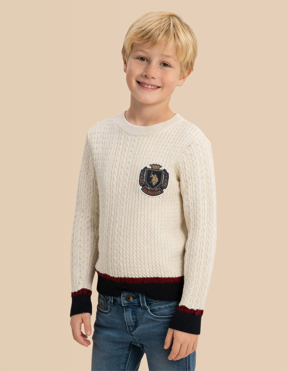 - Cable knit pattern with constrast stripes on sleeve hem and hemline