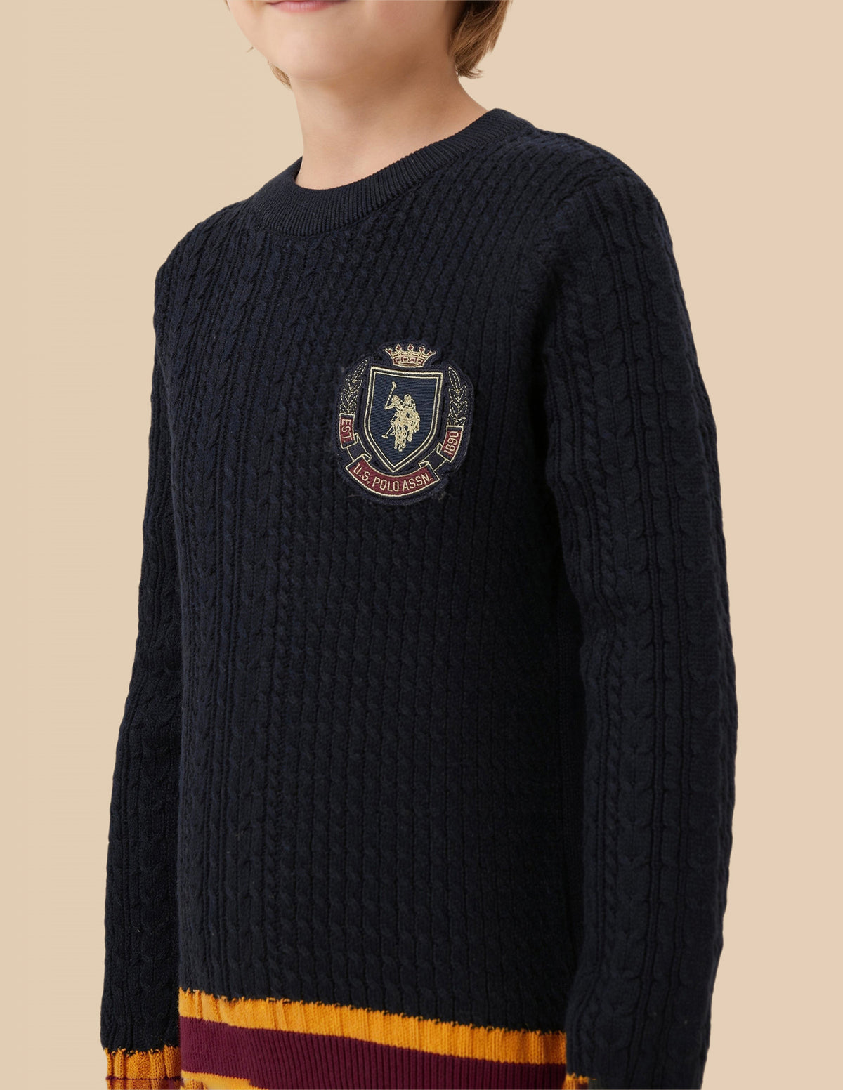 - Cable knit pattern with constrast stripes on sleeve hem and hemline