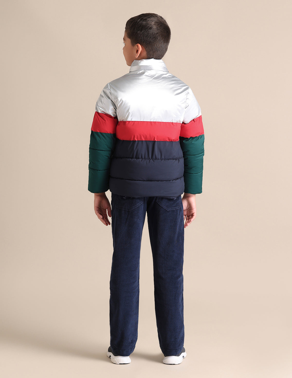 Story: Boys' color-block jacket for casual style, perfect for adding flair to everyday outfits and activities.