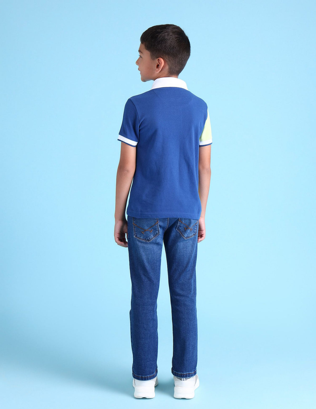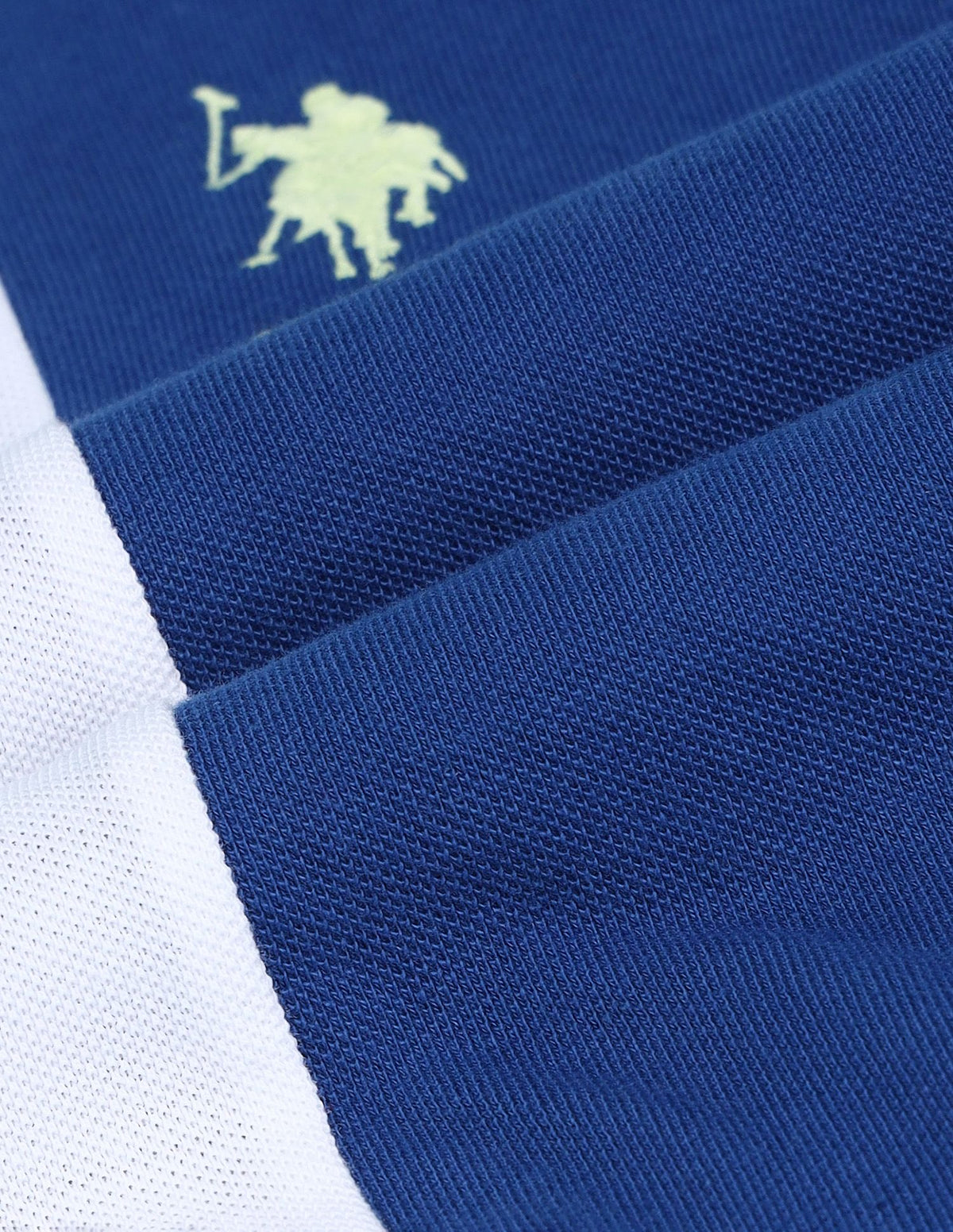 | Polo collar | Short button placket | Short sleeves | Ribbed collar and sleeve hems | Uneven vented hem | Colourblocked pattern | Regular fit |