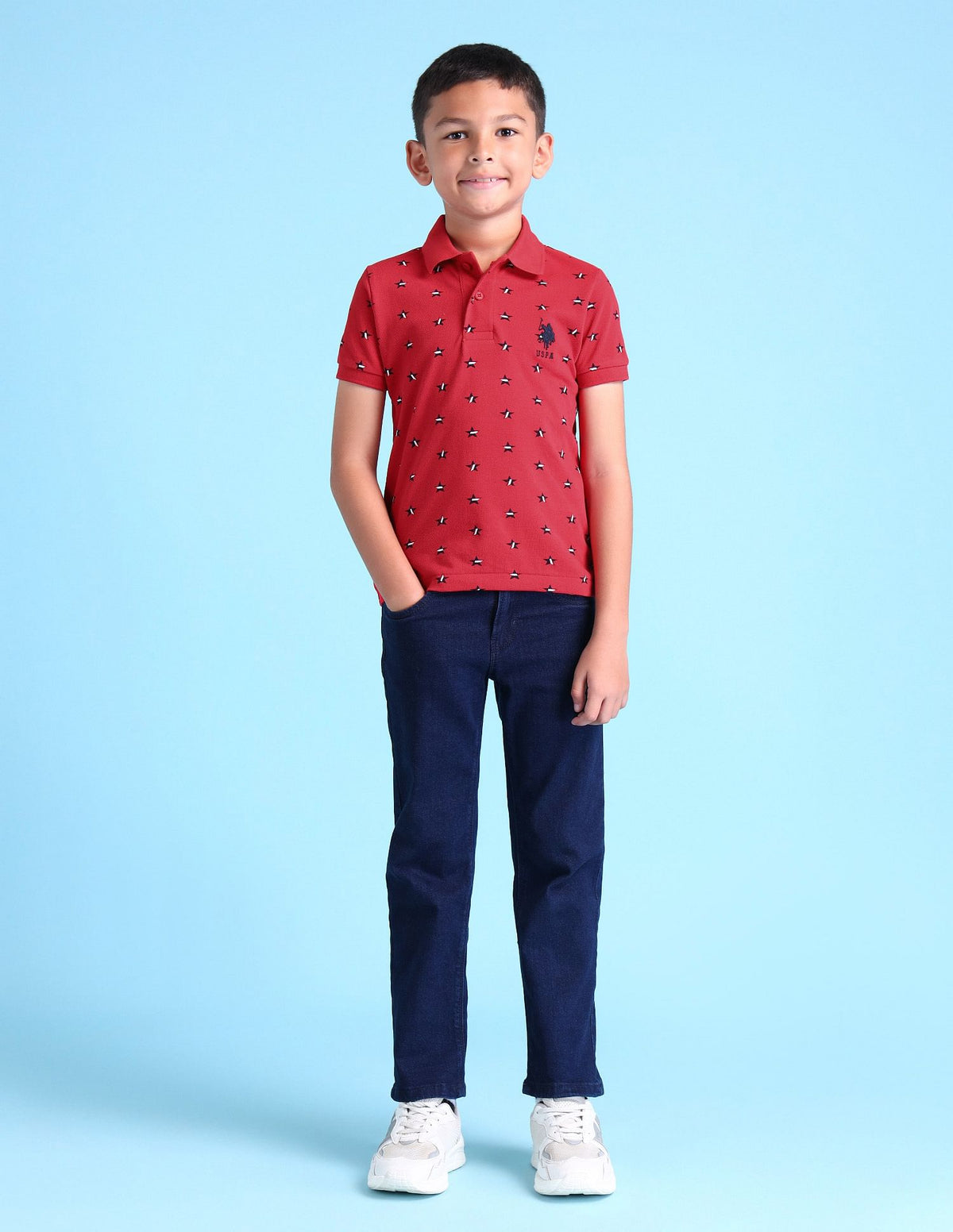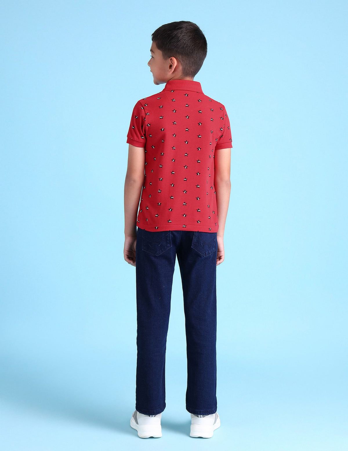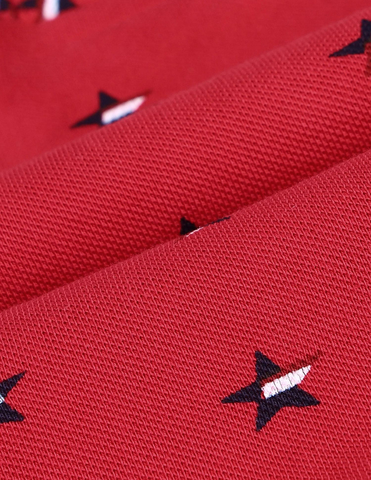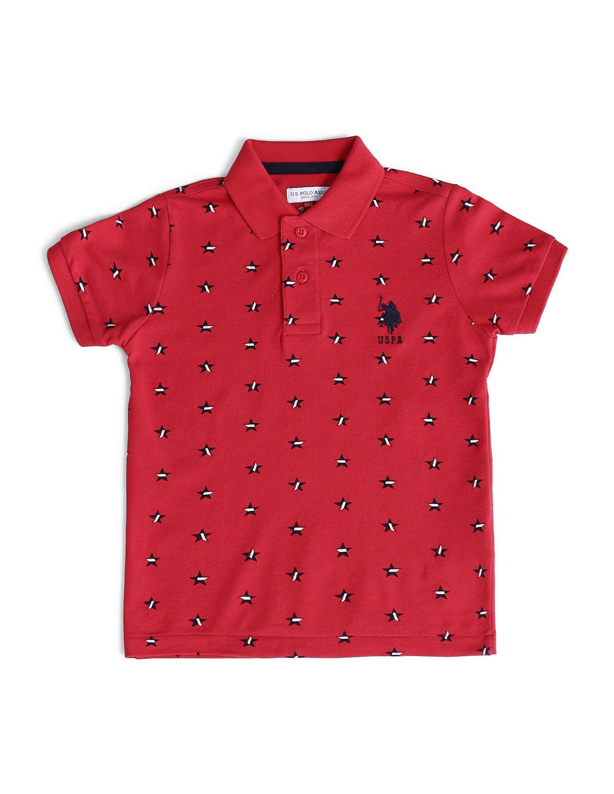 | Polo collar | Short button placket | Short sleeves | Ribbed collar and sleeve hems | Uneven vented hem | Geometric printed pattern | Regular fit |