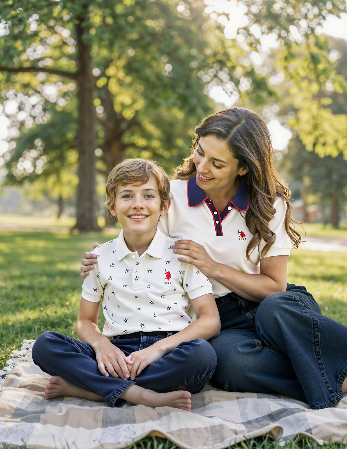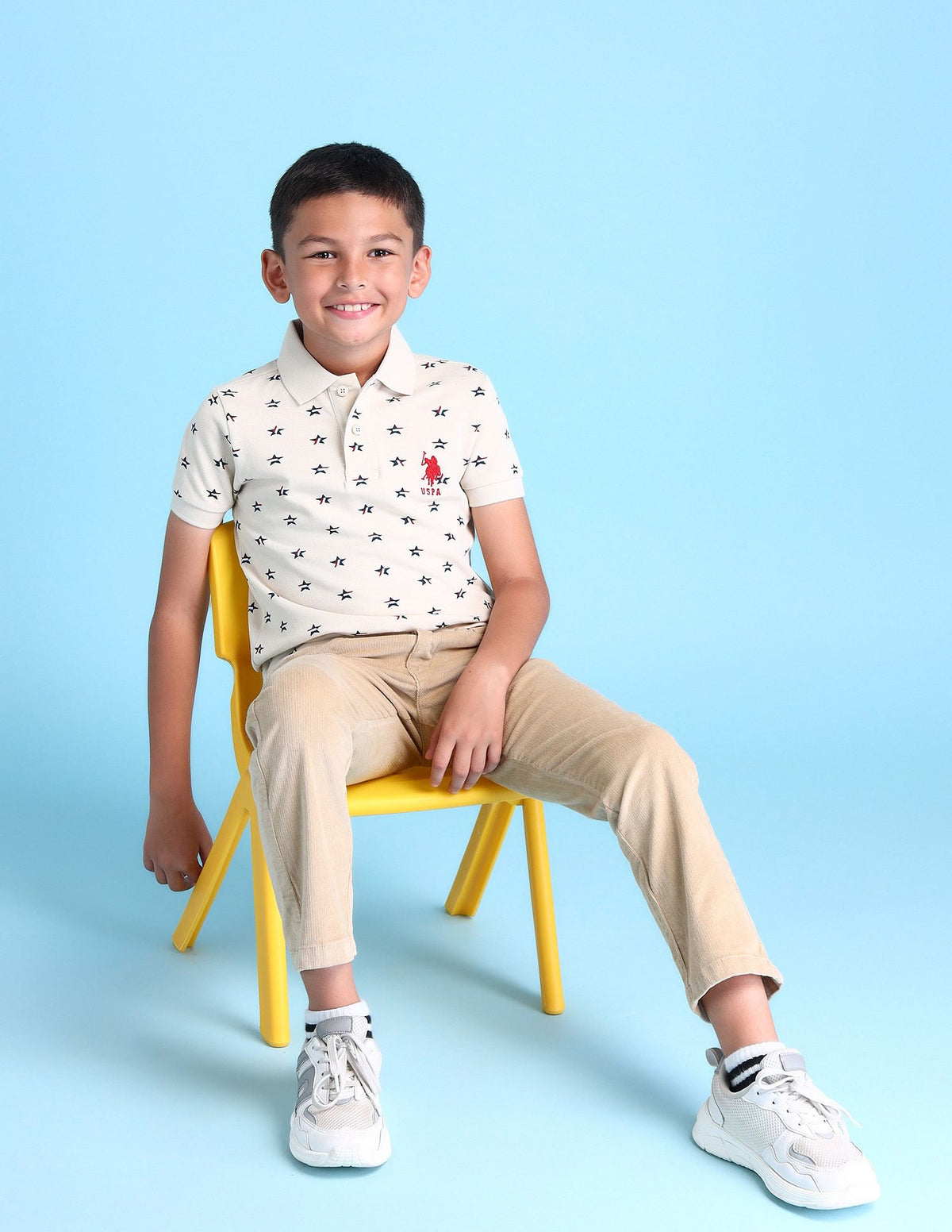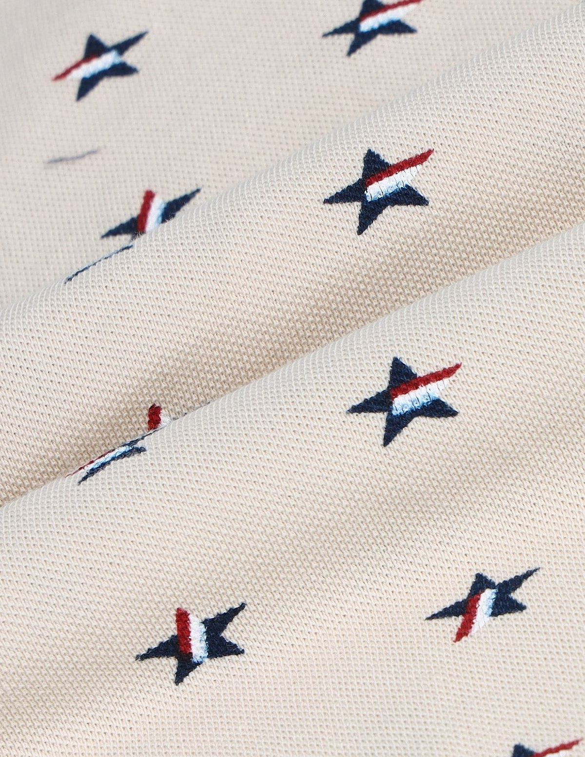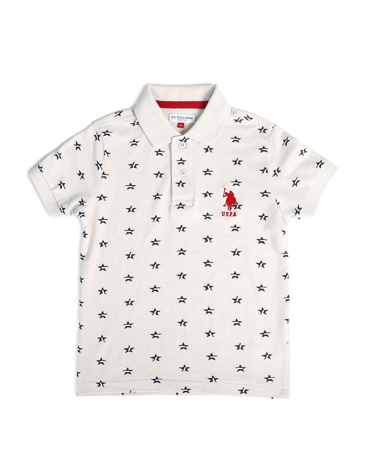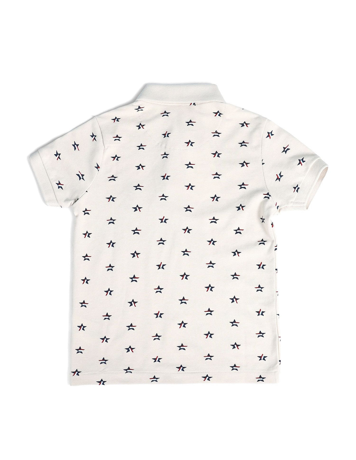 | Polo collar | Short button placket | Short sleeves | Ribbed collar and sleeve hems | Uneven vented hem | Geometric printed pattern | Regular fit |